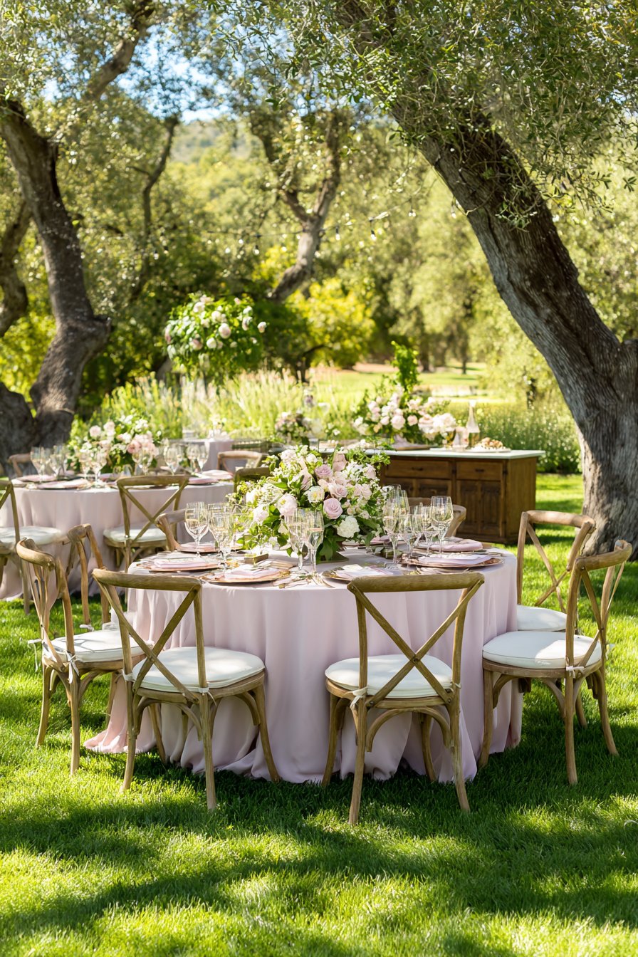 An elegant garden party features a round dining table with floor-length blush linen tablecloth. Bentwood chairs with white cushions encircle the table in symmetrical arrangement. A lush floral centerpiece overflowing with garden roses and peonies creates romantic focal point. Trailing greenery cascades from the arrangement, softening the formal presentation.