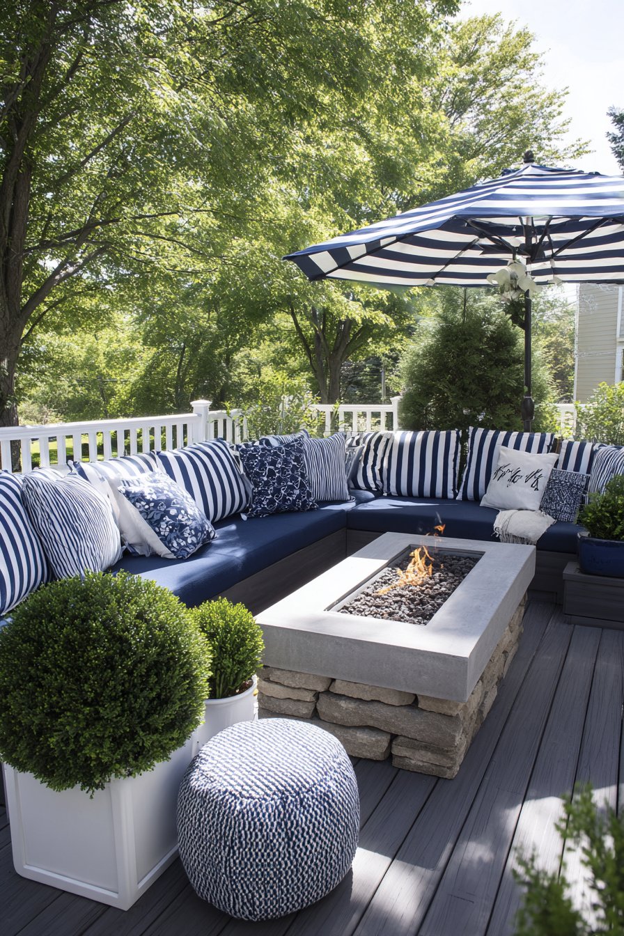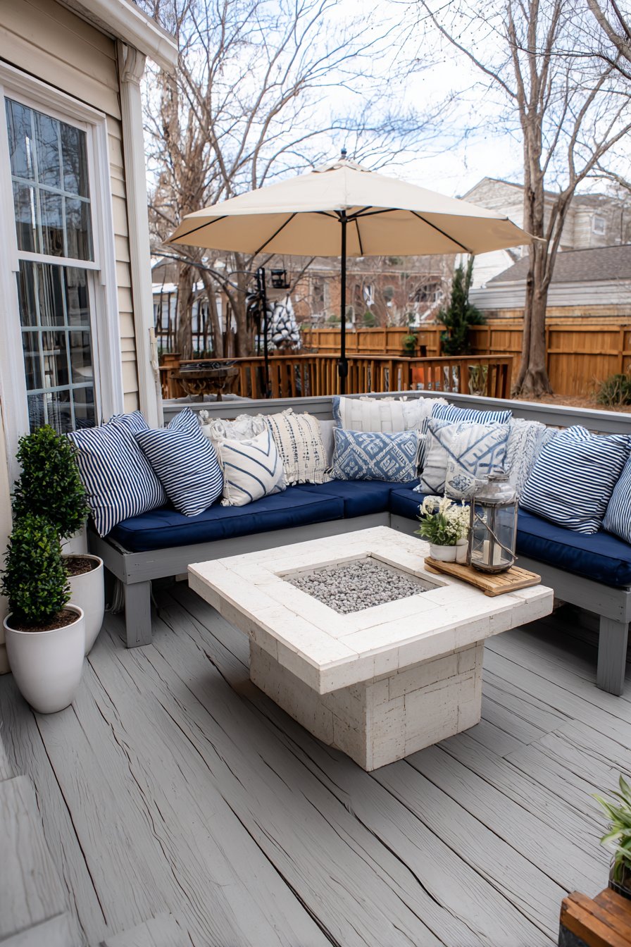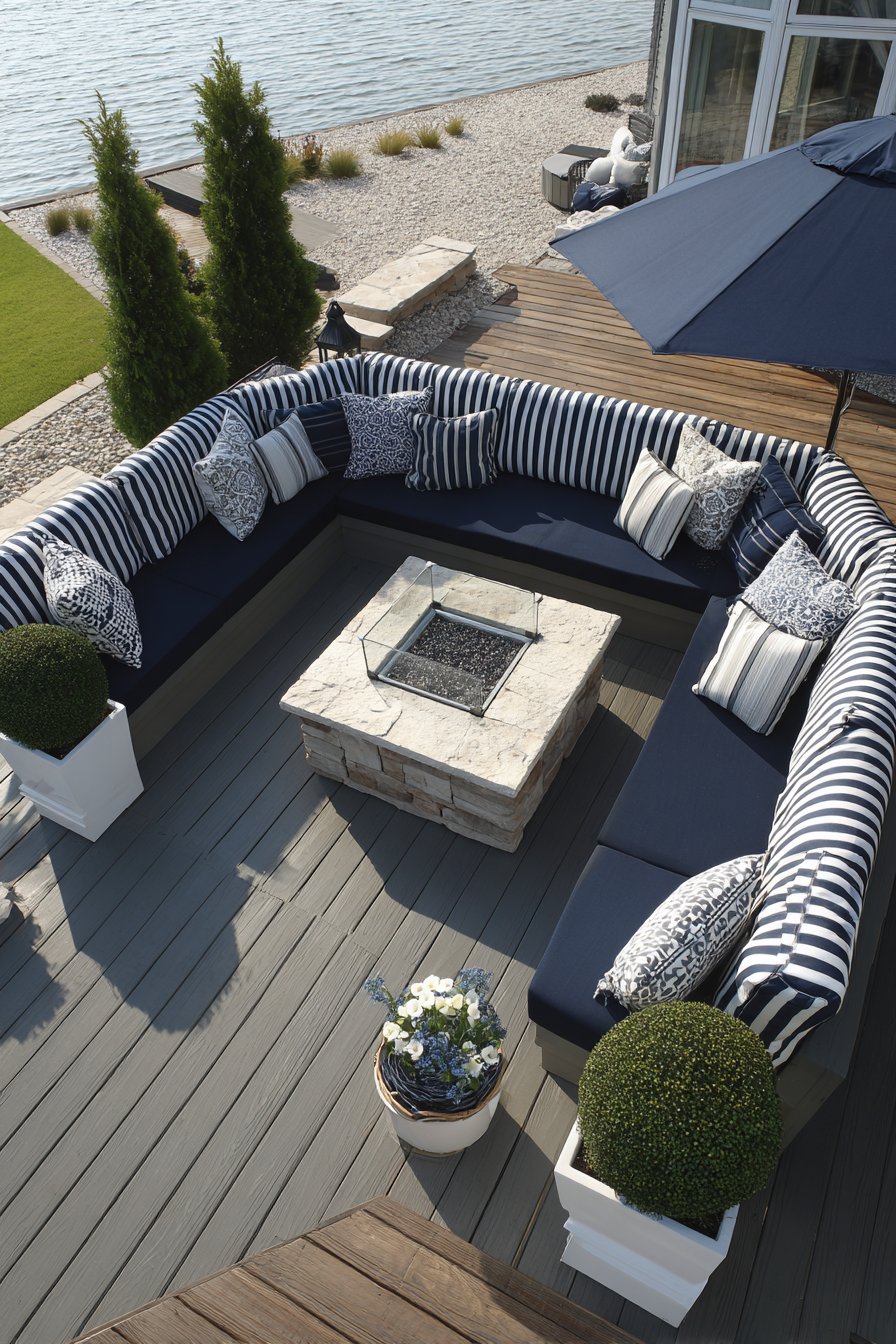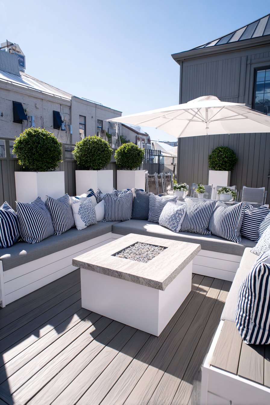 Built-in bench seating with striped navy and white cushions creates permanent deck party solutions. The L-shaped sectional arrangement maximizes available square footage efficiently. A rectangular fire table with natural stone surround becomes the conversation focal point. The composite deck flooring in warm grey provides neutral backdrop for layered decor.