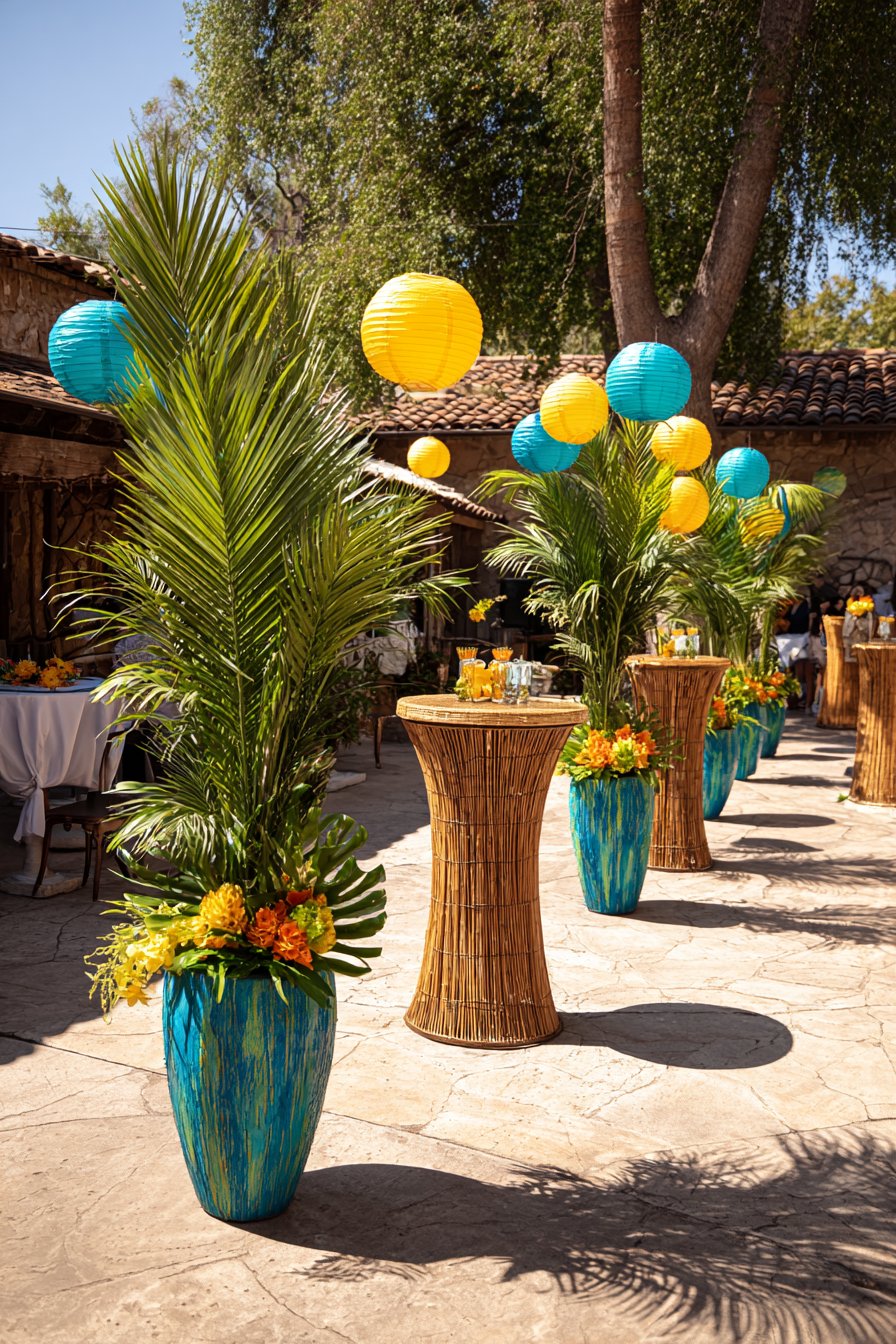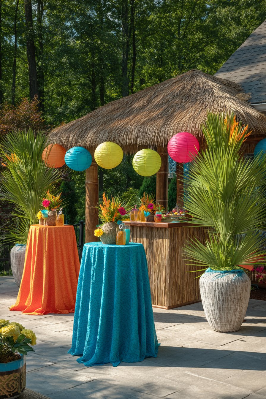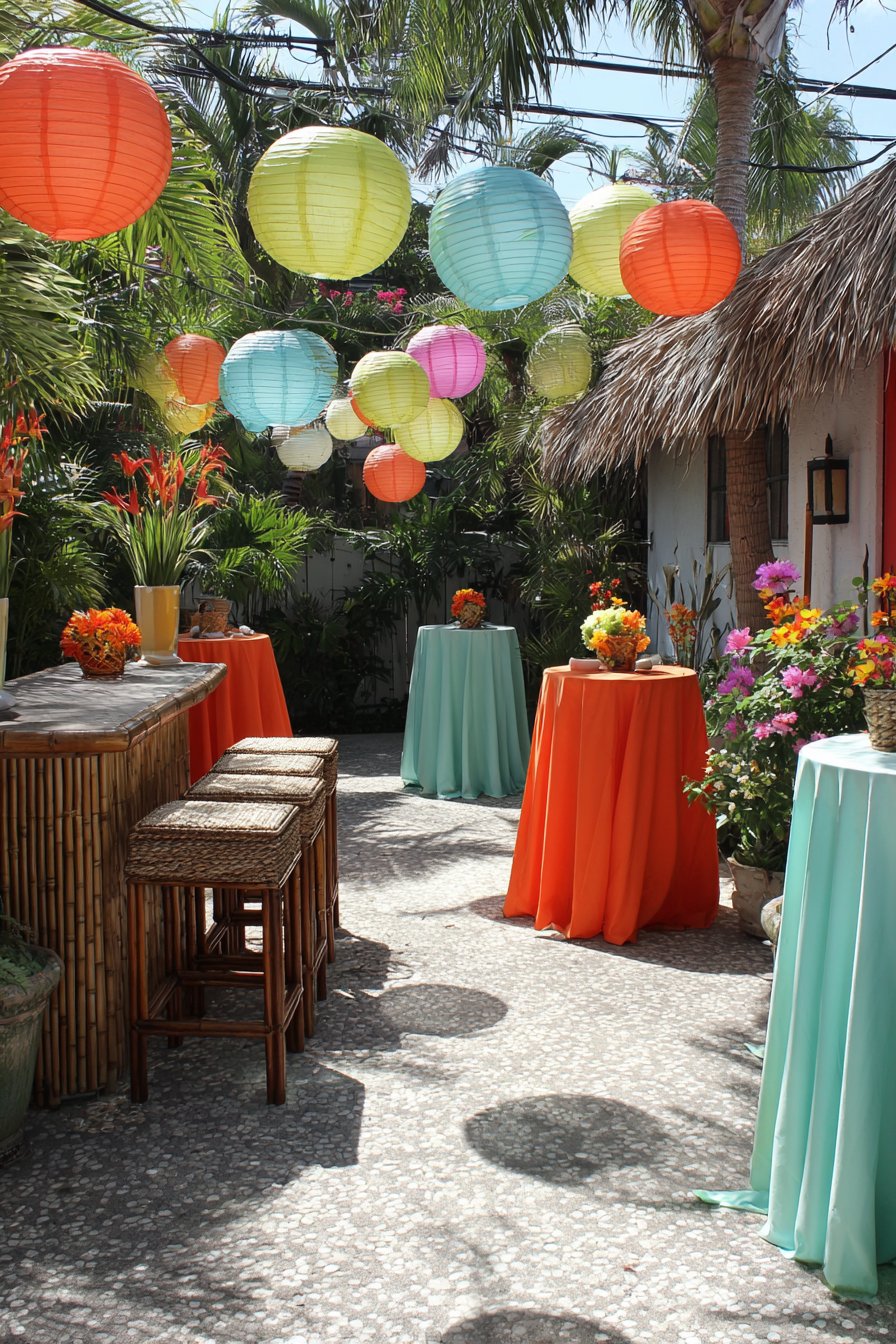 Colorful paper lanterns in coral, turquoise, and yellow hang at varying heights. Shepherd’s hooks positioned throughout the space support the suspended decorations. A tiki bar constructed from natural bamboo with thatched palm roof serves tropical beverages. High-top tables with woven rattan bar stools create standing gathering spaces.
