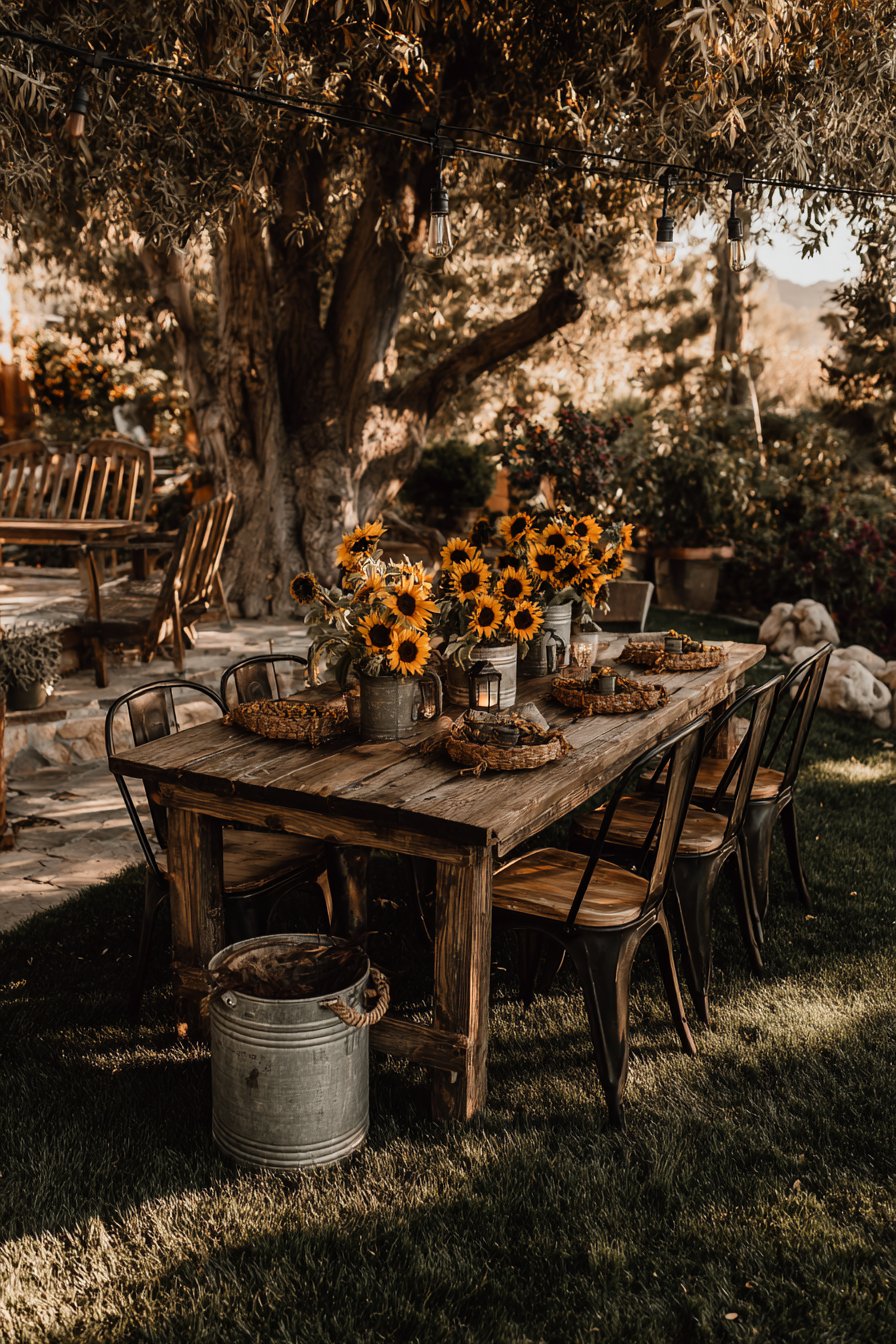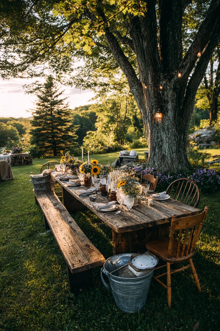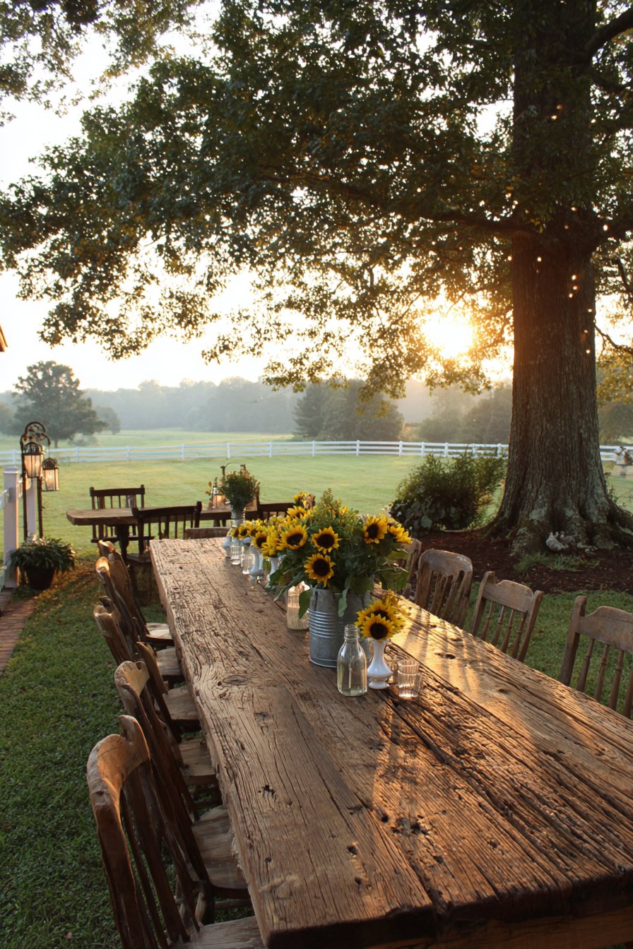 A repurposed wooden farm table with visible aged patina anchors farmhouse outdoor party area. The natural wood grain tells stories of previous use and authentic aging. Mismatched wooden chairs and a church pew provide eclectic seating with character. Galvanized metal buckets filled with fresh sunflowers and wildflowers create cheerful centerpieces.