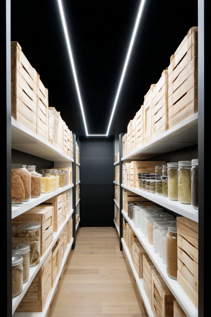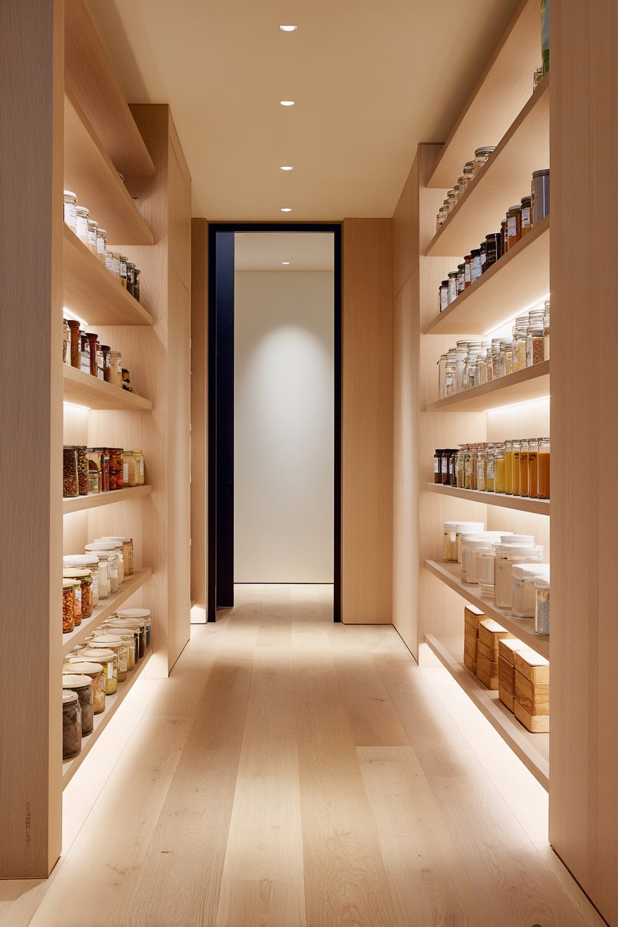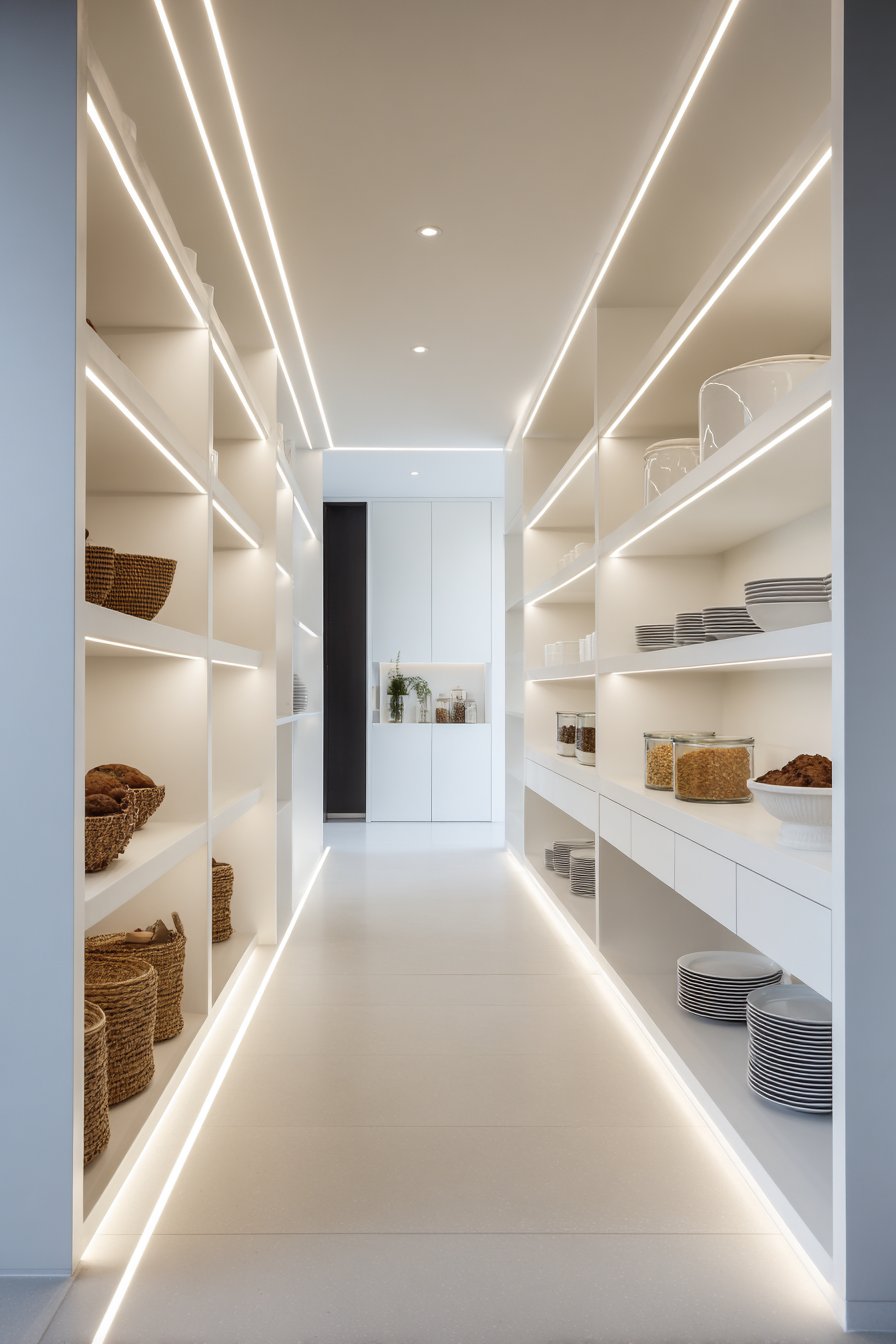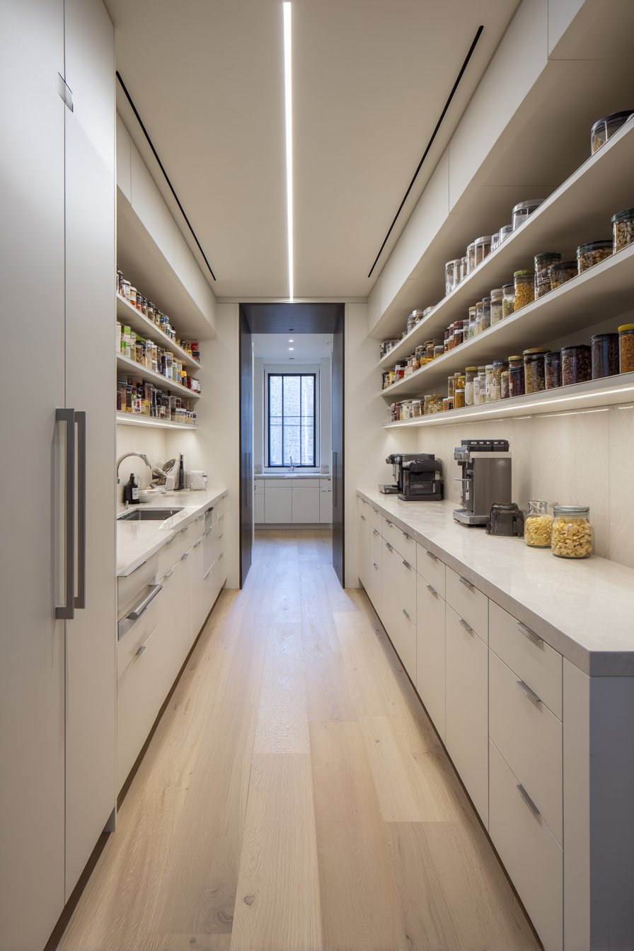 Galley-style pantry corridors benefit from continuous linear LED lighting systems. Low-profile LED strips in aluminum channels with frosted diffusers run ceiling lengths. The uniform illumination lights both sides of narrow spaces effectively. White built-in cabinetry and light oak shelving maximize brightness from efficient lighting.