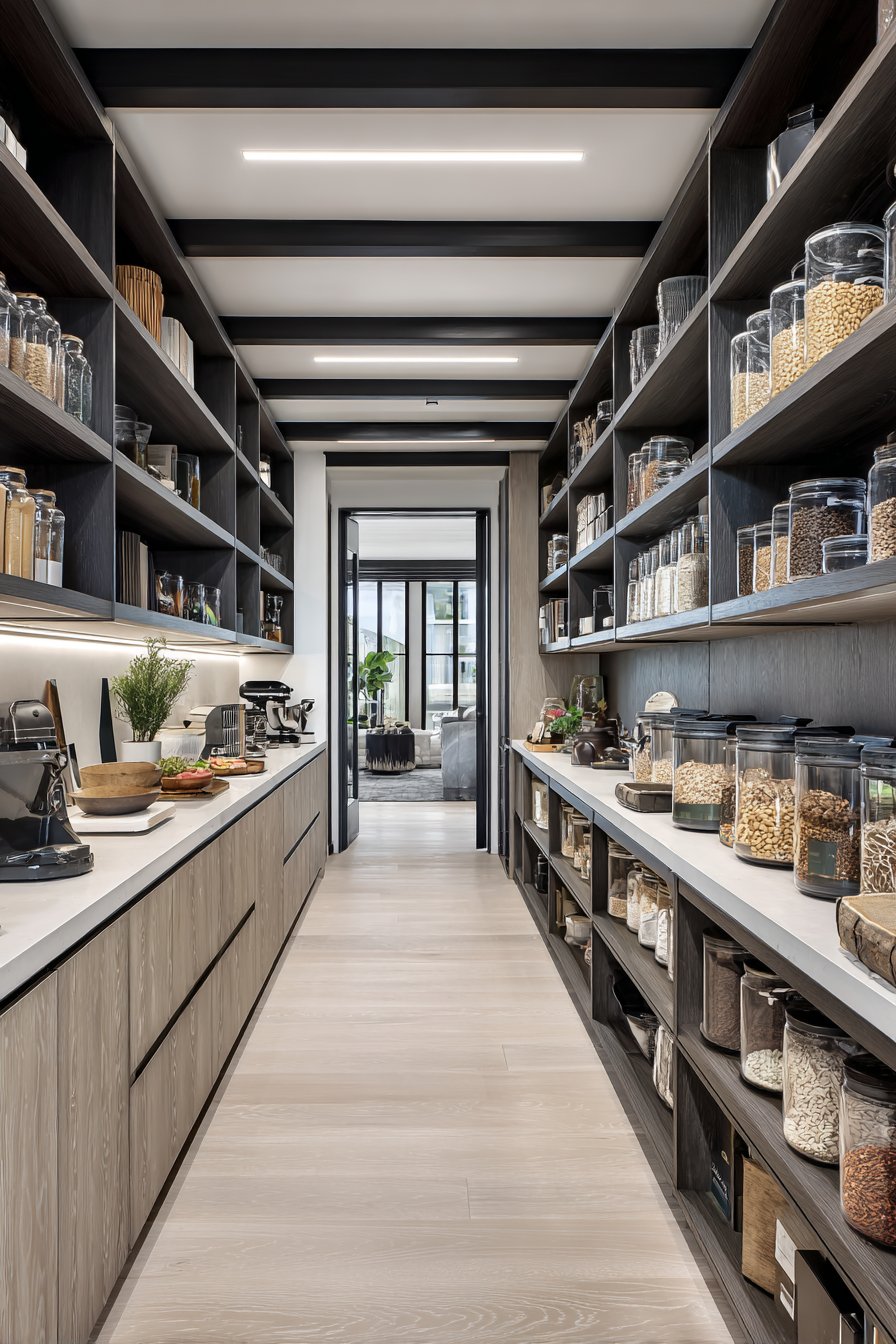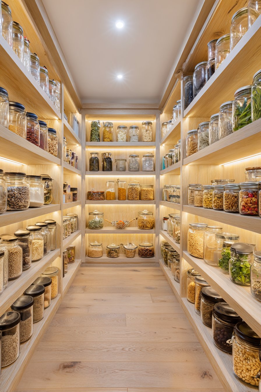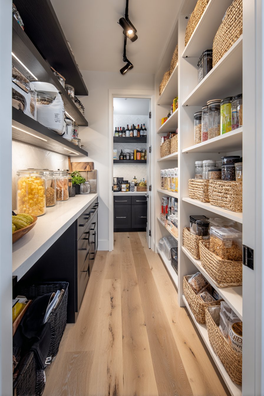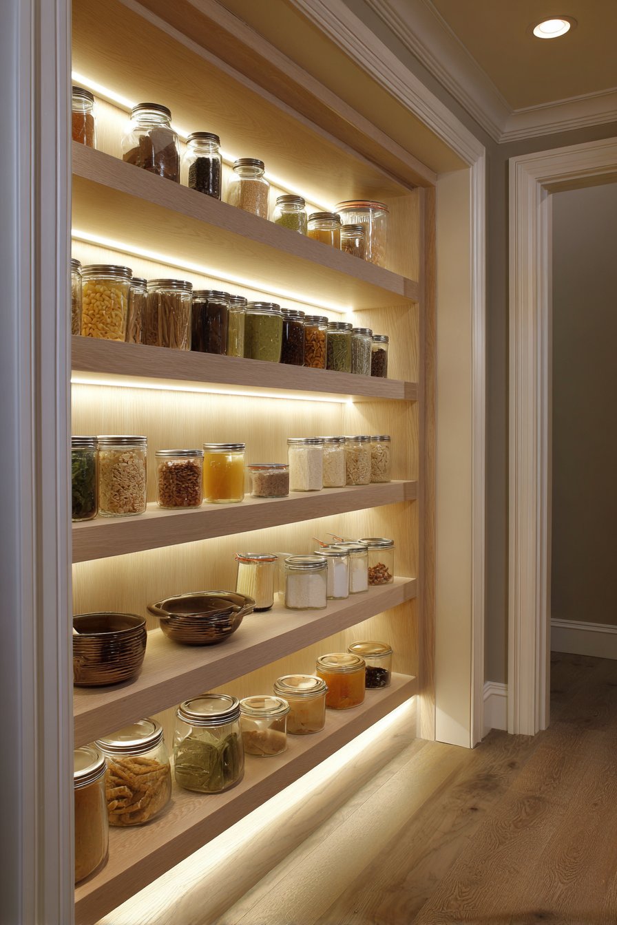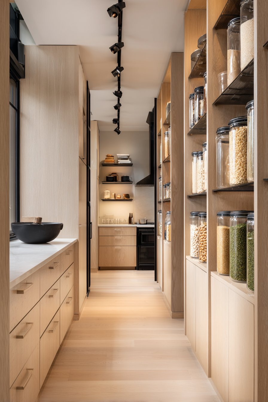 Galley-style pantry corridors benefit from continuous linear LED lighting systems. Low-profile LED strips in aluminum channels with frosted diffusers run ceiling lengths. The uniform illumination lights both sides of narrow spaces effectively. White built-in cabinetry and light oak shelving maximize brightness from efficient lighting.