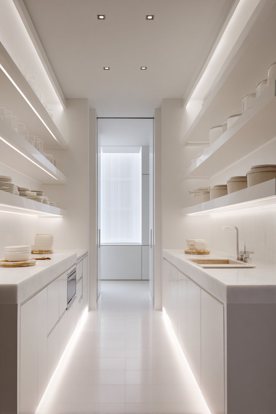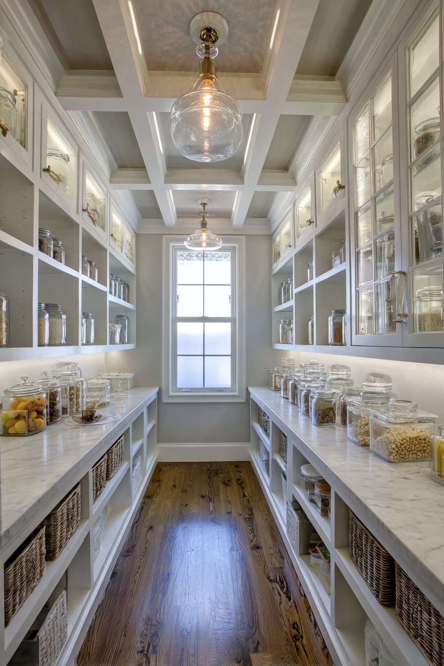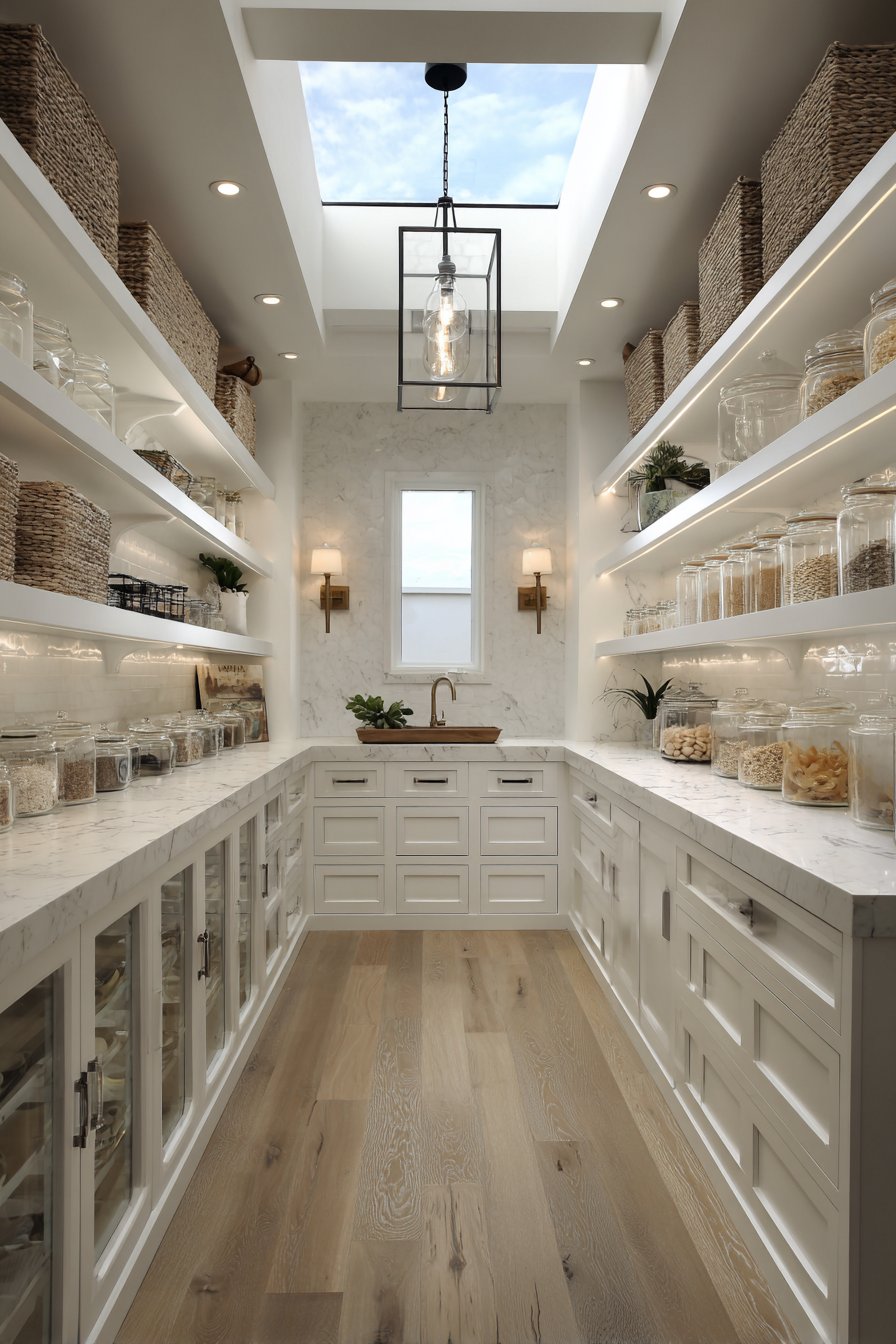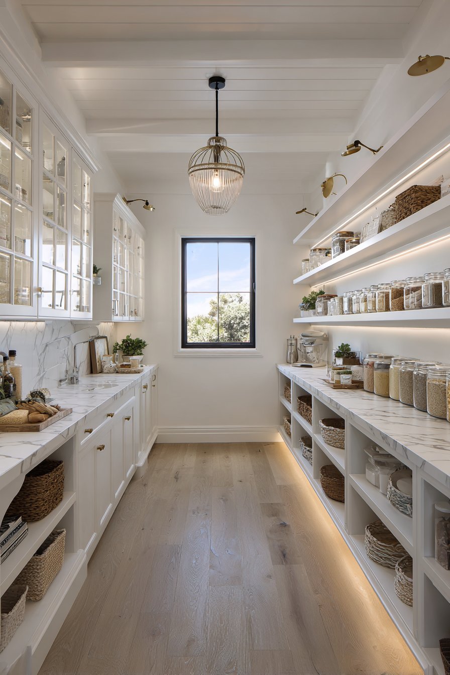 Galley-style pantry corridors benefit from continuous linear LED lighting systems. Low-profile LED strips in aluminum channels with frosted diffusers run ceiling lengths. The uniform illumination lights both sides of narrow spaces effectively. White built-in cabinetry and light oak shelving maximize brightness from efficient lighting.