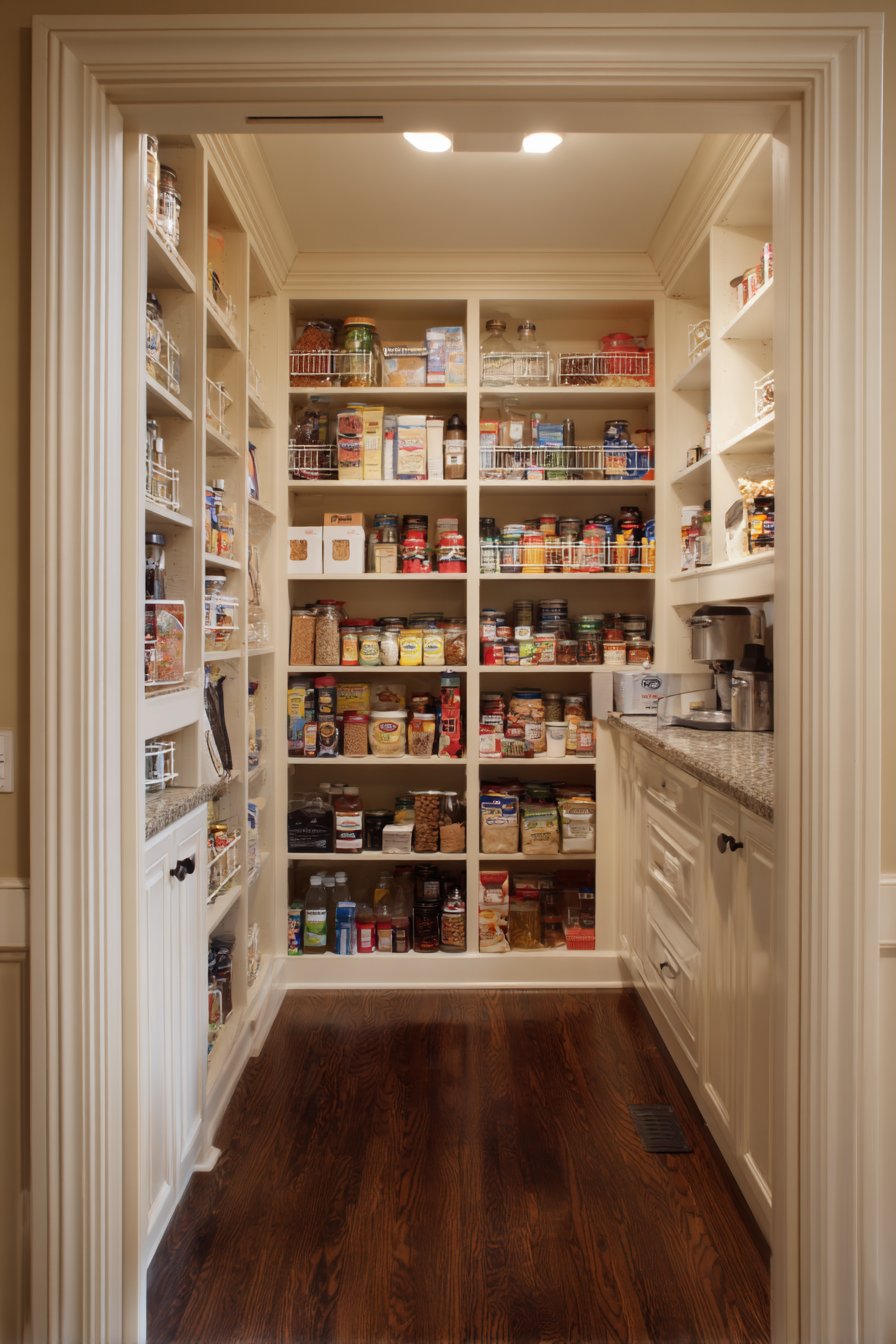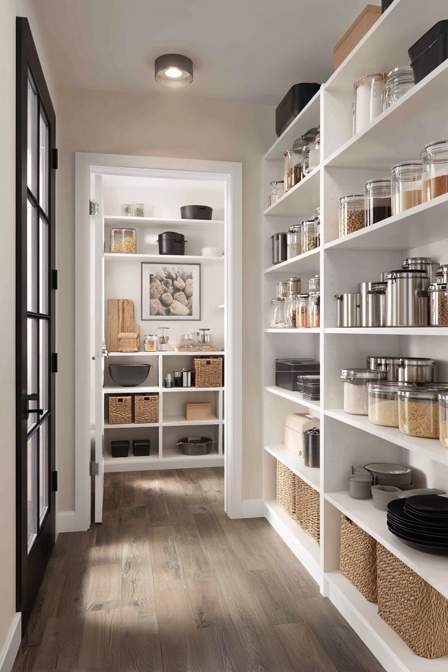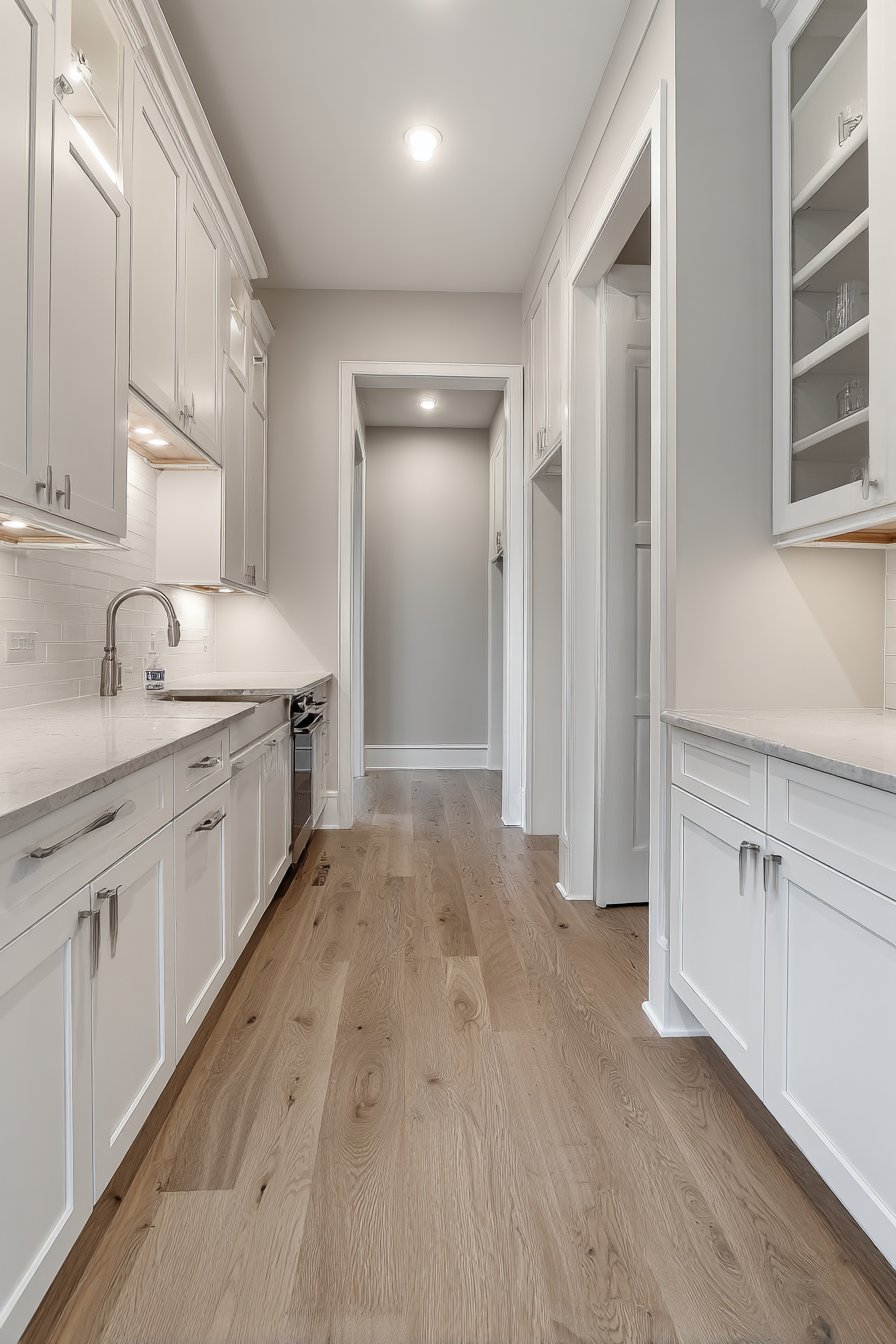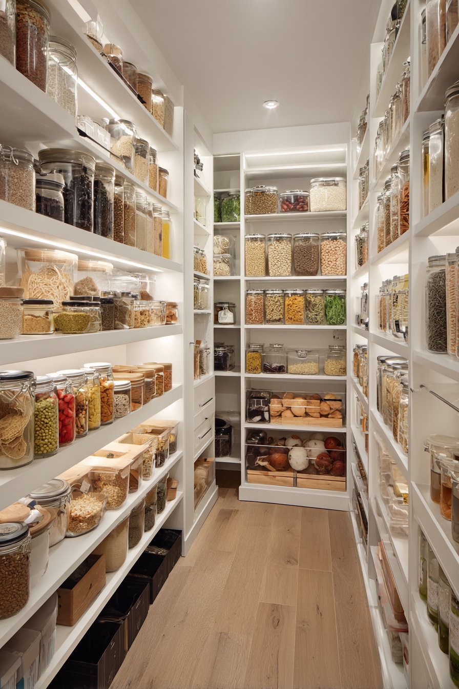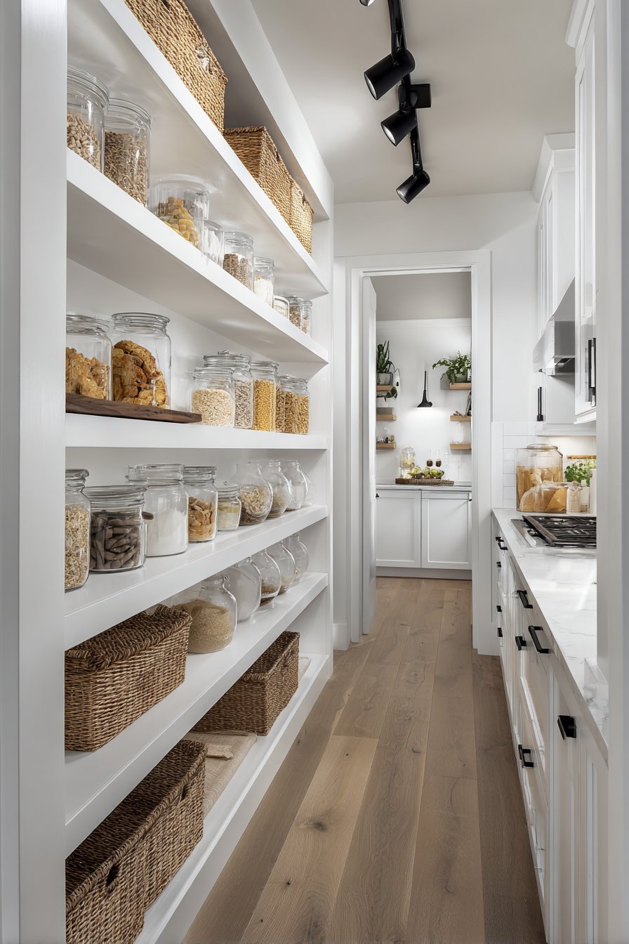 Galley-style pantry corridors benefit from continuous linear LED lighting systems. Low-profile LED strips in aluminum channels with frosted diffusers run ceiling lengths. The uniform illumination lights both sides of narrow spaces effectively. White built-in cabinetry and light oak shelving maximize brightness from efficient lighting.