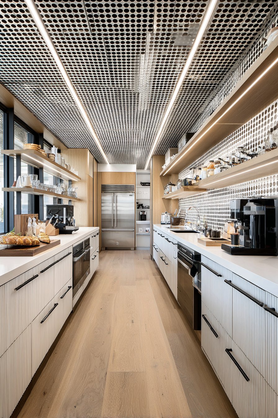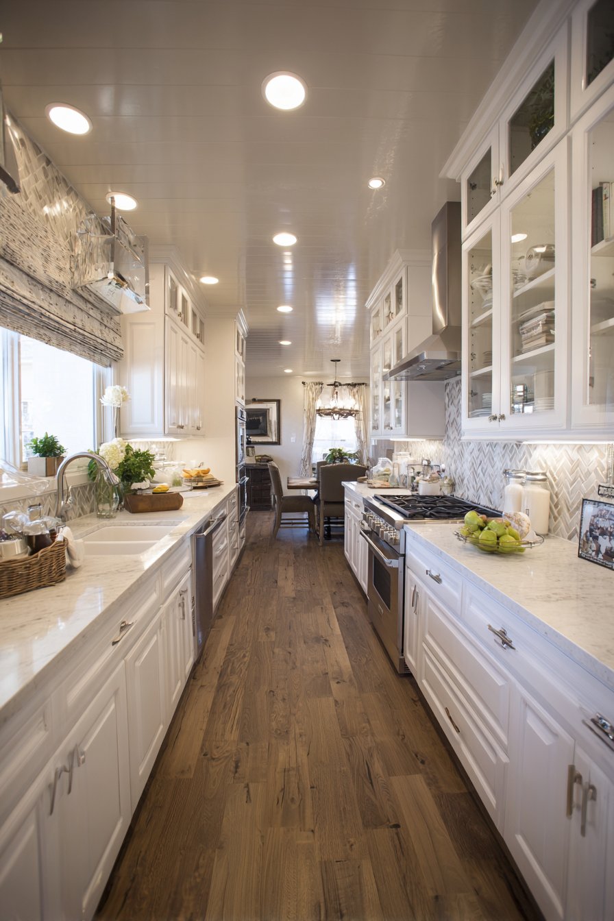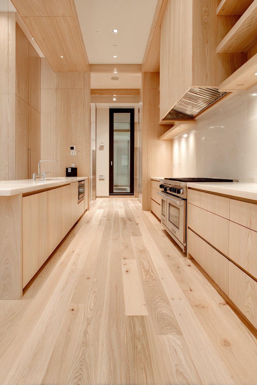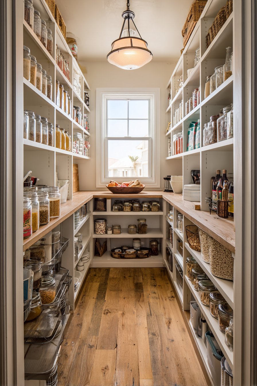 Galley-style pantry corridors benefit from continuous linear LED lighting systems. Low-profile LED strips in aluminum channels with frosted diffusers run ceiling lengths. The uniform illumination lights both sides of narrow spaces effectively. White built-in cabinetry and light oak shelving maximize brightness from efficient lighting.