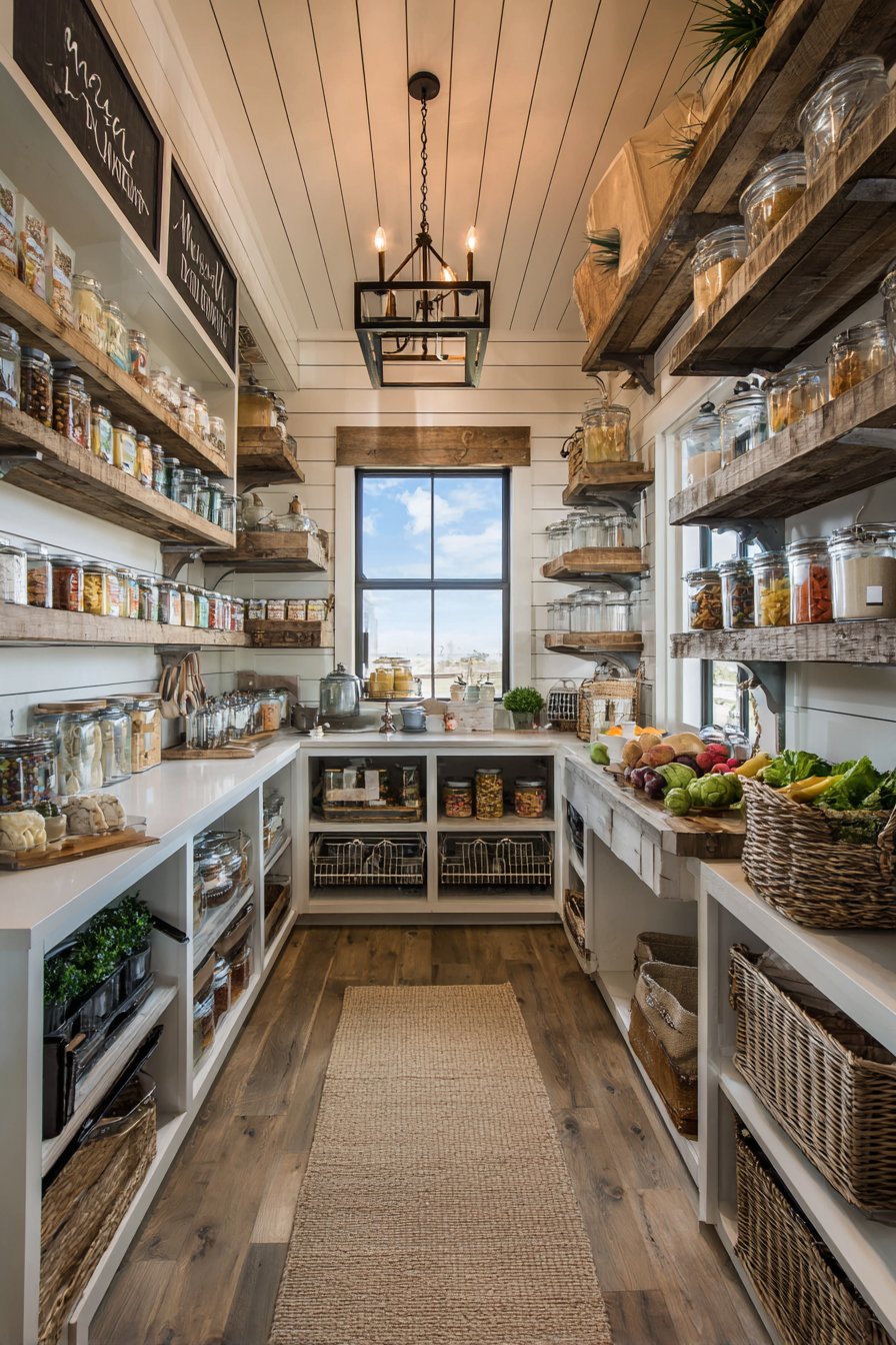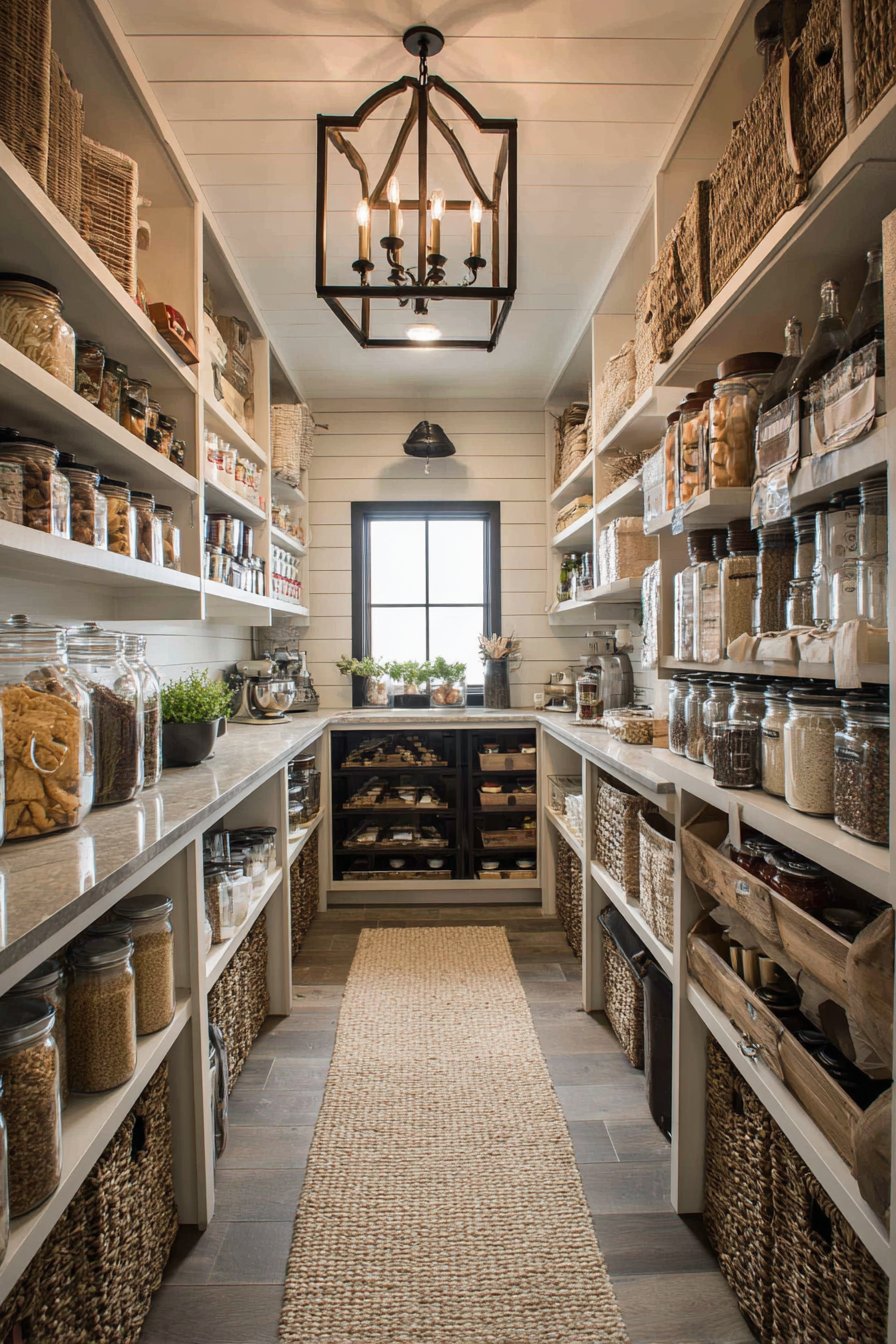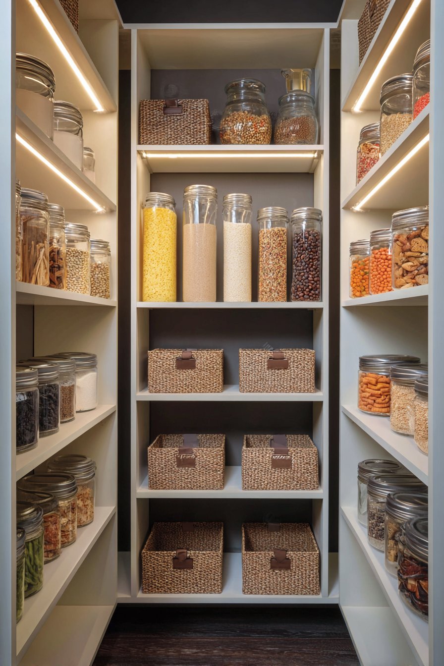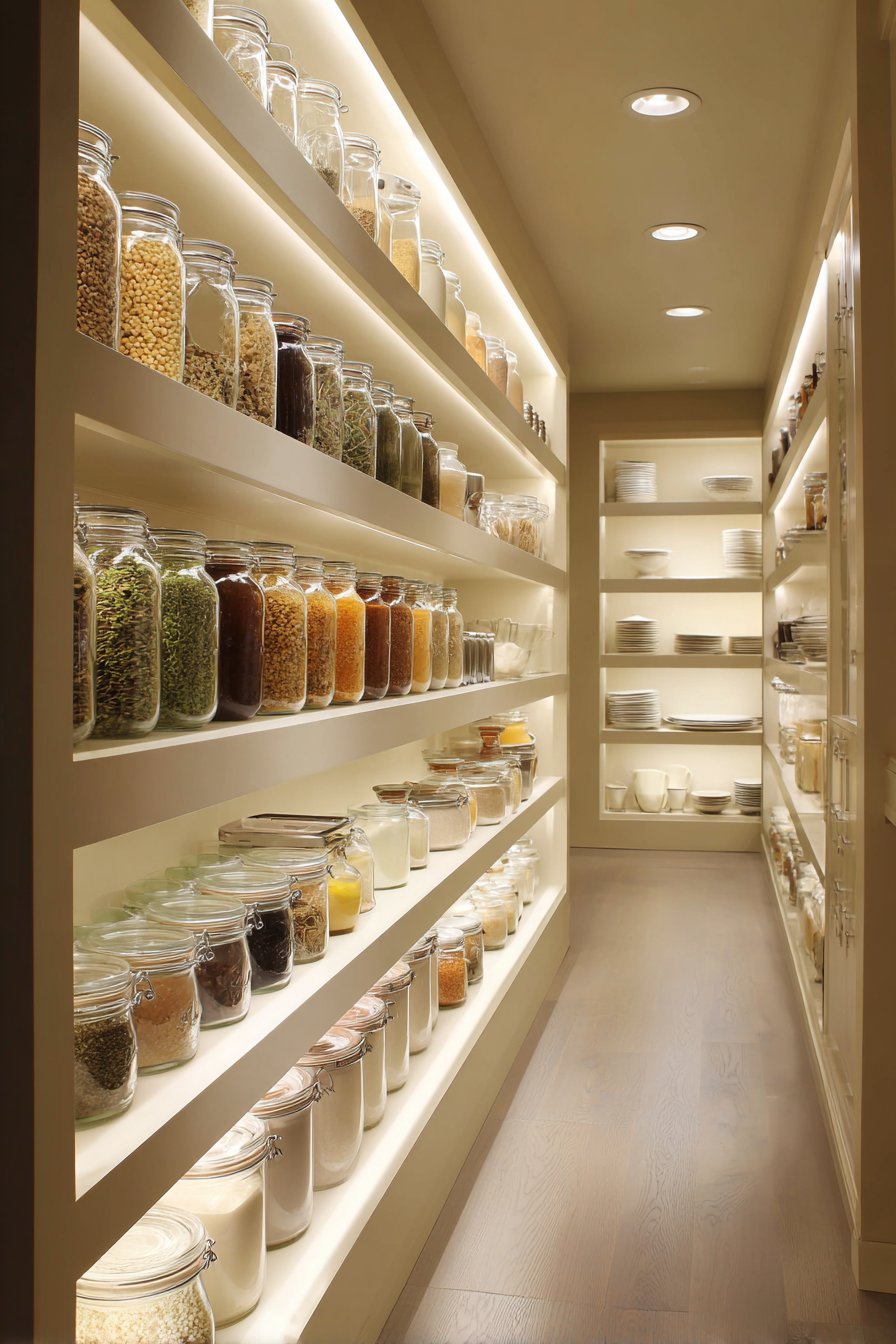 The layered strategy demonstrates advanced lighting design principles. Ambient, task, and accent lighting each serve distinct purposes. Together they create comprehensive illumination that enhances both function and beauty. This represents the pinnacle of pantry lighting design.