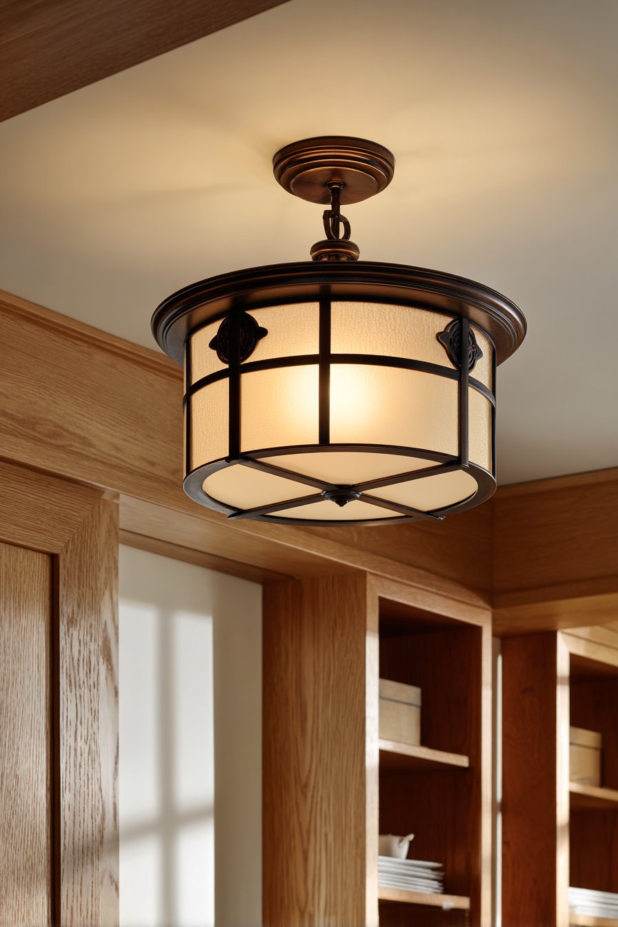 Traditional pantries benefit from classic semi-flush mount fixtures in oil-rubbed bronze. Central ambient lighting combines with under-cabinet task lighting at built-in desks. The main fixture features seeded glass diffusing warm LED light throughout. Fluorescent strips illuminate workspaces for menu planning and list writing.