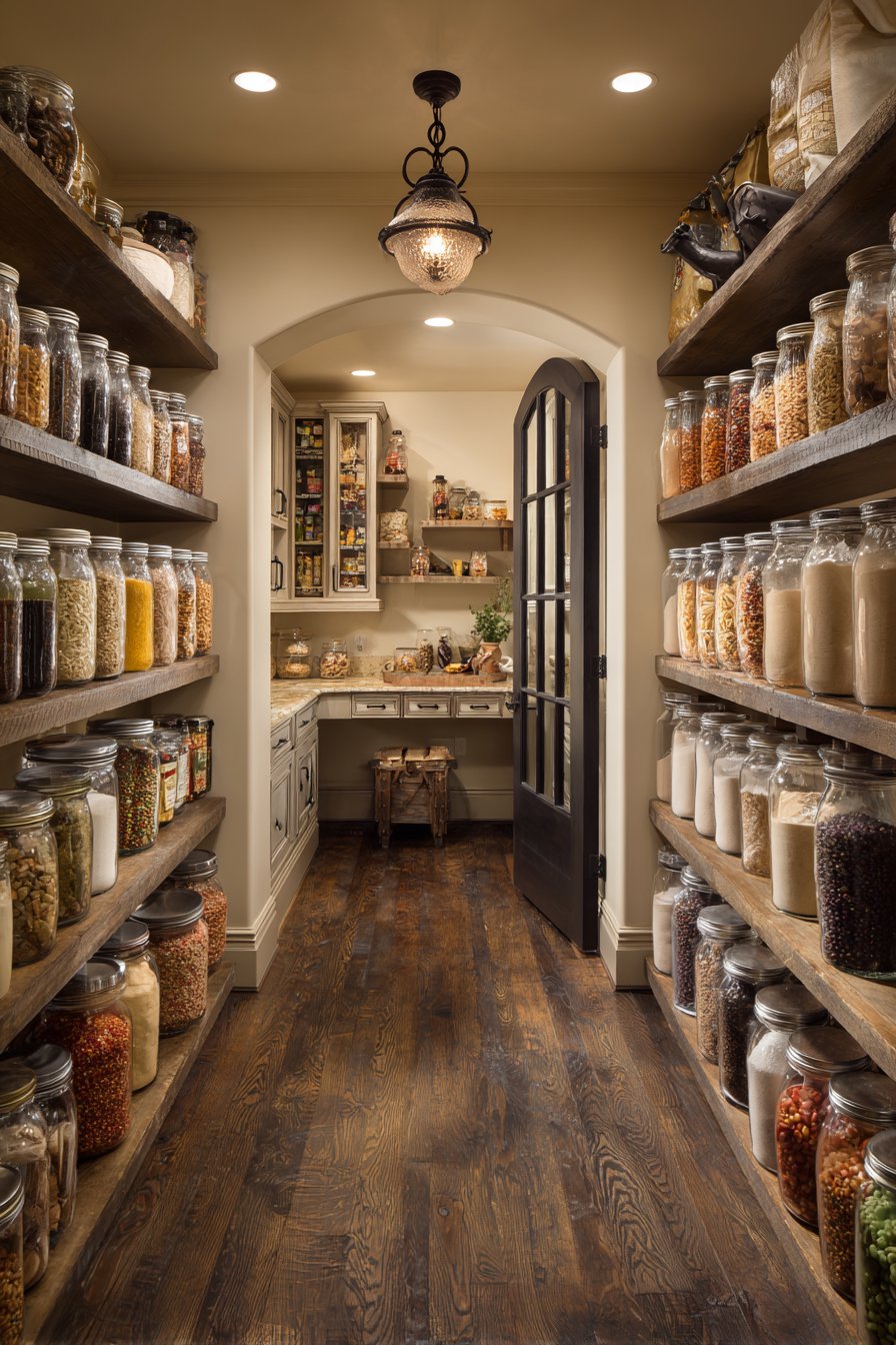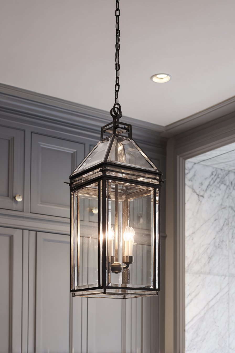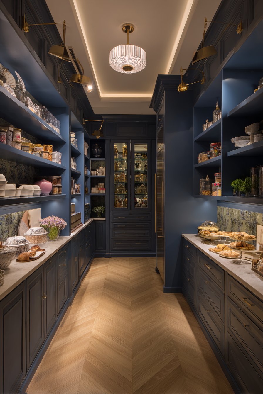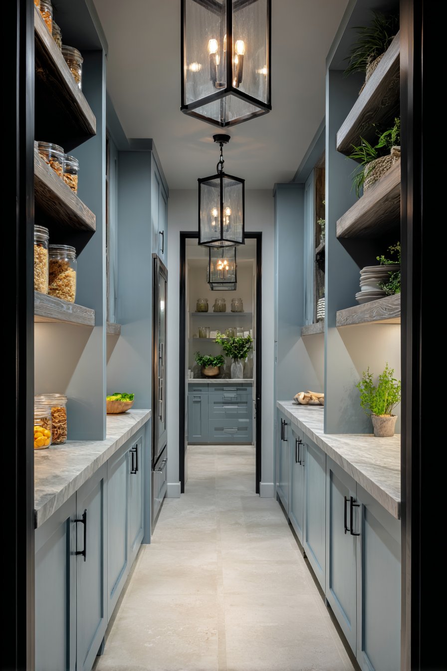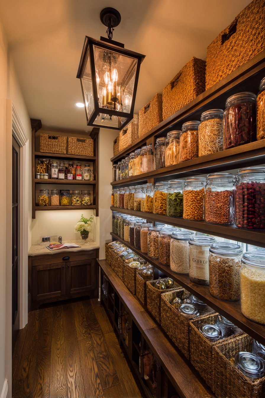 Entry lighting establishes mood and sets expectations for spaces. The decorative lantern signals that this pantry deserves attention. Multiple light sources at varying depths create visual hierarchy. Professional design principles applied to utilitarian spaces yield beautiful results.