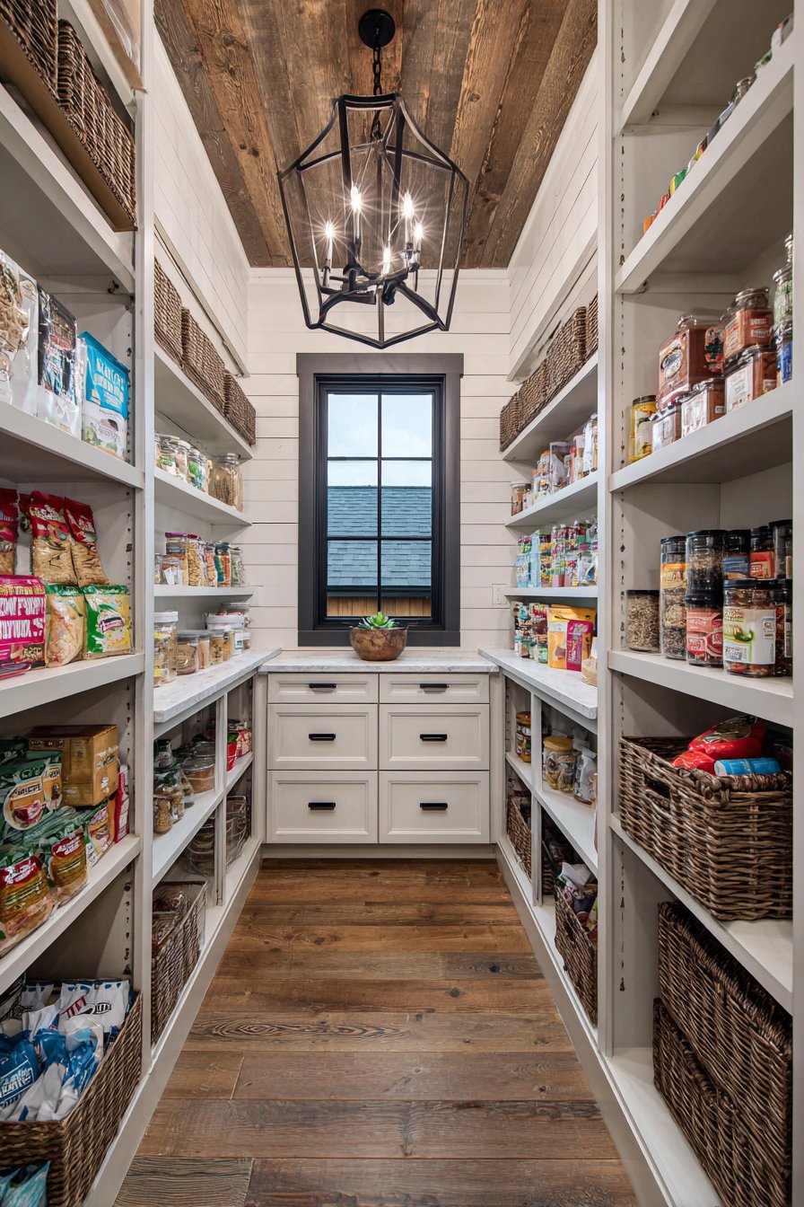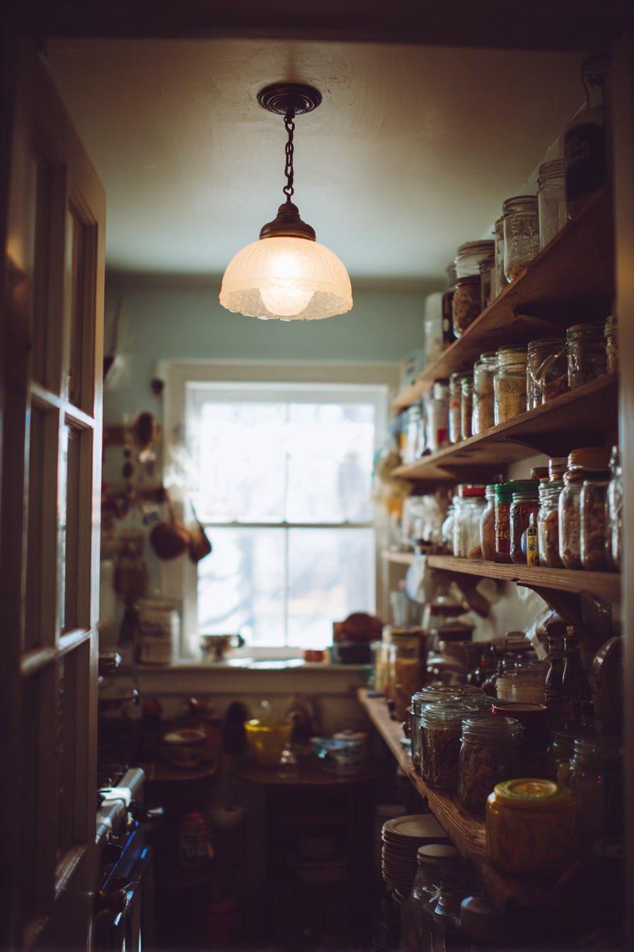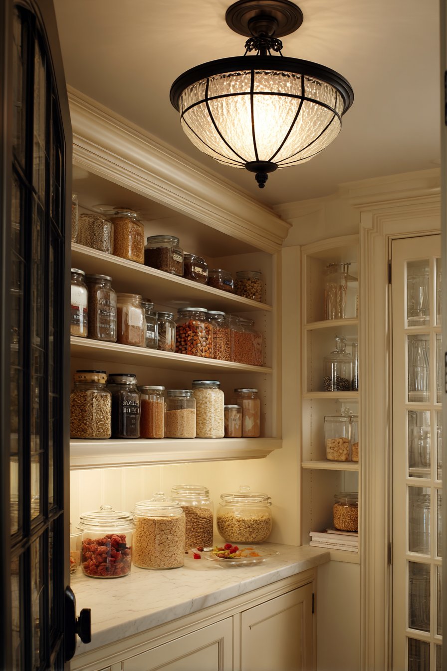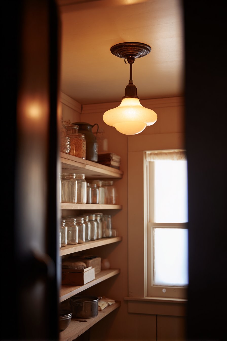 This simplified approach suits smaller pantries where single-source lighting proves adequate. The vintage fixture becomes a charming focal point. The milk glass diffuses light gently, reducing harsh shadows. Simplicity and character combine beautifully.
