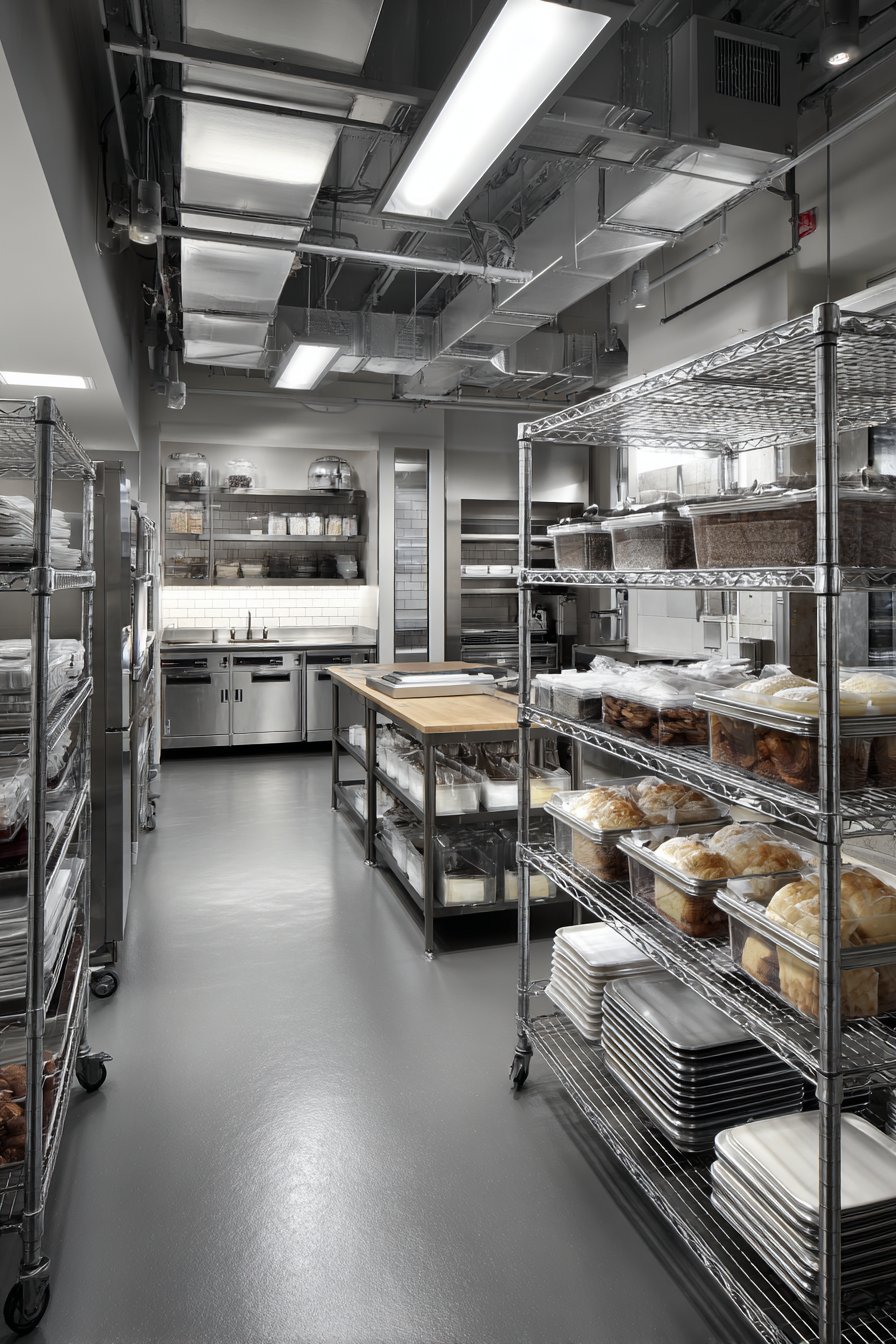 Chef’s pantries demand professional-grade fluorescent strip lighting for serious preparation work. Flush-ceiling mounted fixtures provide bright, shadow-free illumination ideal for cooking. The 5000K daylight-balanced light renders colors accurately for ingredient selection. Stainless steel shelving reflects the practical lighting beautifully.