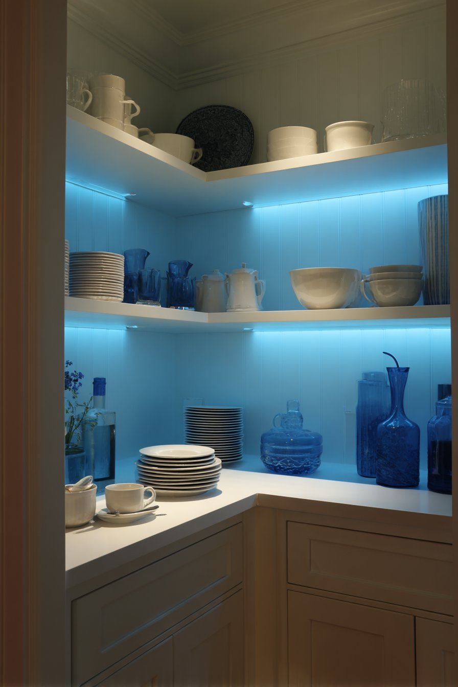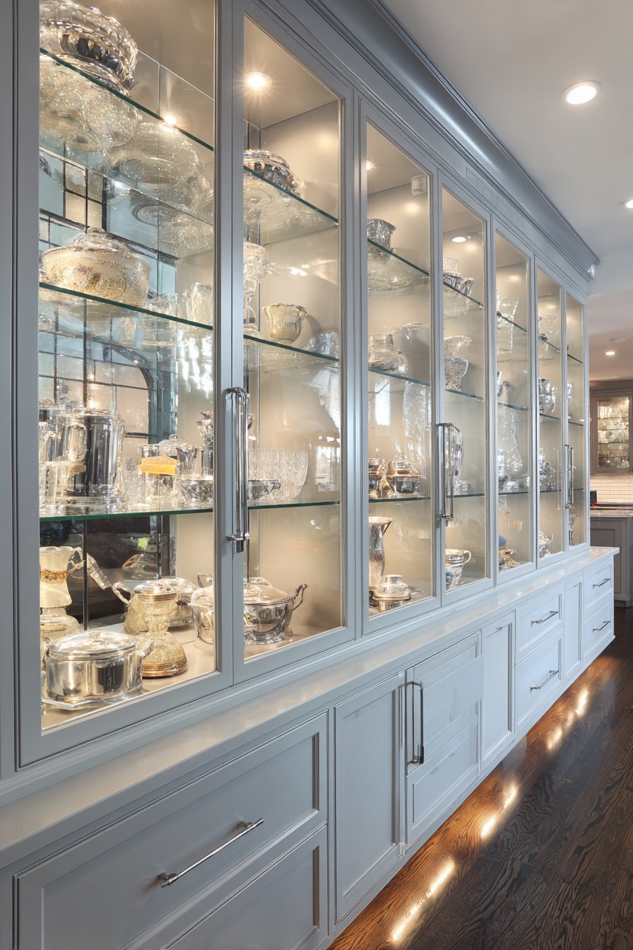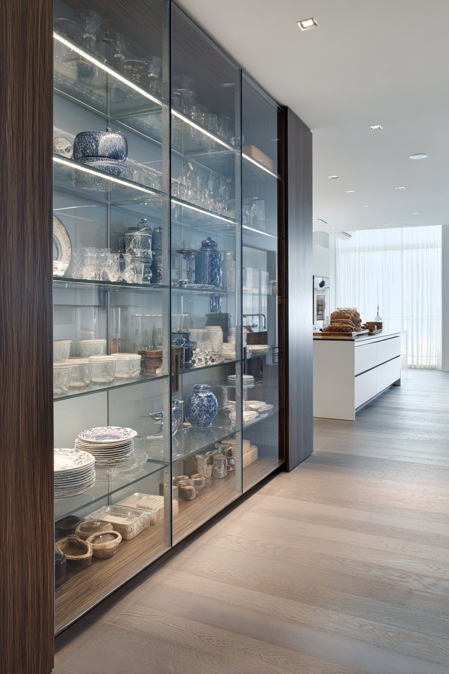 Contemporary pantries showcase collections through glass-front cabinets with interior LED lighting. Concealed LED strips along top cabinet edges wash light down across shelves. Decorative dishware and glassware receive museum-quality display treatment. Recessed downlights provide general illumination throughout main pantry areas.
