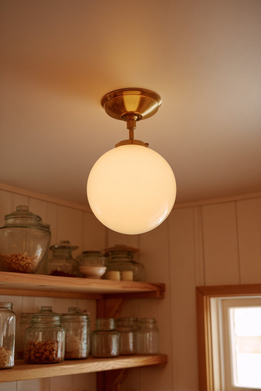 Vintage-inspired pantries embrace nostalgic charm with schoolhouse-style milk glass pendants. The single central fixture casts warm, diffused light throughout compact storage spaces. Open wooden shelving filled with glass canisters complements the period aesthetic. Natural window light supplements the pendant during daytime hours.