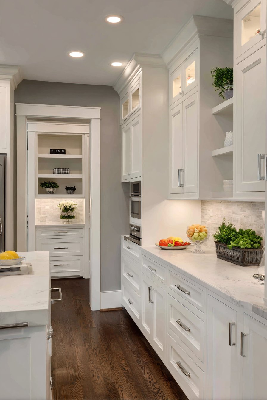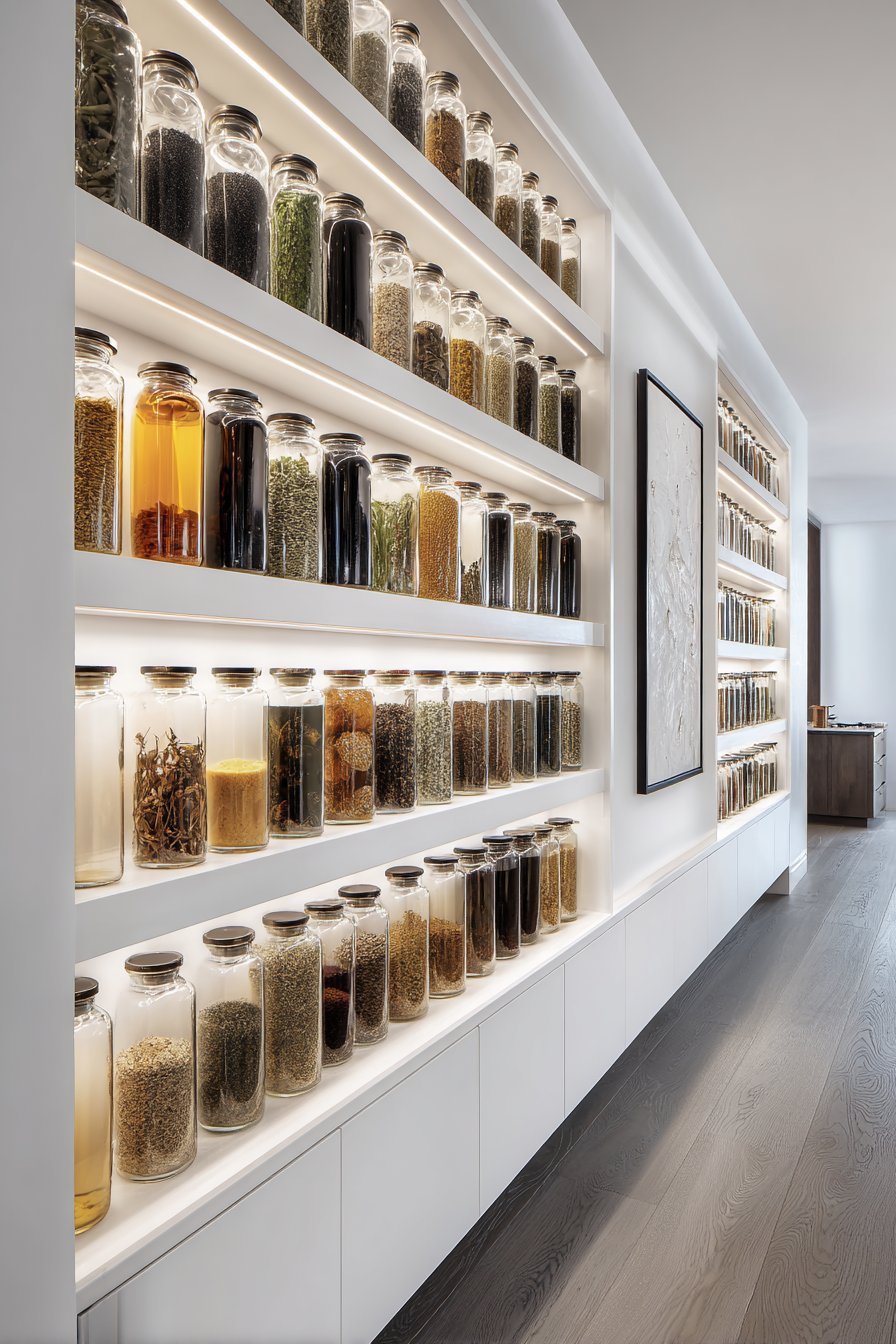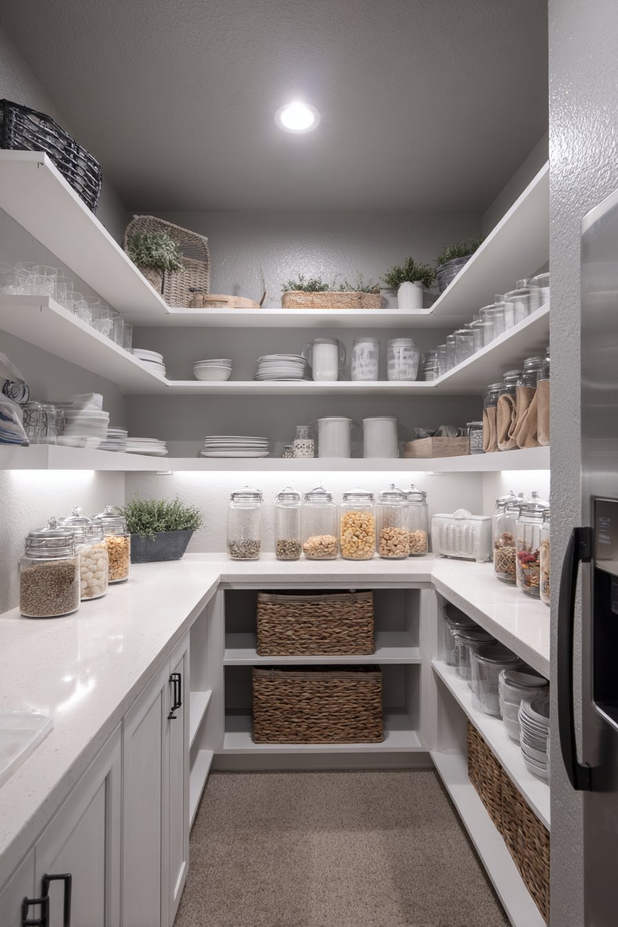 Natural recessed lighting overhead provides general illumination throughout the space. The under-shelf strips eliminate the common problem of dark shelf depths. This layered approach ensures visibility at every level. Organization becomes easier when you can see everything without reaching blindly.