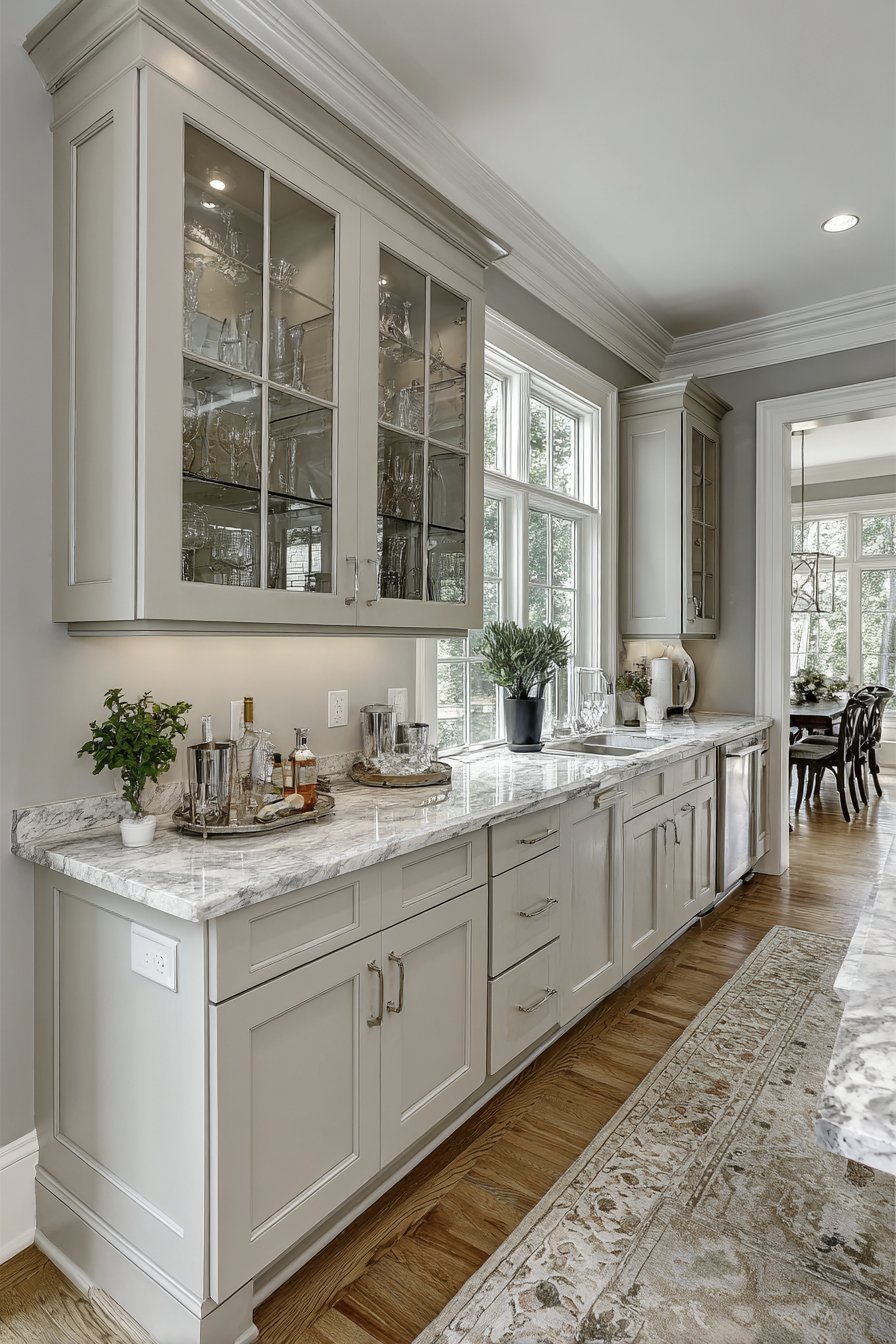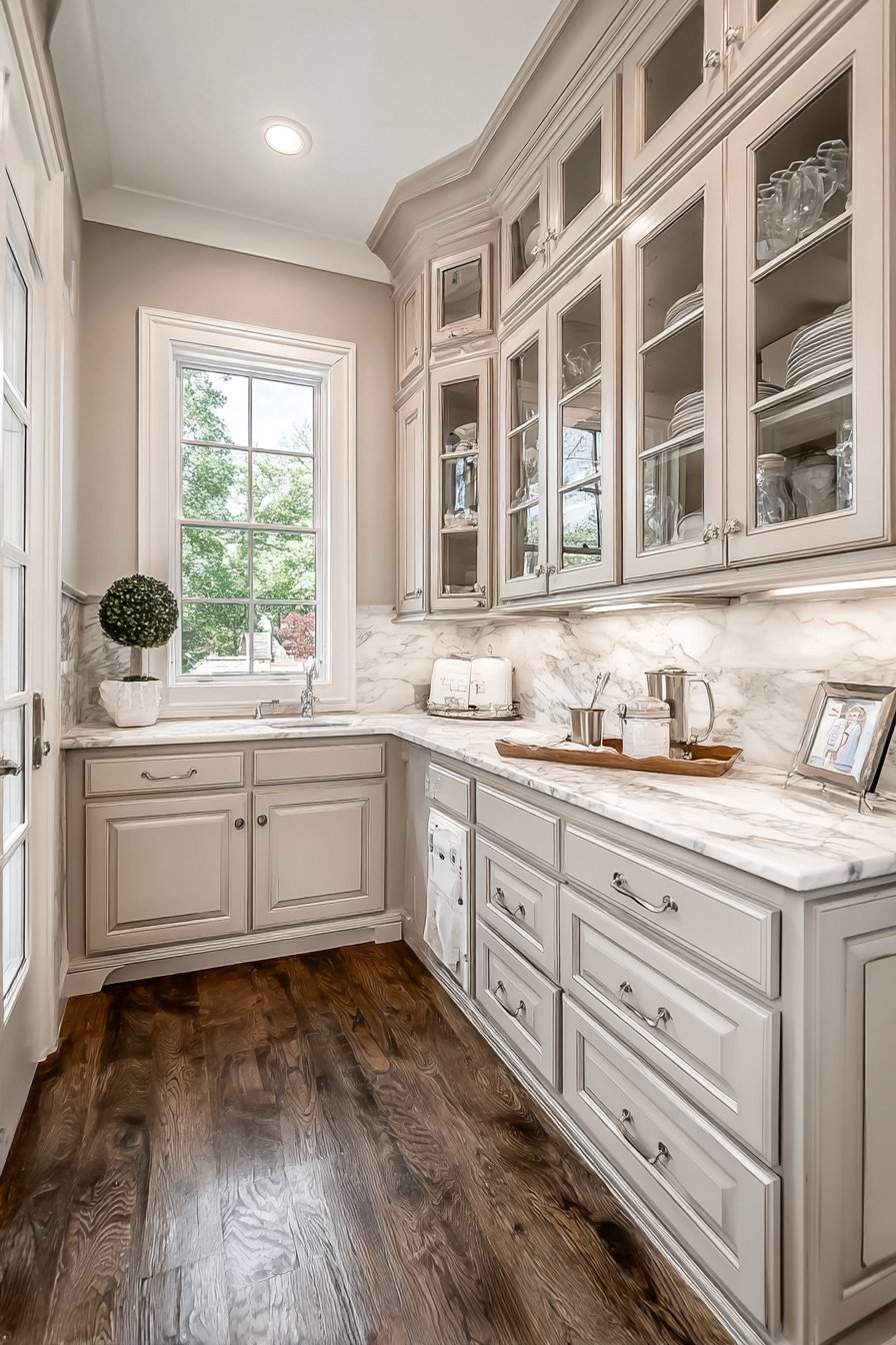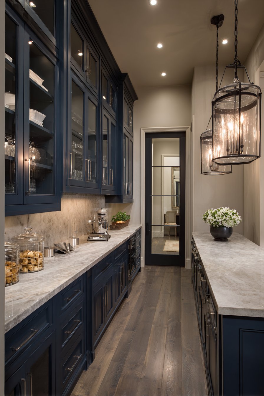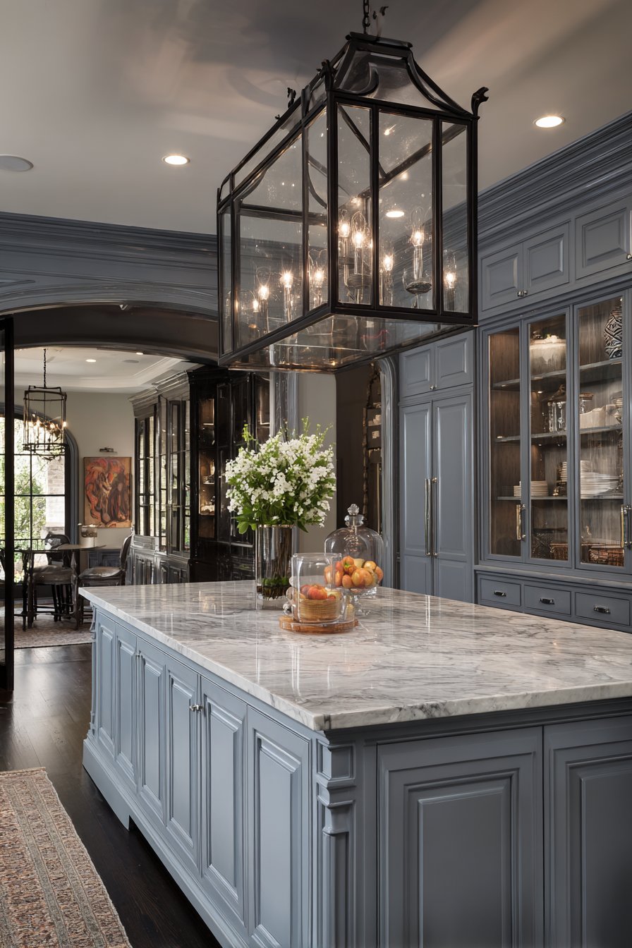 This layered approach creates a graceful transition from kitchen to pantry. The statement fixture announces the pantry as a designed space. Grey-blue painted cabinetry and marble countertops complement the sophisticated lighting. The combination elevates everyday storage spaces.