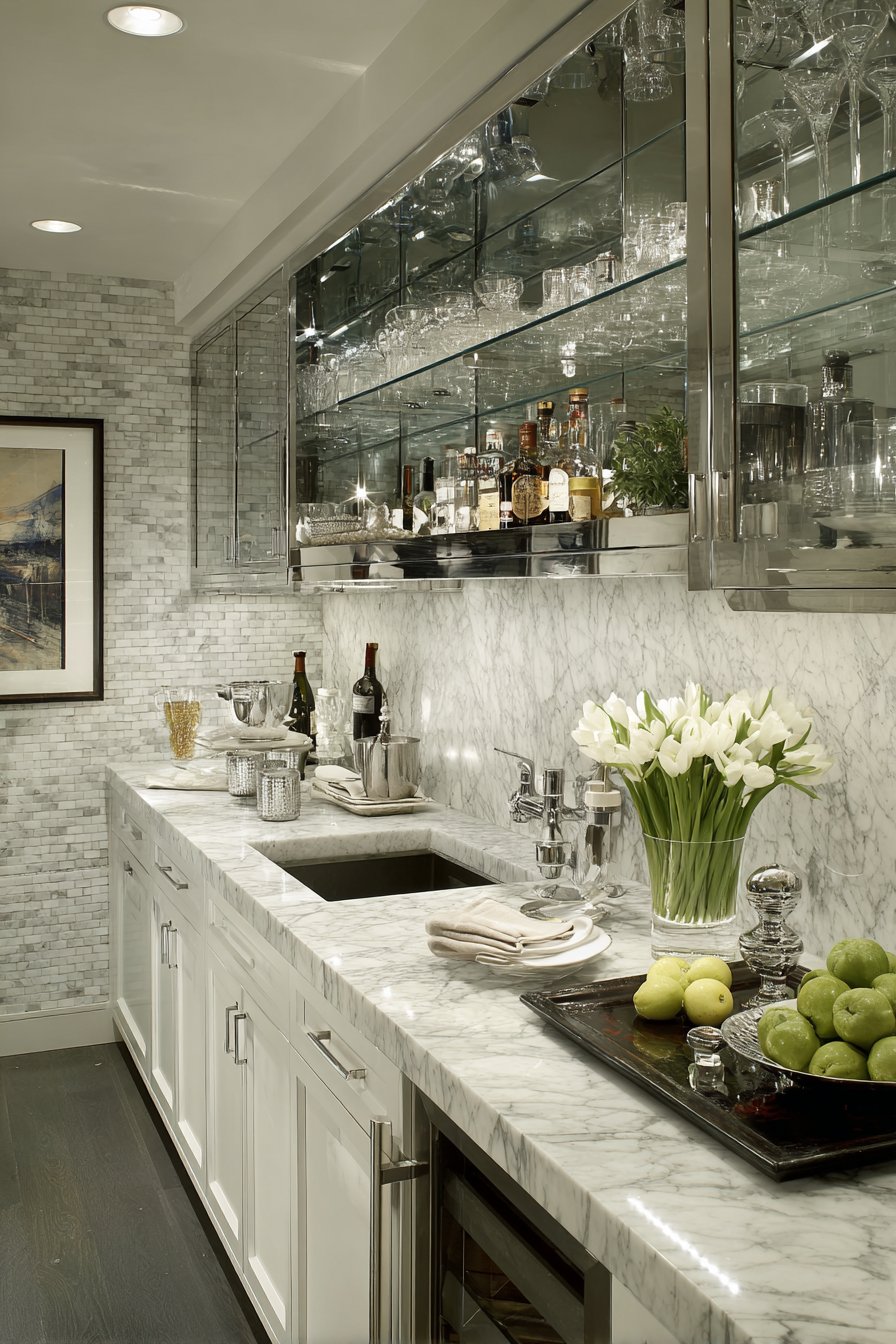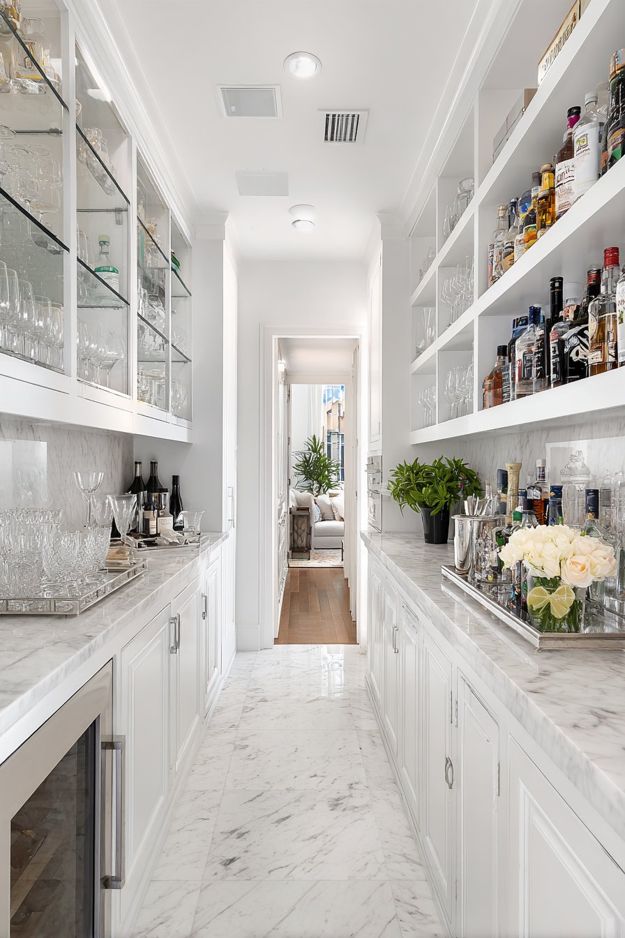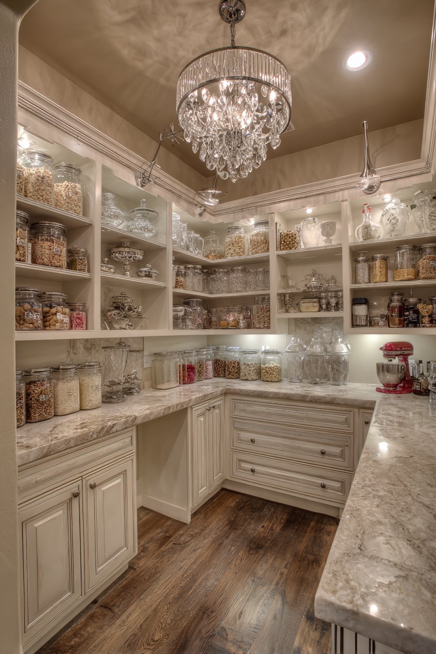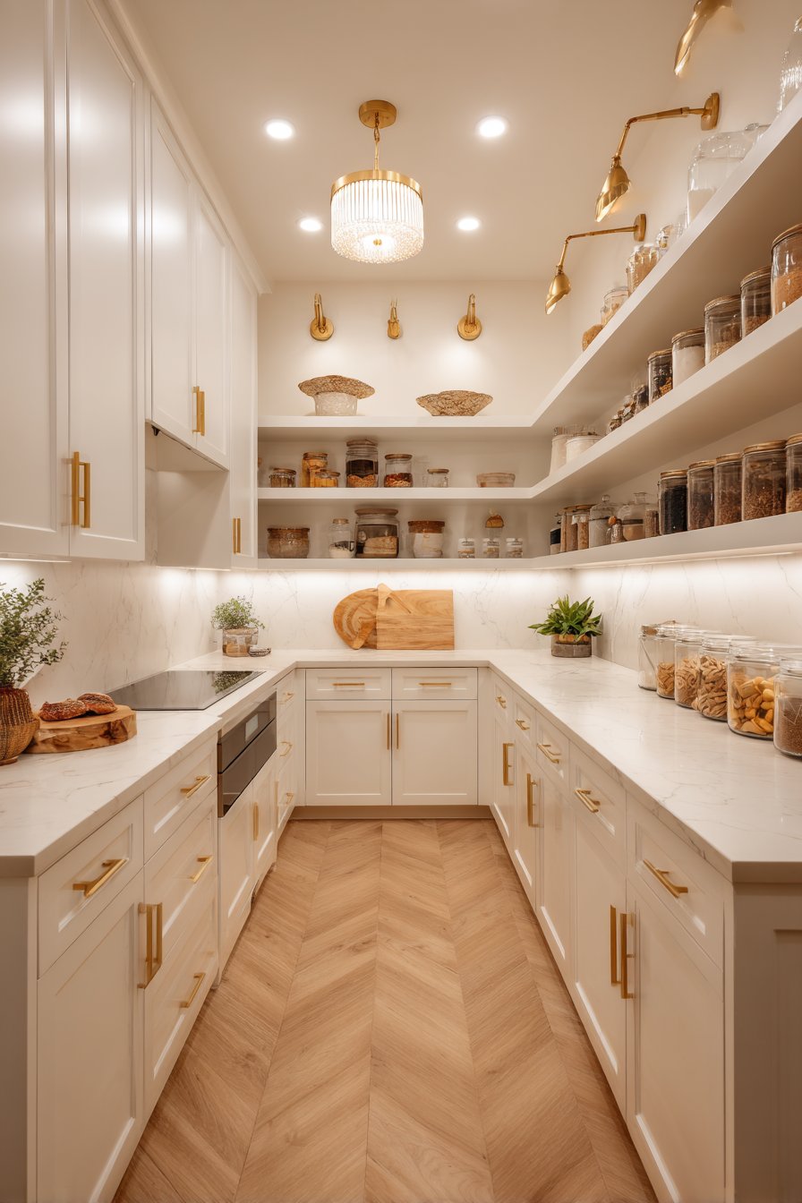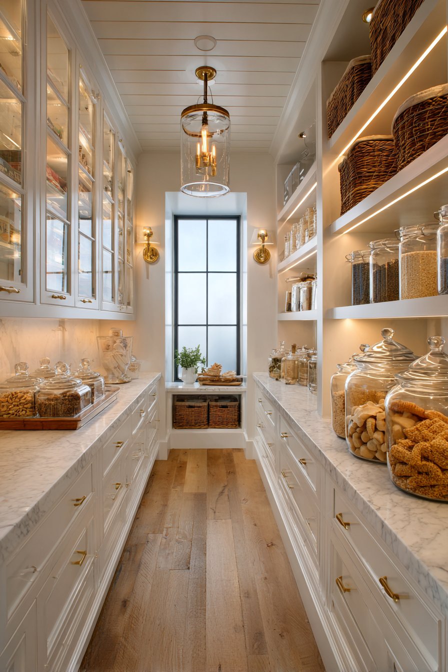 The combination of decorative and ambient lighting demonstrates sophisticated design thinking. Multiple light sources at varying heights create visual interest. This approach transforms ordinary pantries into spaces worthy of design attention. Function and beauty coexist harmoniously.