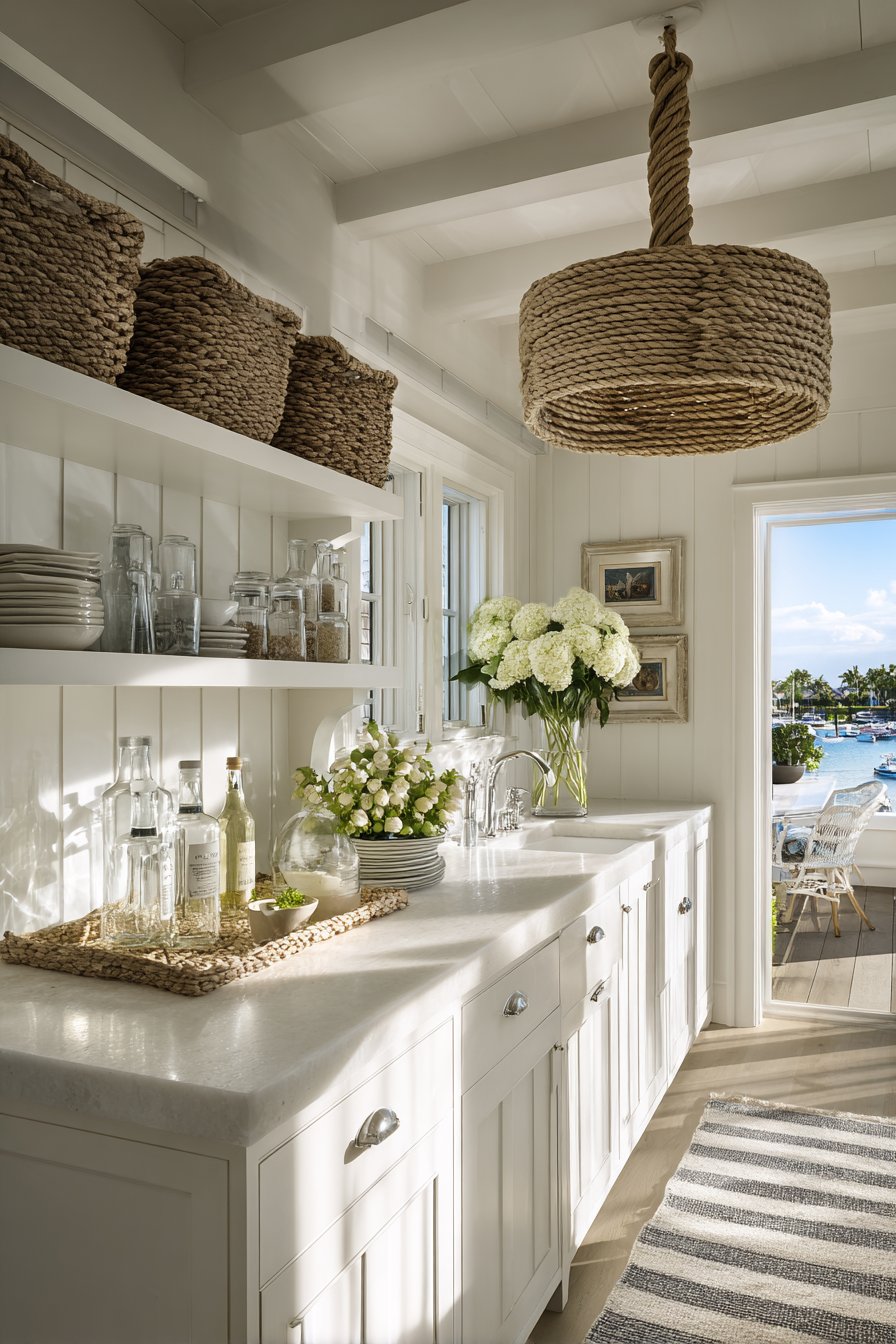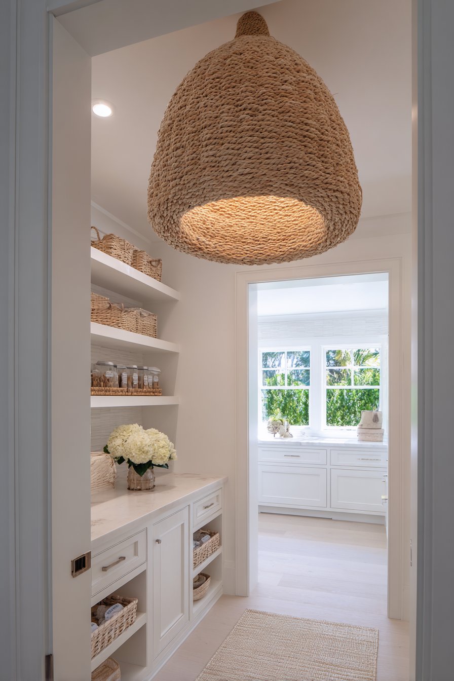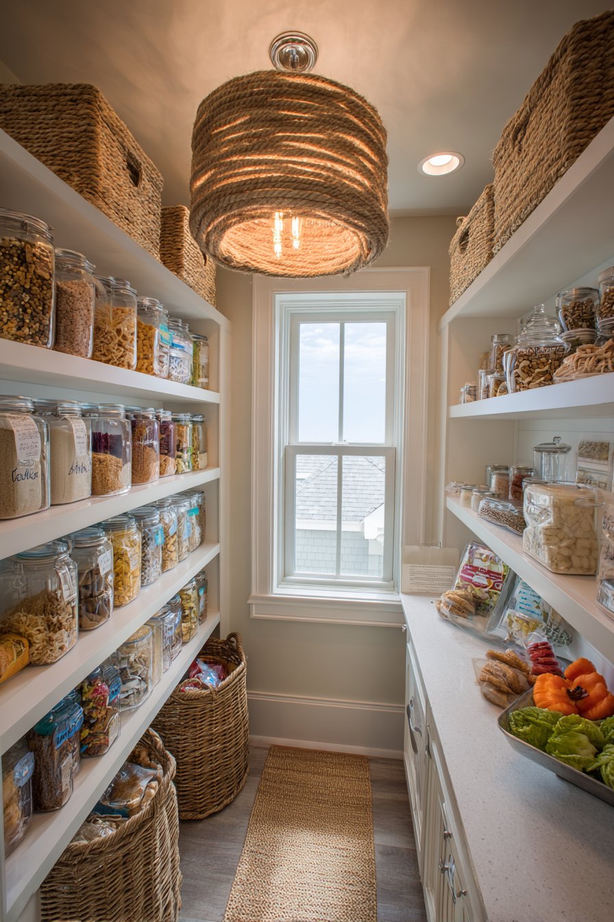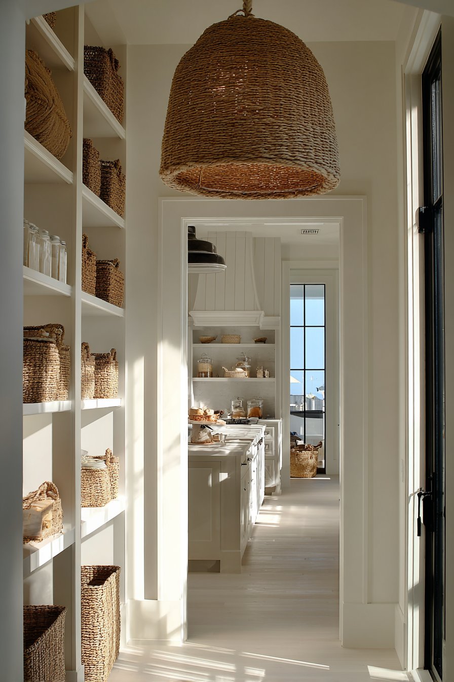 Coastal-inspired pantries embrace casual elegance with rope-wrapped pendant lighting. Woven drum shades filter warm light throughout bright white storage spaces. Natural fiber textures add visual interest while providing ambient illumination. Open white shelving displays organized items clearly under gentle overhead lighting.