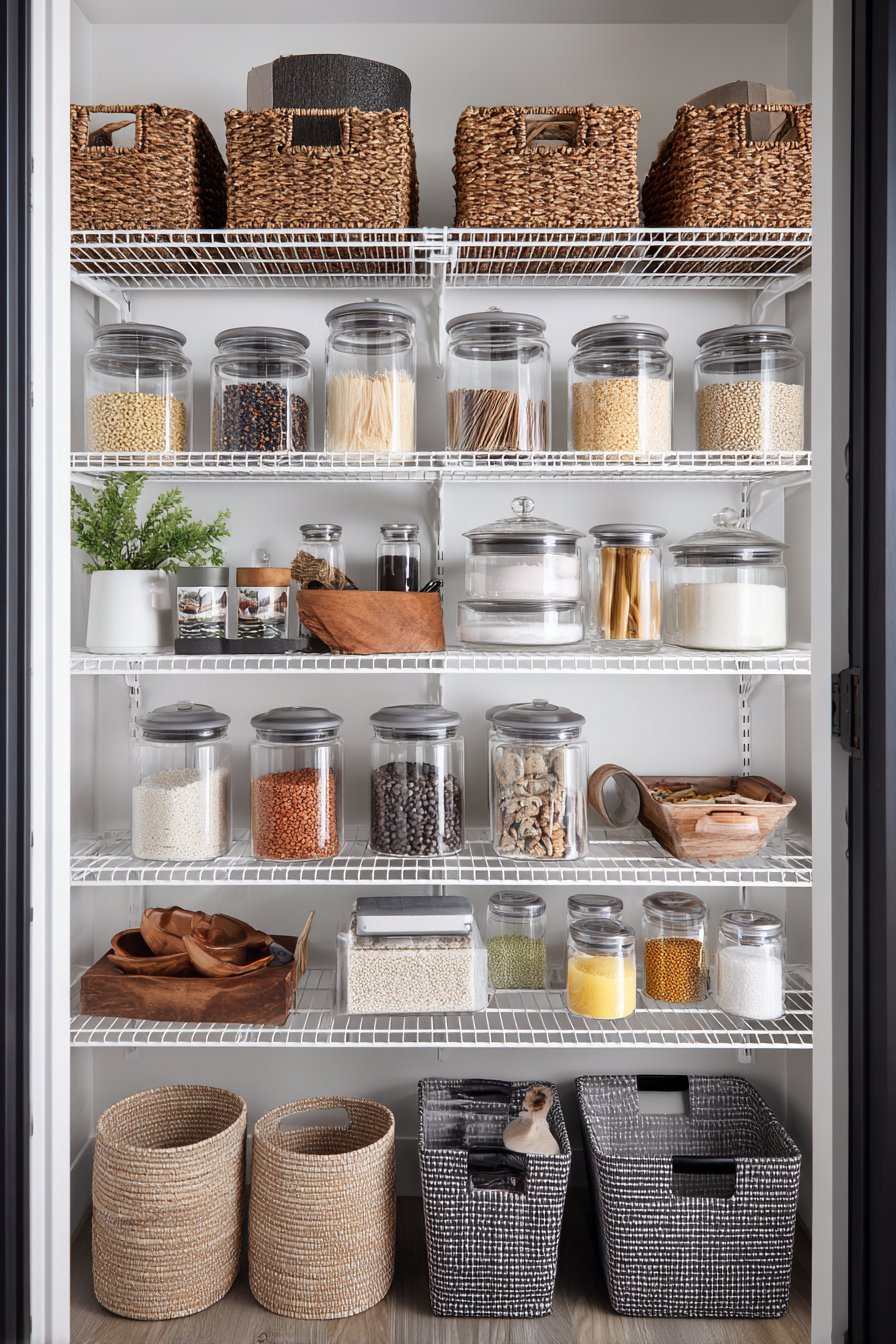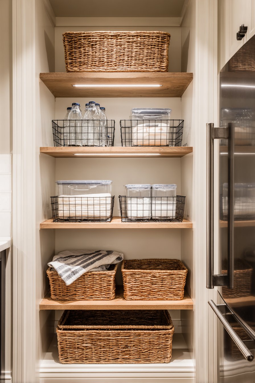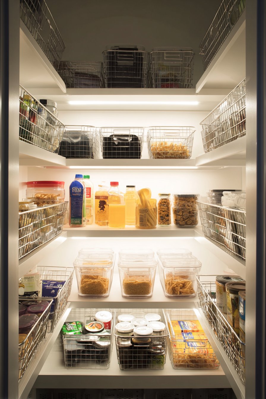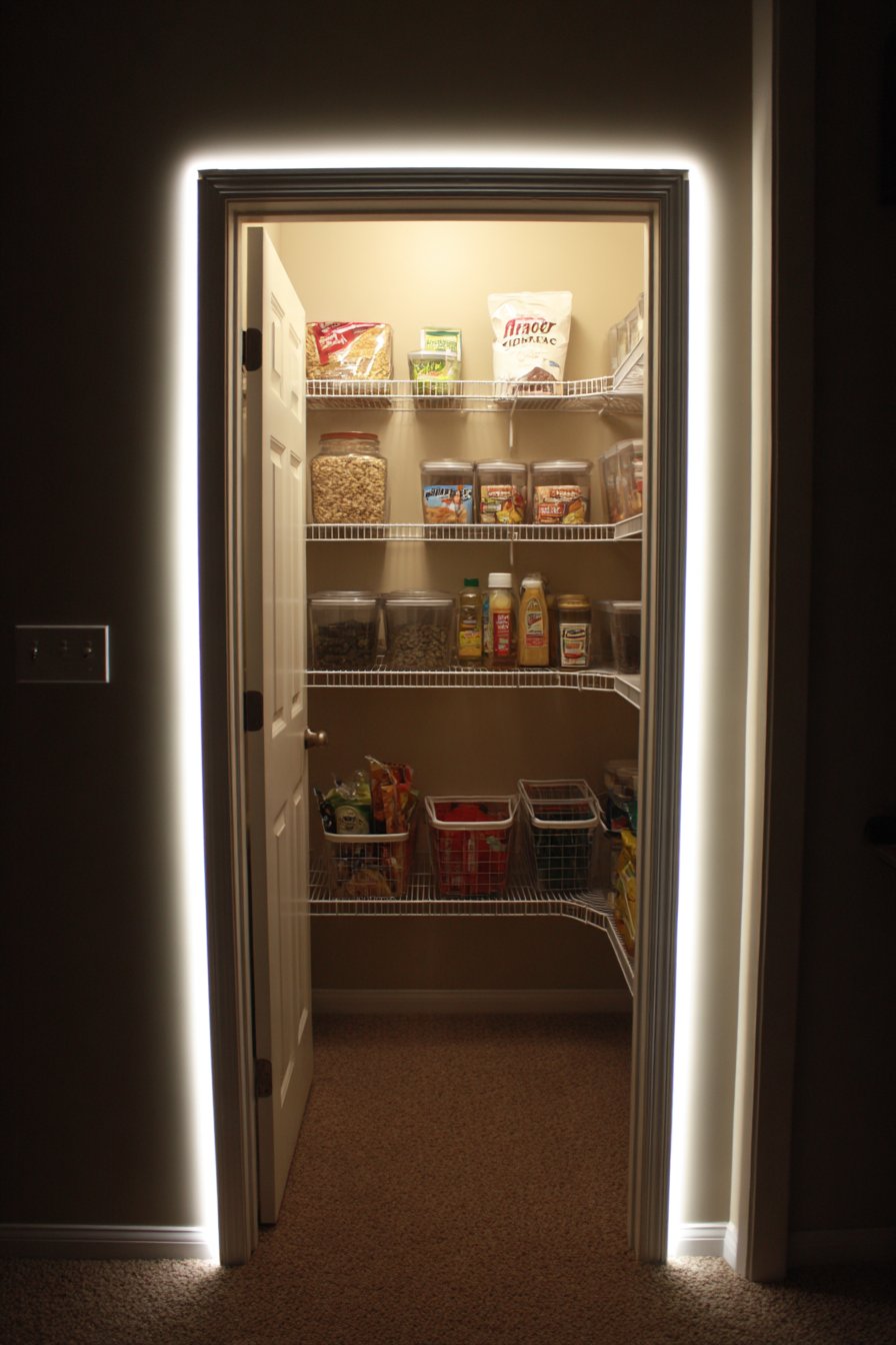 Small reach-in pantries transform dramatically with battery-operated LED strip lights. The strips adhere to interior door frame edges, activating when doors open. Cool white LEDs provide instant bright illumination without electrical work. Wire baskets and clear containers become clearly visible immediately.