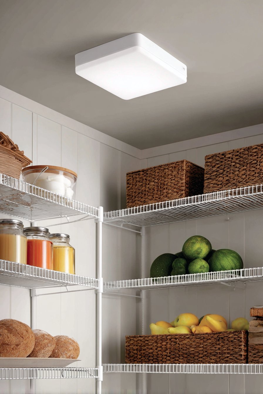 Compact pantries benefit tremendously from motion-sensor ceiling-mounted LED panels. The flush-mount fixture illuminates automatically when the door opens. Bright, even light spreads across white wire shelving systems. The 4000K daylight-balanced LED creates crystal-clear visibility for reading labels quickly.