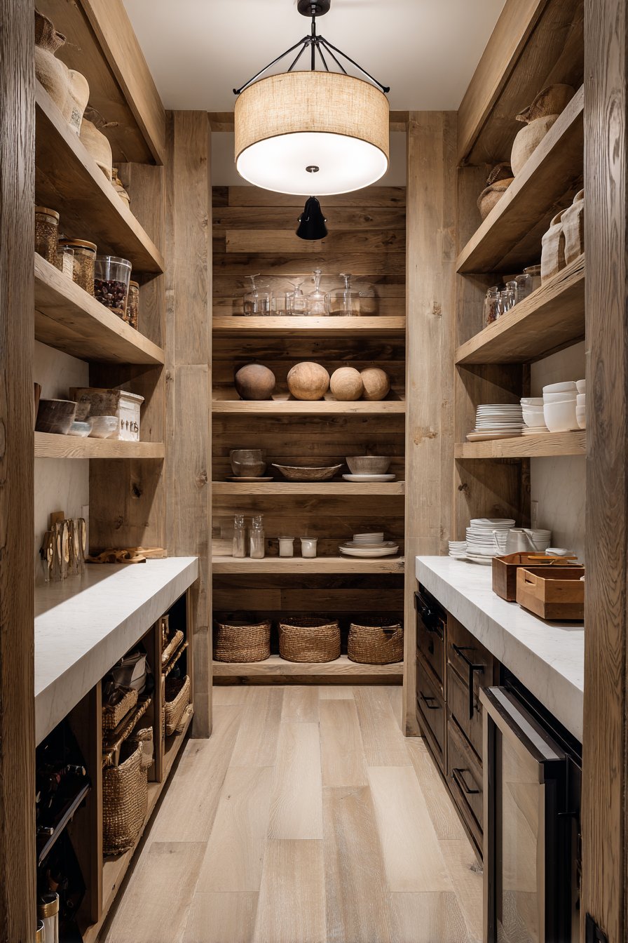 Natural wood shelving and cream walls reflect the layered lighting effectively. The traditional fixture provides decorative appeal while serving practical needs. This approach suits homes with classic or transitional design aesthetics. The combination of fixture types creates comprehensive illumination.