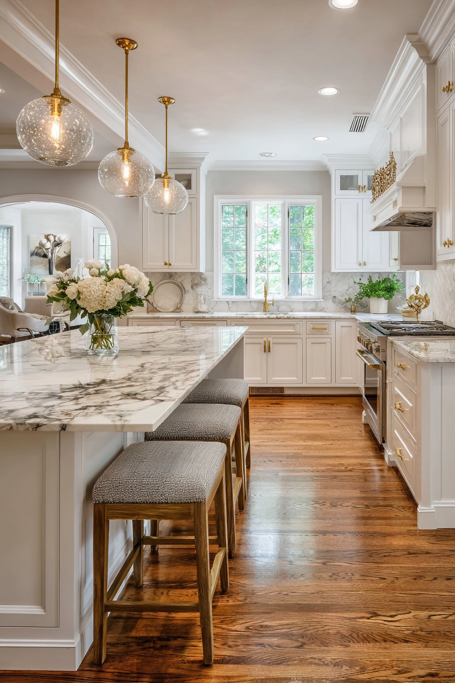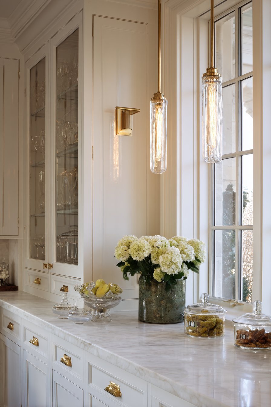 Butler’s pantries deserve lighting that combines function with sophisticated style. Two vintage-inspired pendants with seeded glass shades hang above marble countertops. Edison-style LED bulbs provide task lighting for food preparation. The warm 2700K light complements brass hardware on surrounding cabinetry perfectly.