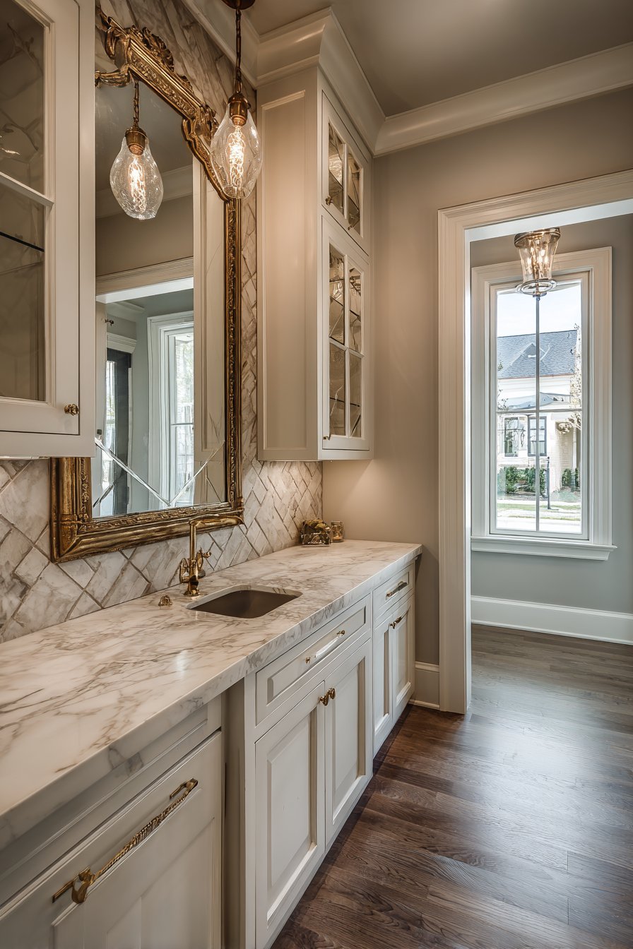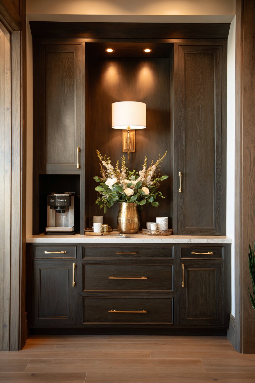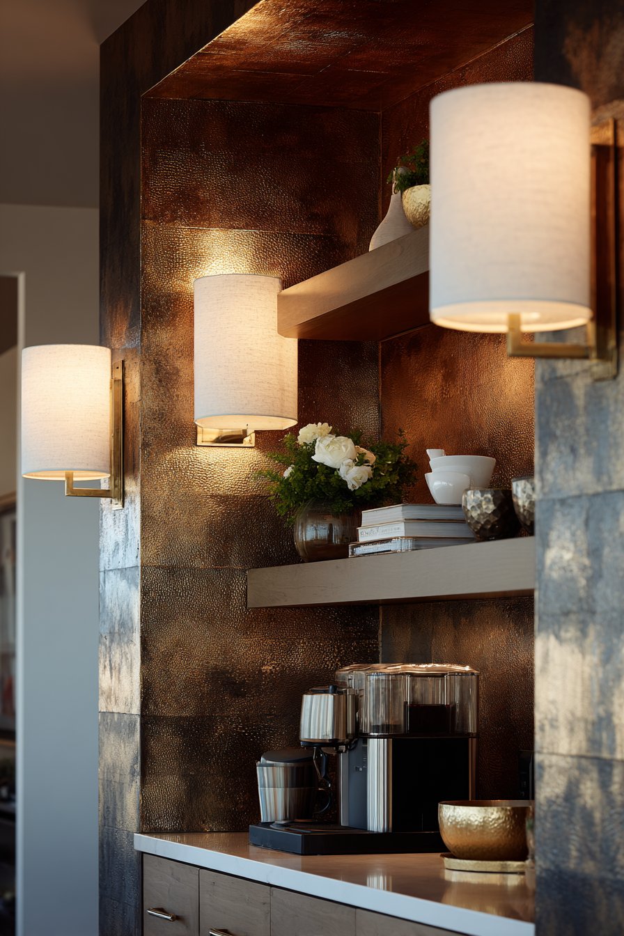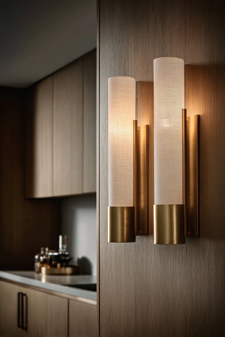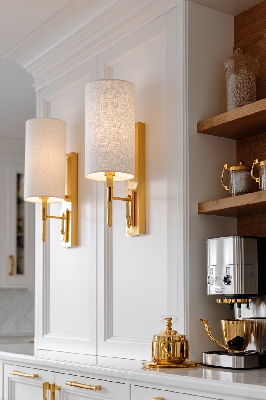 This layered approach creates distinct lighting zones for different activities. The coffee station receives dedicated task lighting for morning routines. The sconces add warmth and elegance to what could be purely functional spaces. Brushed gold finishes coordinate beautifully with cabinet hardware.