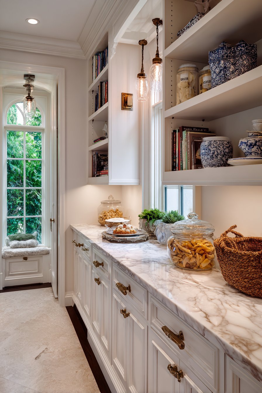 Luxury pantries achieve museum-quality presentation through layered lighting combining multiple fixture types. A drum pendant chandelier provides overall ambient illumination throughout the space. Adjustable brass picture lights mounted above open shelving highlight decorative serving pieces. The combination creates gallery-like presentation of organized displays.