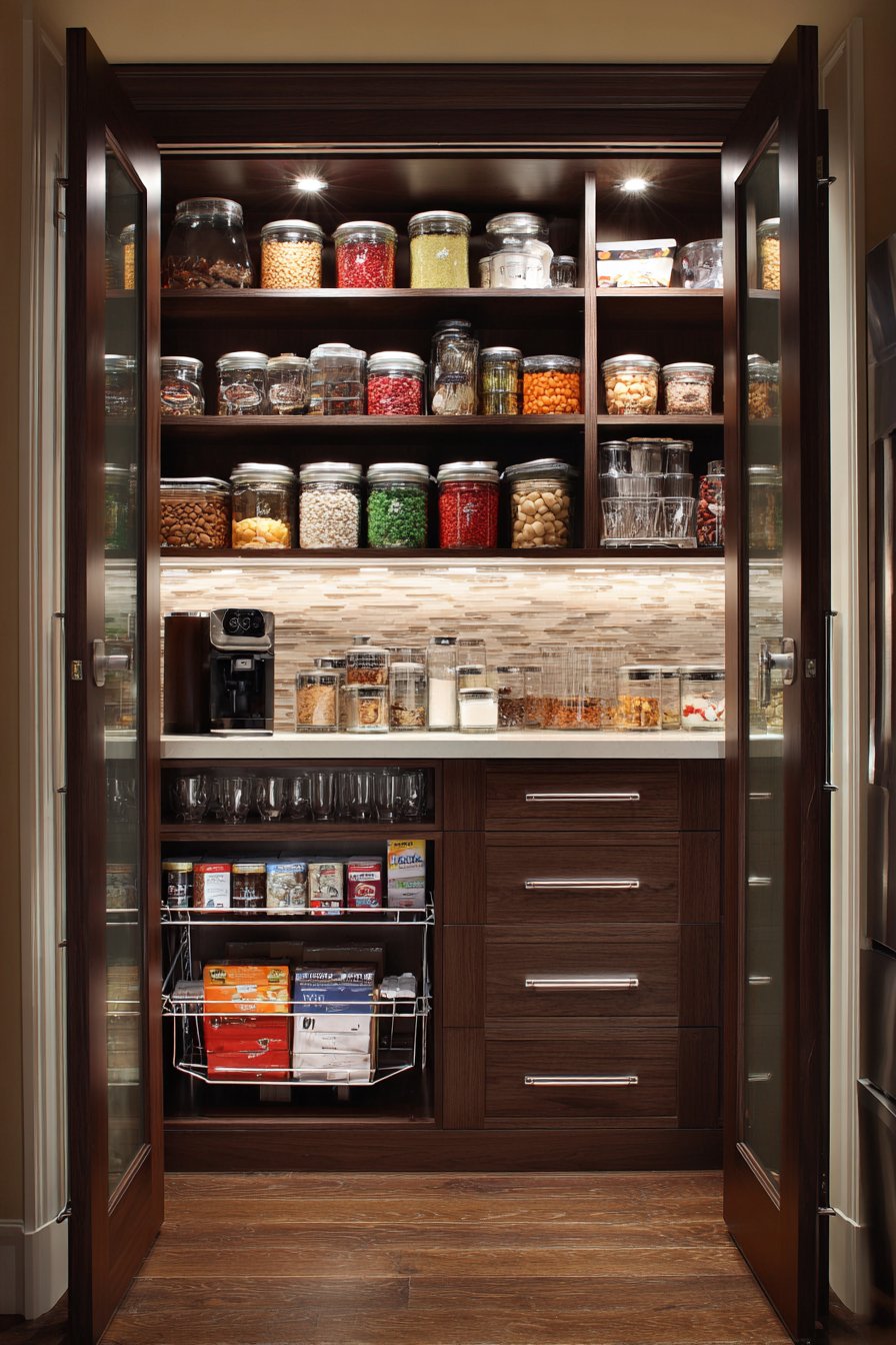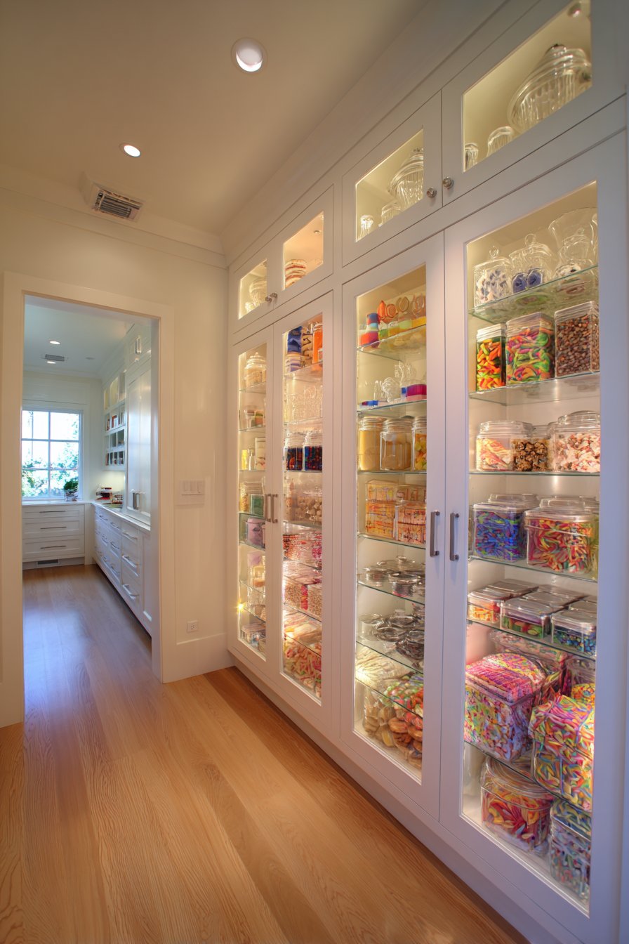 The backlit displays add both function and visual drama to organized storage. Glass and crystal items sparkle beautifully under interior lighting. This approach works especially well for formal entertaining pieces. The pantry becomes a gallery showcasing beautiful tableware.