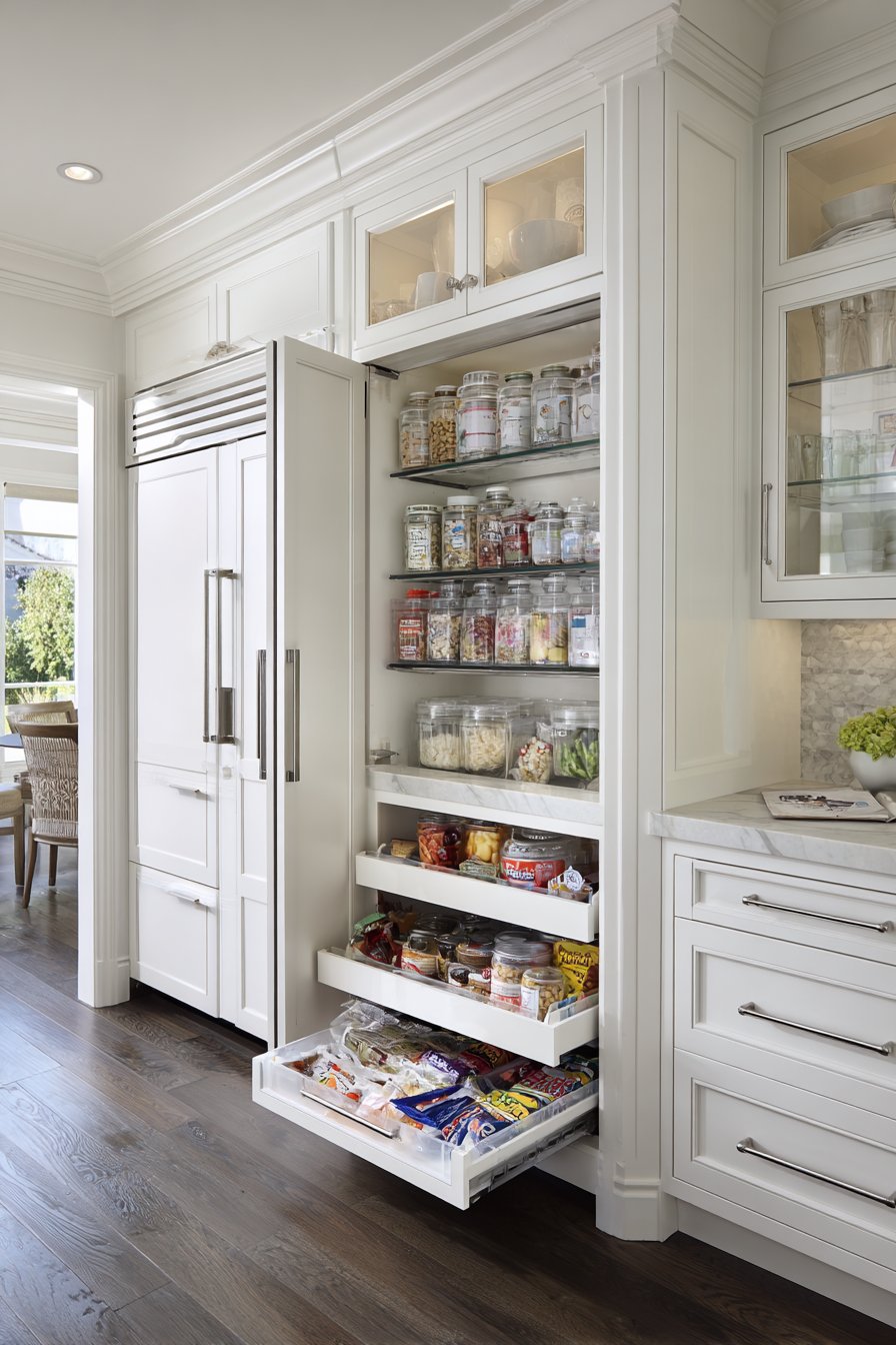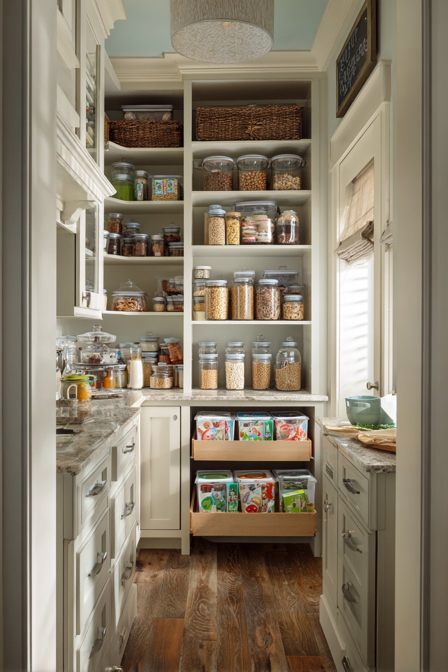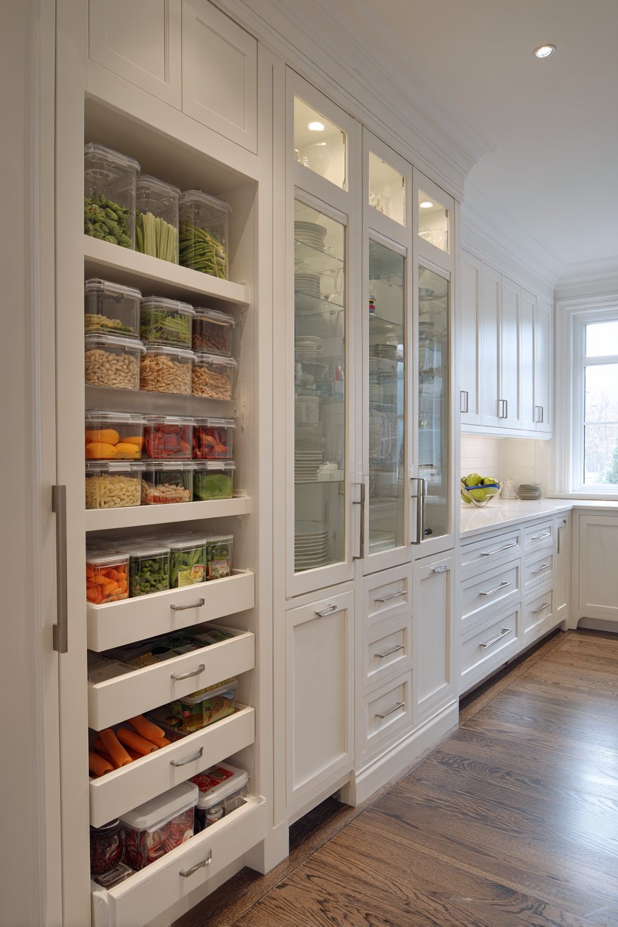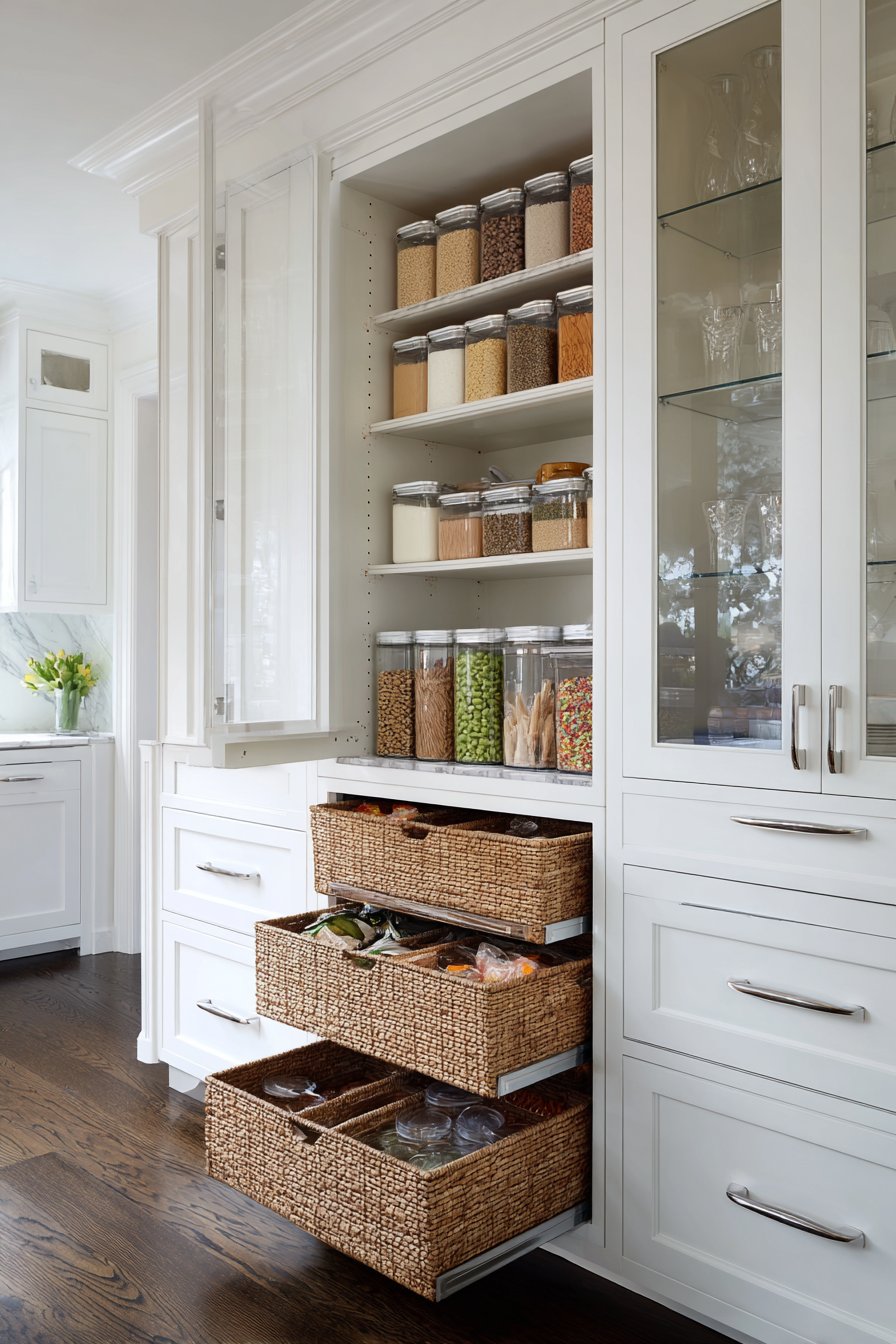 Floor-to-ceiling white shaker-style cabinetry creates timeless elegance in this practical pantry makeover. Glass-front upper doors reveal organized food storage containers in uniform clear acrylic. The transparency allows quick inventory checks while maintaining visual order. Pull-out wire basket drawers in the lower section provide easy access to root vegetables and snacks.