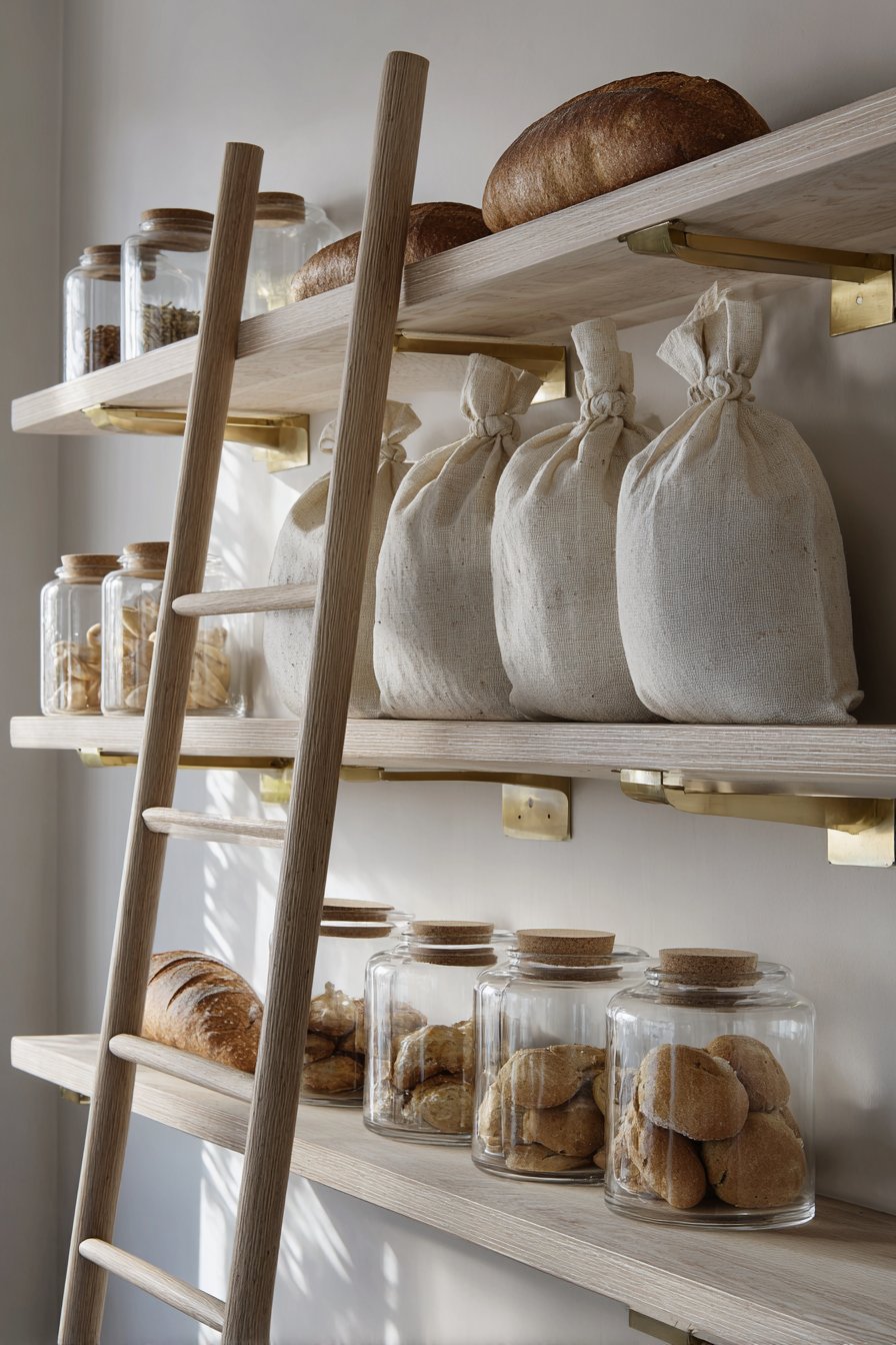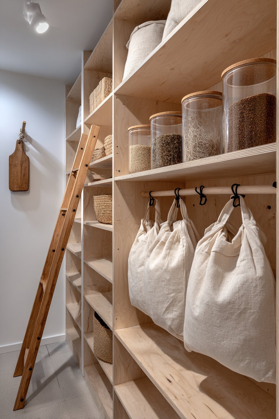 Light birch plywood shelving with minimal visible hardware creates Nordic serenity in this pantry. Clean lines and natural materials define the Scandinavian design philosophy. Natural linen storage bags hang from brass hooks for bread and produce. Simple glass containers with cork lids maintain the organic aesthetic throughout.