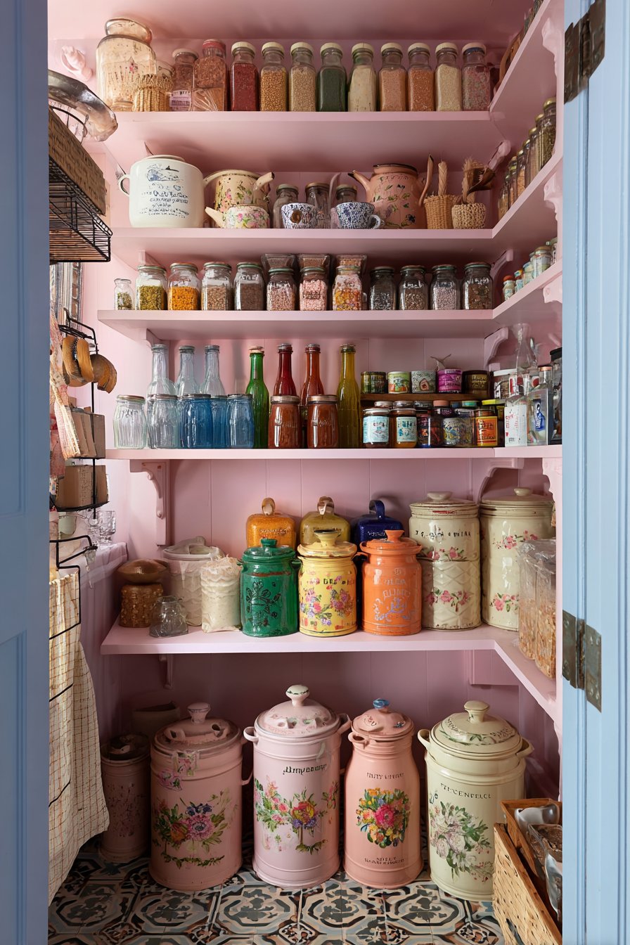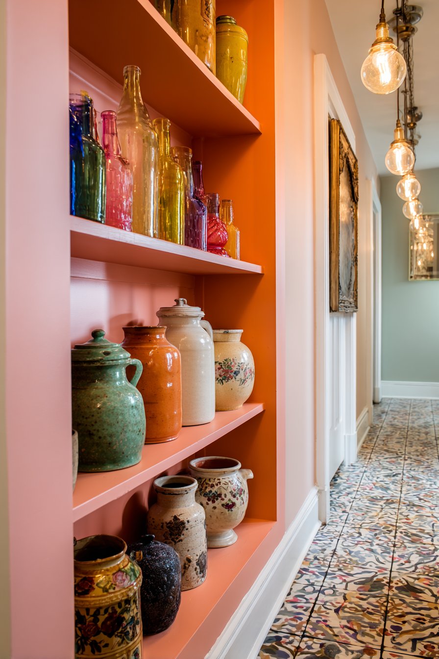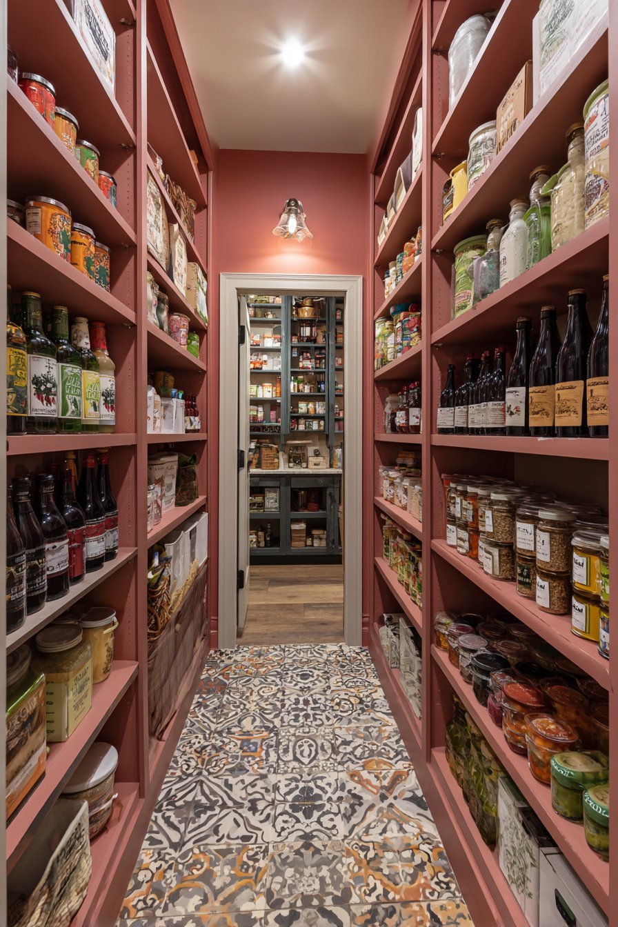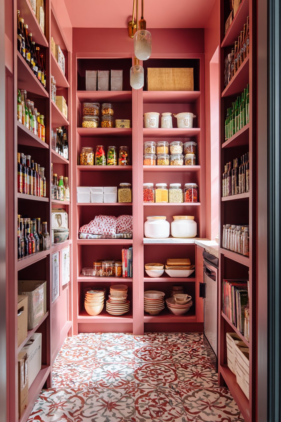 Open shelving painted in varying shades creates playful sophistication in this eclectic pantry. Terracotta, dusty rose, and cream graduate across the wall beautifully. Vintage ceramic crocks and colorful glass bottles add personality while storing staples. Patterned cement tiles on the floor provide visual interest and durability.