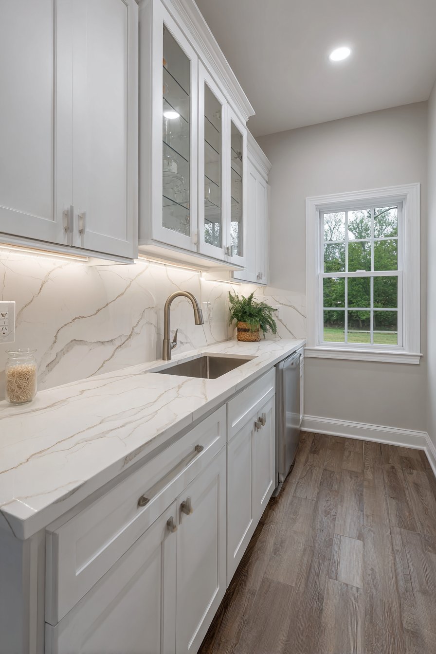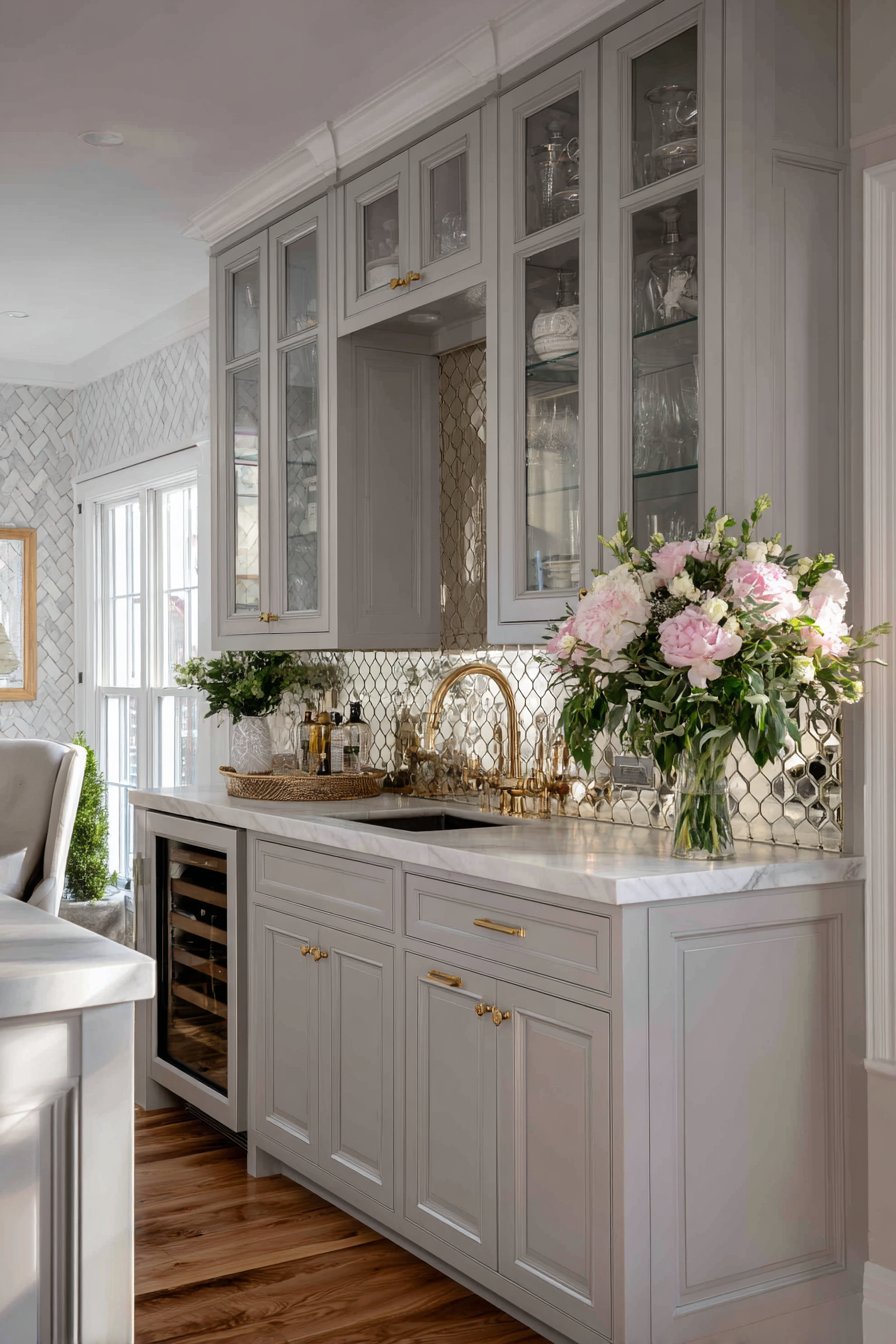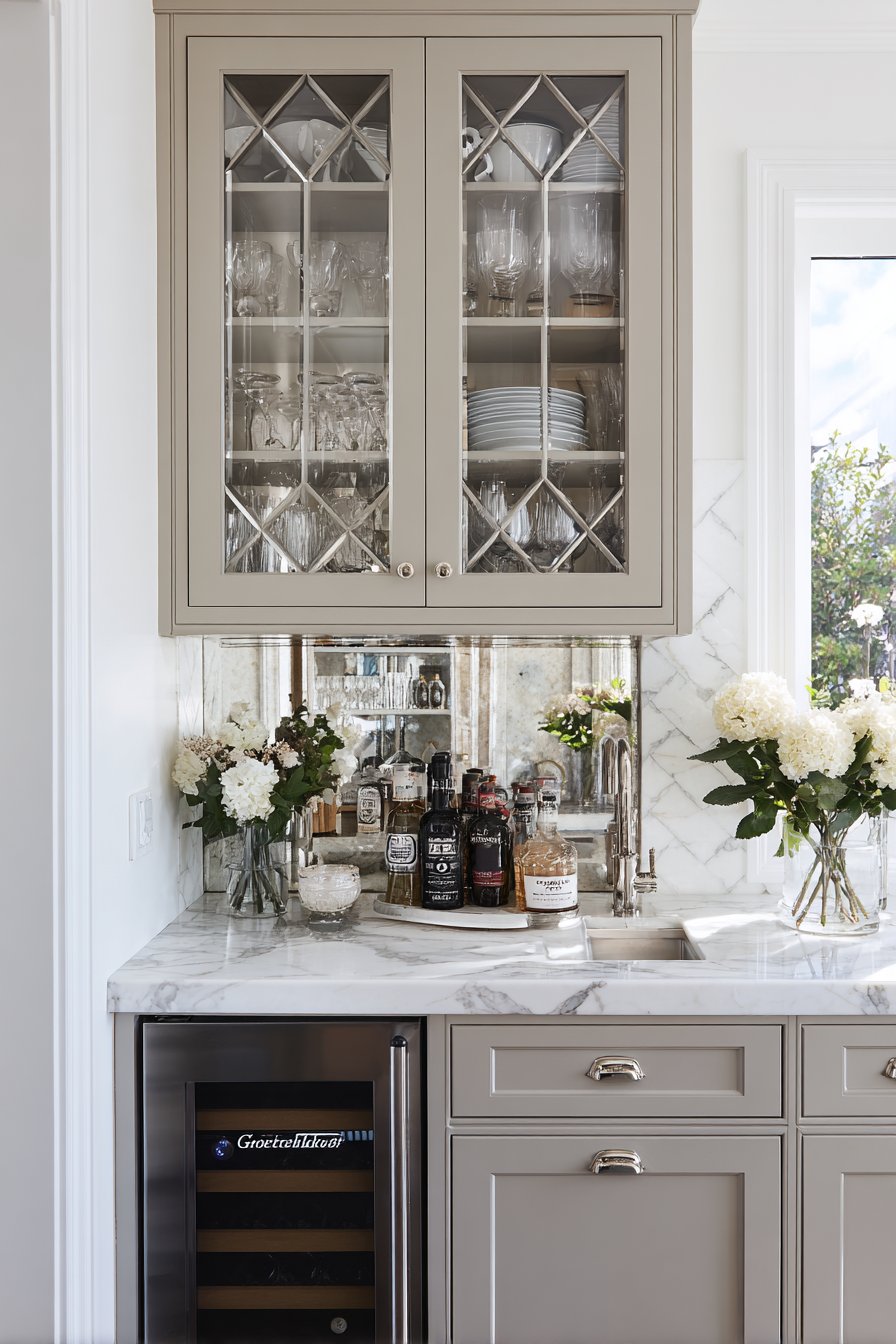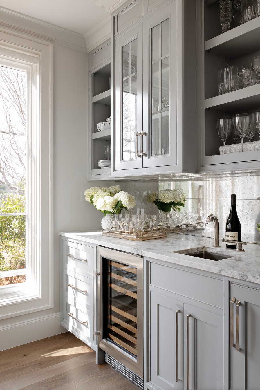 The butler’s pantry serves dual purposes of storage and entertaining preparation. This transitional space between kitchen and dining room requires both beauty and function. The soft grey cabinetry provides sophisticated neutral foundation for displayed items. Marble countertop elevates beverage preparation to special occasion quality.