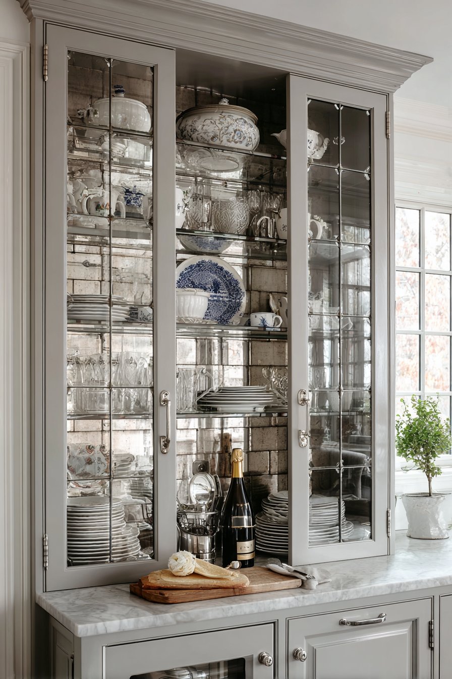 Glass-front upper cabinets display fine china and glassware in this butler’s pantry makeover. The transparent doors allow beautiful items to become decorative elements. Lower cabinets in soft grey with marble countertop provide beverage prep station. A small wine refrigerator integrates seamlessly into the cabinetry design.