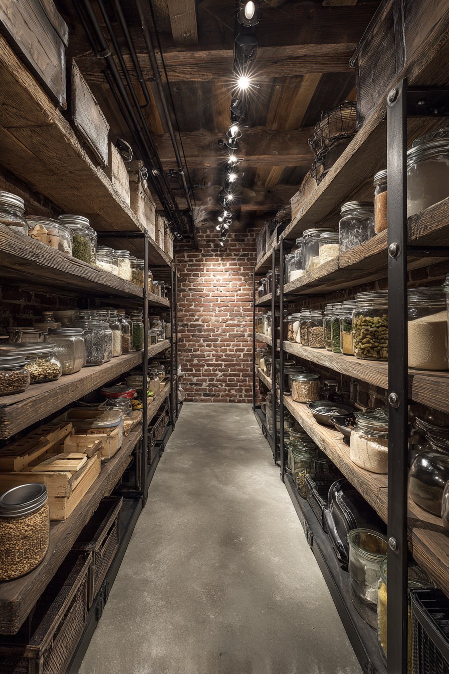 Exposed brick accent wall creates architectural drama in this rustic industrial pantry makeover. Black metal and wood shelving brackets provide sturdy support with honest material expression. Reclaimed wood shelves of varying depths accommodate different sized items and small appliances. Edison bulb track lighting on black metal rails provides adjustable task illumination.