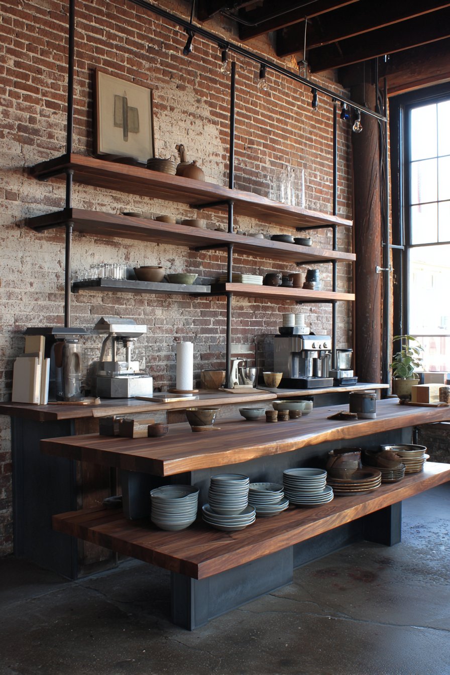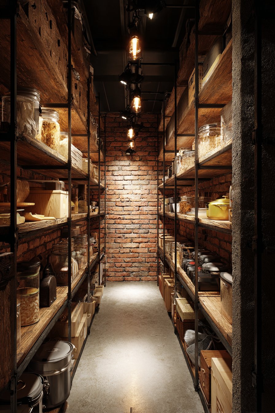 The exposed brick adds historical character and textural interest simultaneously. This architectural element grounds the industrial aesthetic in authentic building materials. Variable shelf depths demonstrate thoughtful planning for diverse storage needs. The raw materials age beautifully rather than showing wear negatively.