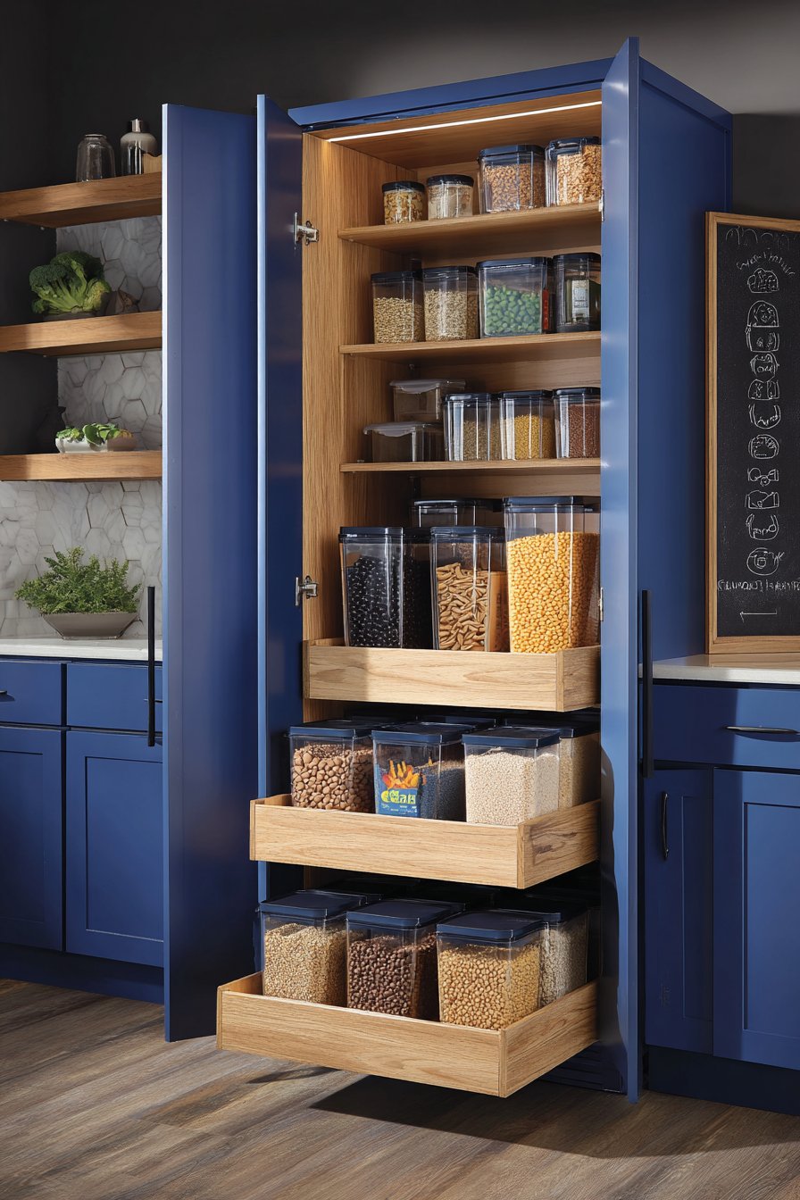 The navy blue finish creates jewel-box quality in the functional space. This rich color elevates everyday pantry activities to luxurious experiences. The handleless design maintains clean lines and contemporary minimalism throughout. Chrome accents complement the cool blue tones beautifully.