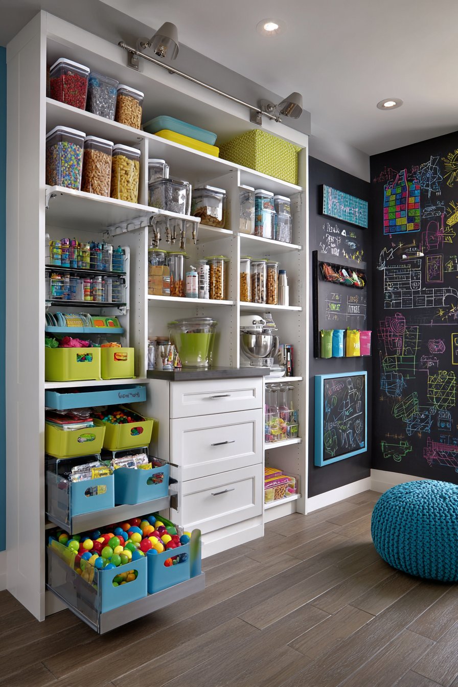 Lower shelves and pull-out drawers accessible to children promote independence in this family pantry. Colorful bins labeled with pictures and words help young children identify contents. Middle shelves hold everyday items in clear containers for easy adult access. Upper cabinets store less frequently used items and potentially hazardous materials safely.