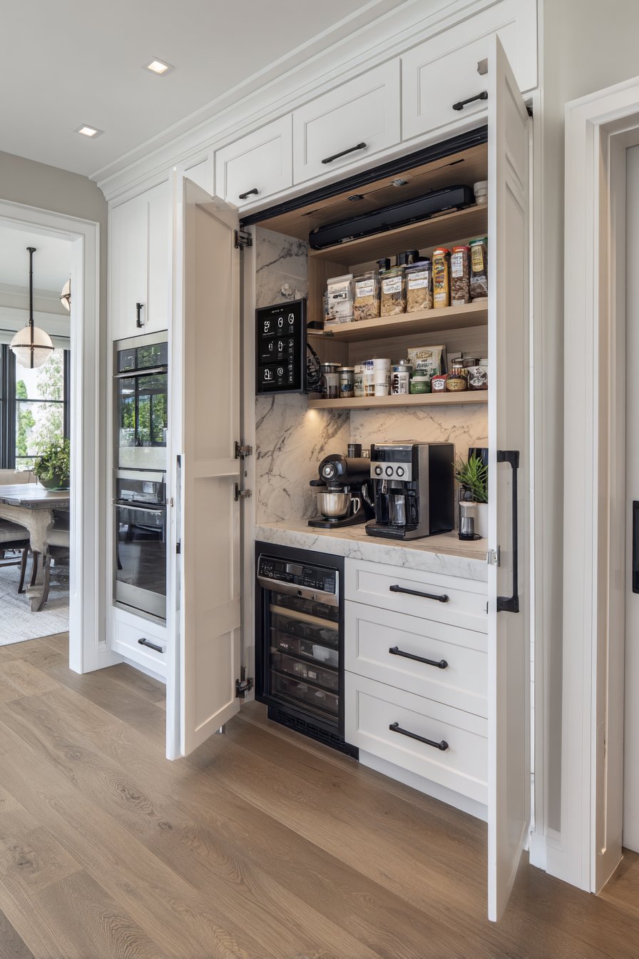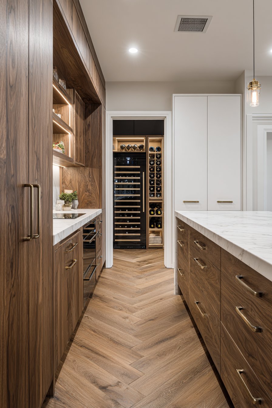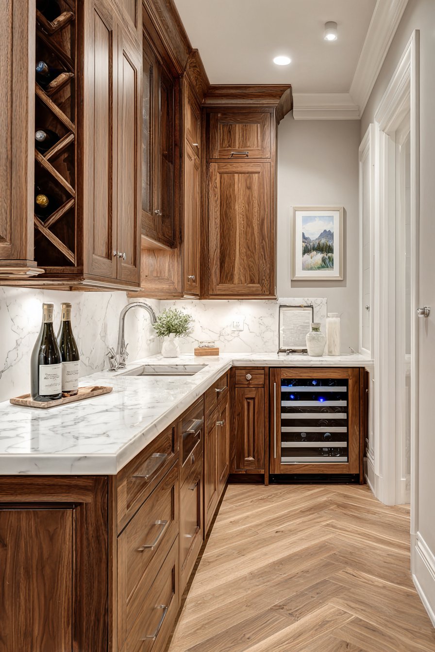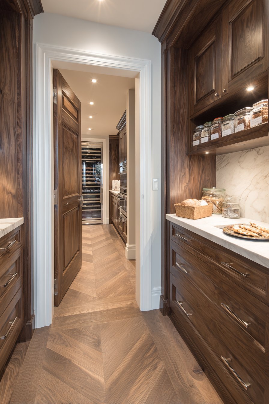Custom walnut cabinetry with soft-close mechanisms creates refined luxury in this pantry makeover. Integrated spice pull-outs keep seasonings organized and easily accessible. Countertop in honed Carrara marble provides an elegant work surface with natural veining. Climate-controlled wine storage maintains proper temperature for valuable collections.