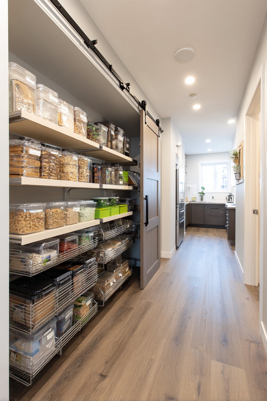 Clear acrylic containers create visual consistency across all shelves. This uniformity makes finding ingredients effortless during busy cooking sessions. The shaker-style doors add architectural interest without overwhelming the space. Wide-angle interior views showcase the complete pantry depth with balanced exposure.
