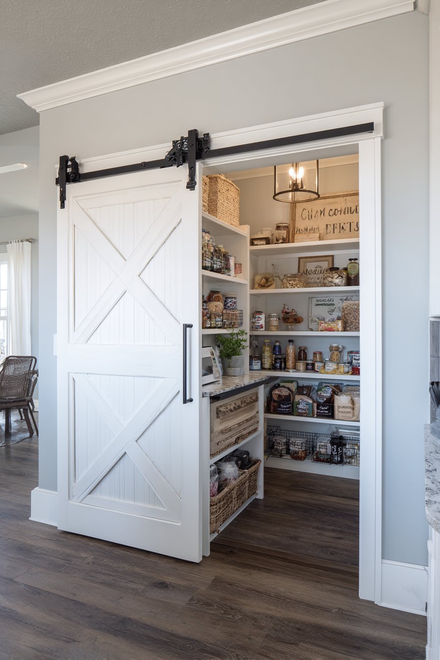 Sliding barn door hardware in black finish saves valuable swing clearance in this narrow pantry. The space-saving solution adds architectural interest to challenging dimensions. Shallow depth shelving on both walls maximizes storage without creating reach problems. Pull-out vertical storage racks hold cutting boards and baking sheets efficiently.