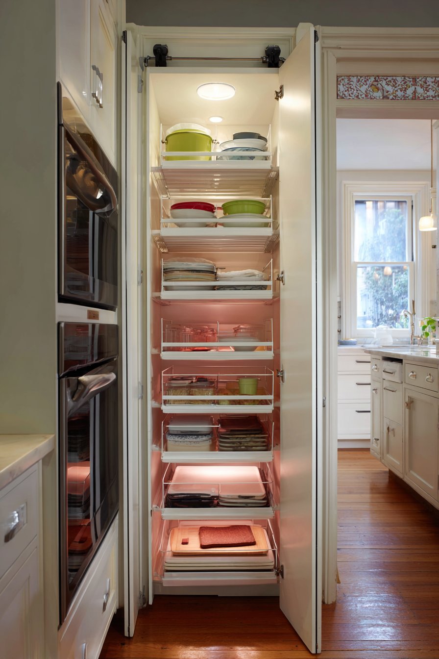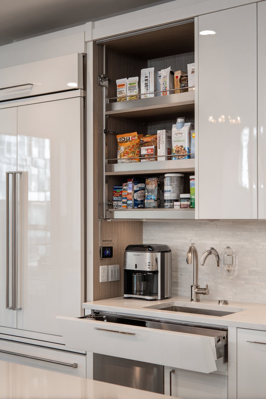 - Add motorized pull-down shelving for accessible upper storage retrieval