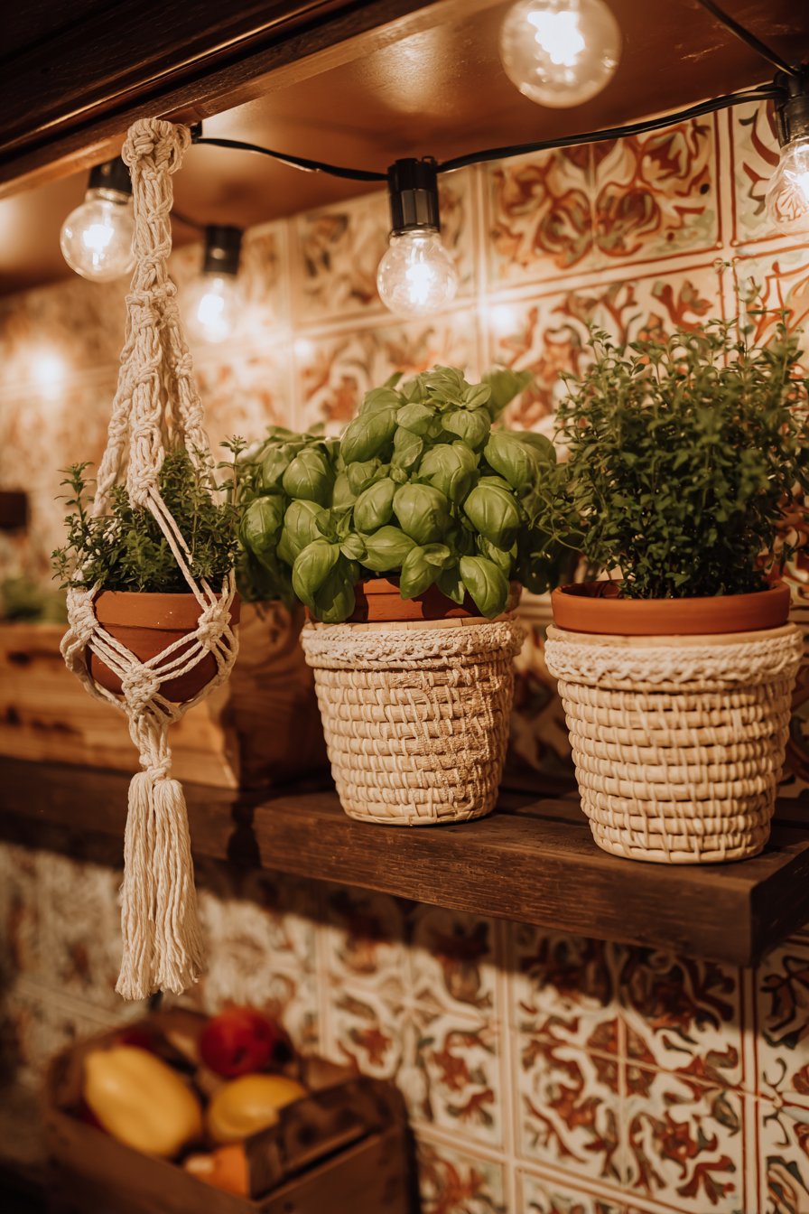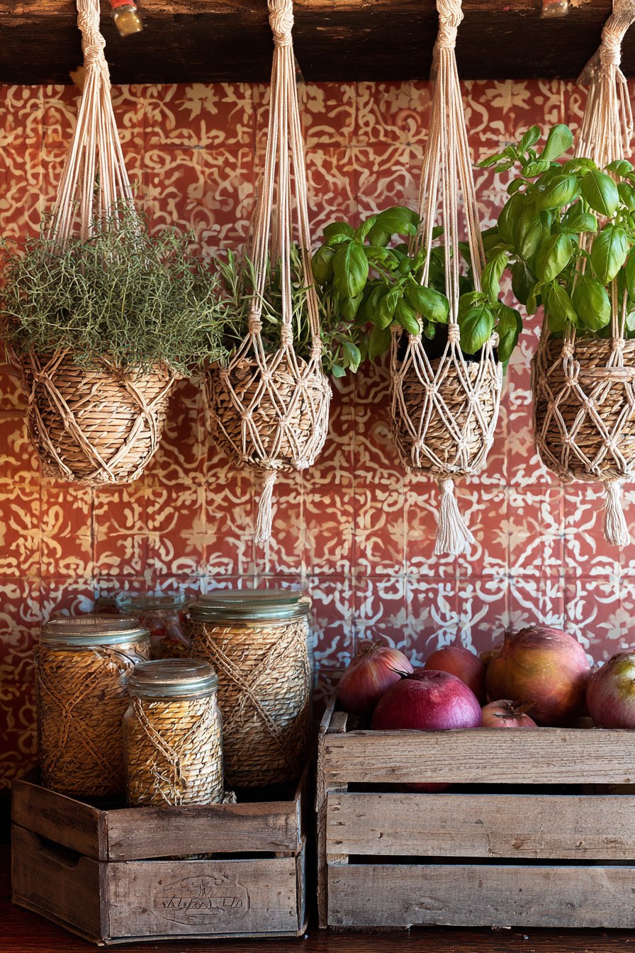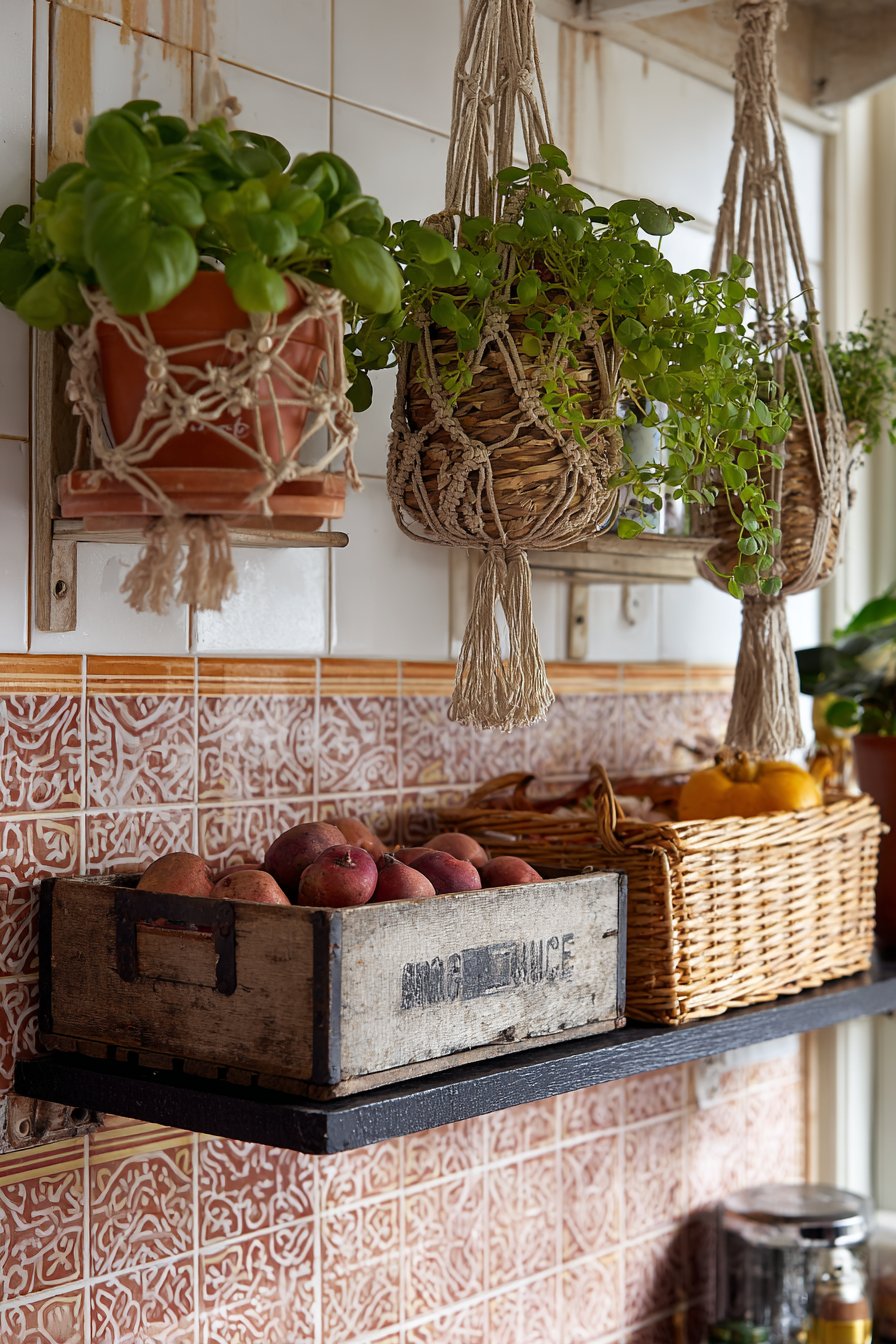 - Add macramé hanging planters with fresh herbs for function and bohemian style