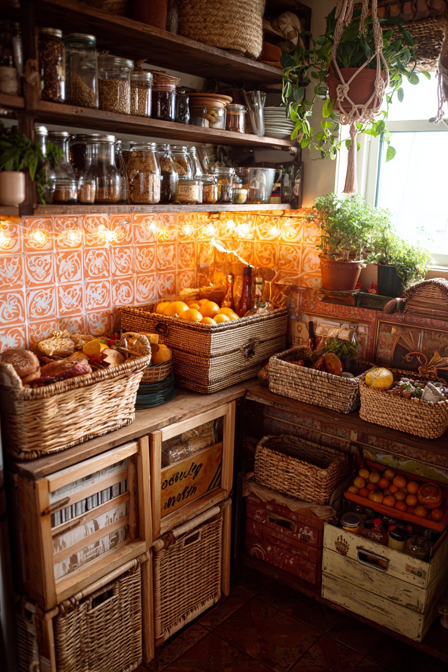 Open shelving with macramé hanging planters creates bohemian character in this unique pantry. Fresh herbs grow within arm’s reach for cooking convenience and visual interest. Woven rattan baskets in various sizes organize dry goods and snacks naturally. Patterned tile backsplash in warm terracotta and cream adds visual excitement.