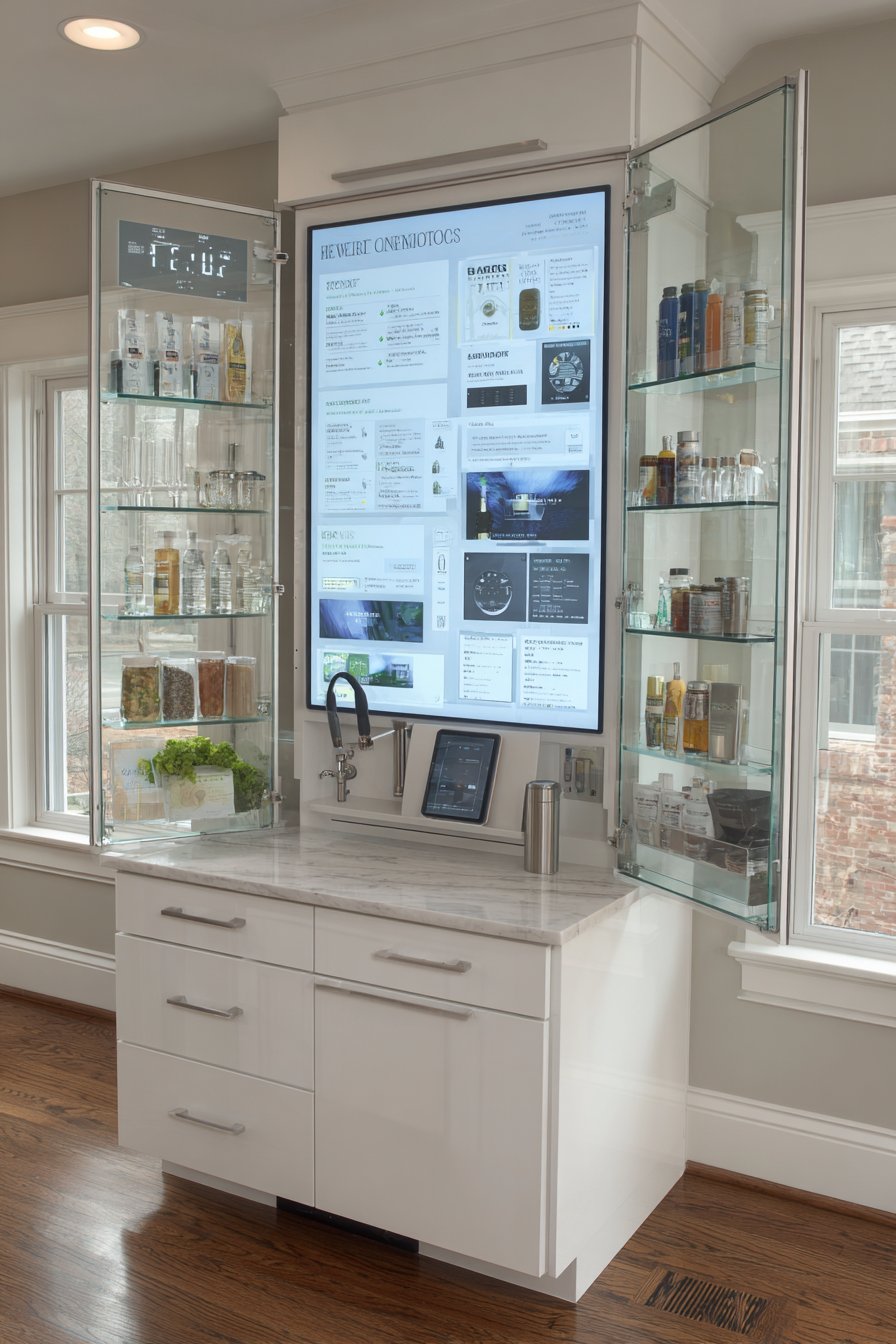 Inventory tracking system with digital displays shows expiration dates in this innovative smart pantry. The technology reduces food waste through automated monitoring and alerts. Motorized pull-down shelving brings upper storage to counter height with button activation. Integrated USB charging station keeps recipe-viewing devices powered and accessible.