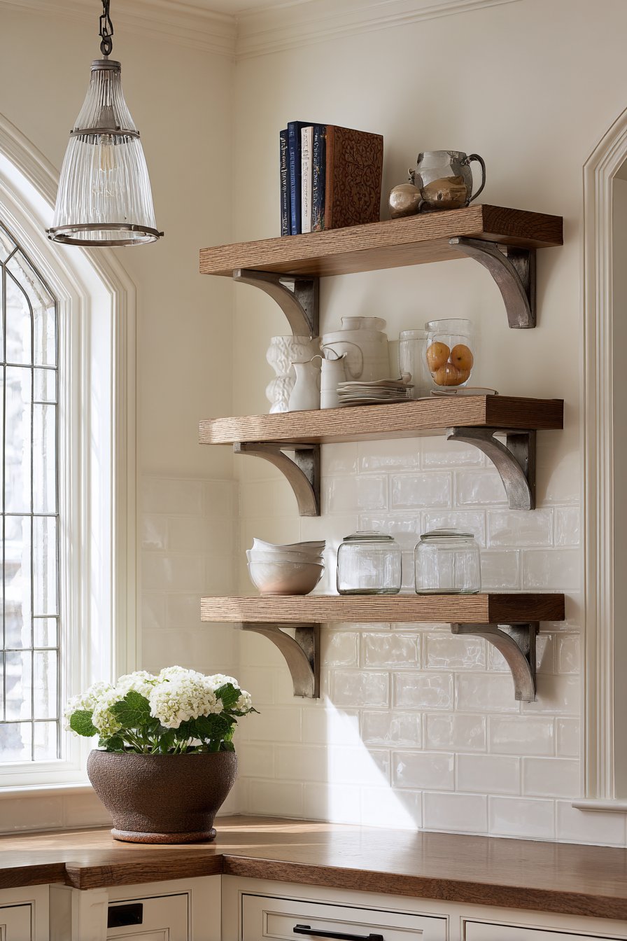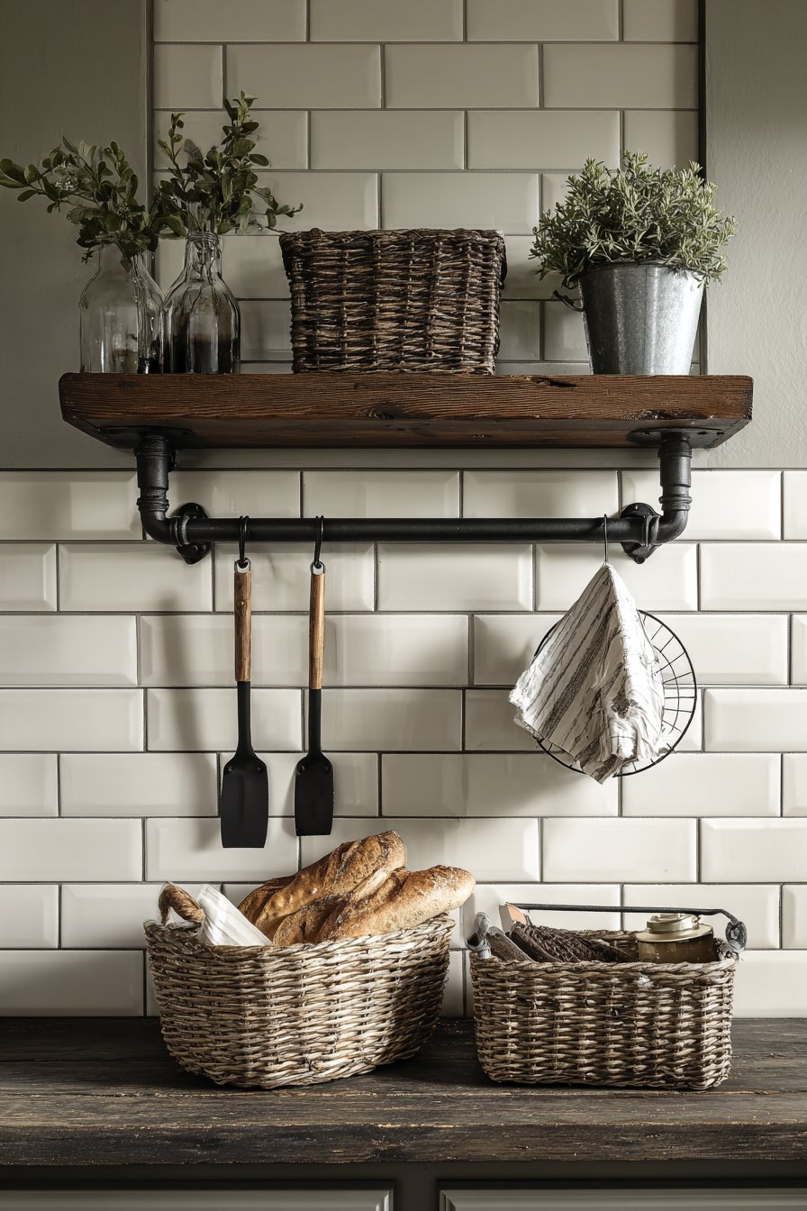 Peel-and-stick subway tile backsplash protects the wall behind shelves. This budget-friendly solution delivers high-end appearance without professional installation costs. Natural daylight photography emphasizes the authentic material combinations and practical storage solutions. The DIY aesthetic proves that beautiful design doesn’t require unlimited budgets.