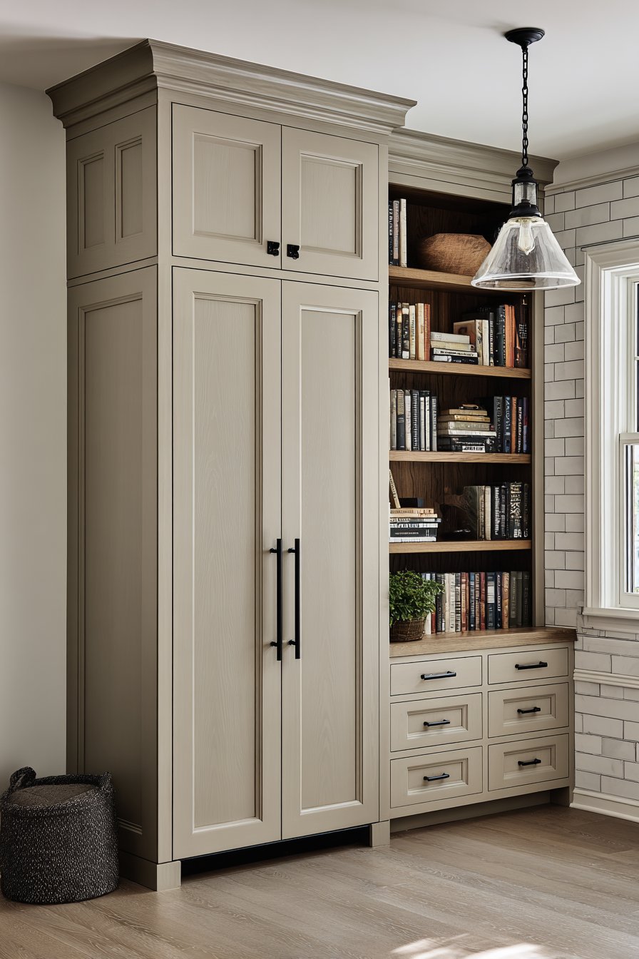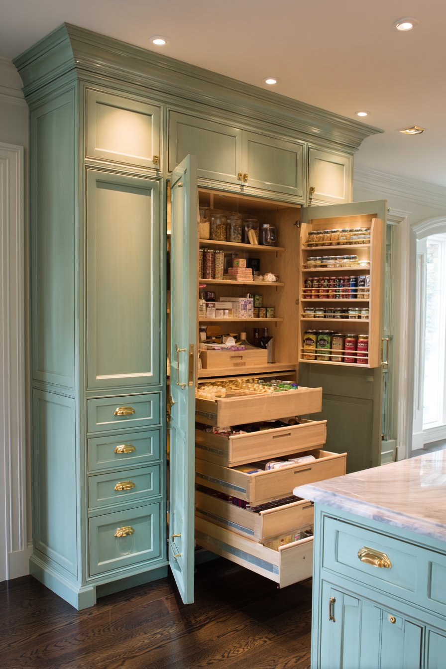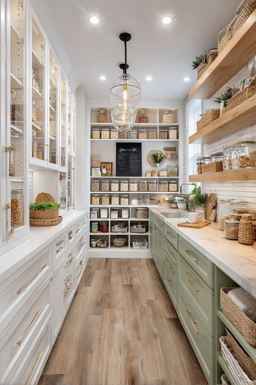 The sage green color brings natural calm to the functional space. This sophisticated hue works equally well in traditional and contemporary homes. The brass hardware elevates the design beyond standard pantry expectations. Every detail demonstrates thoughtful consideration of both form and function.