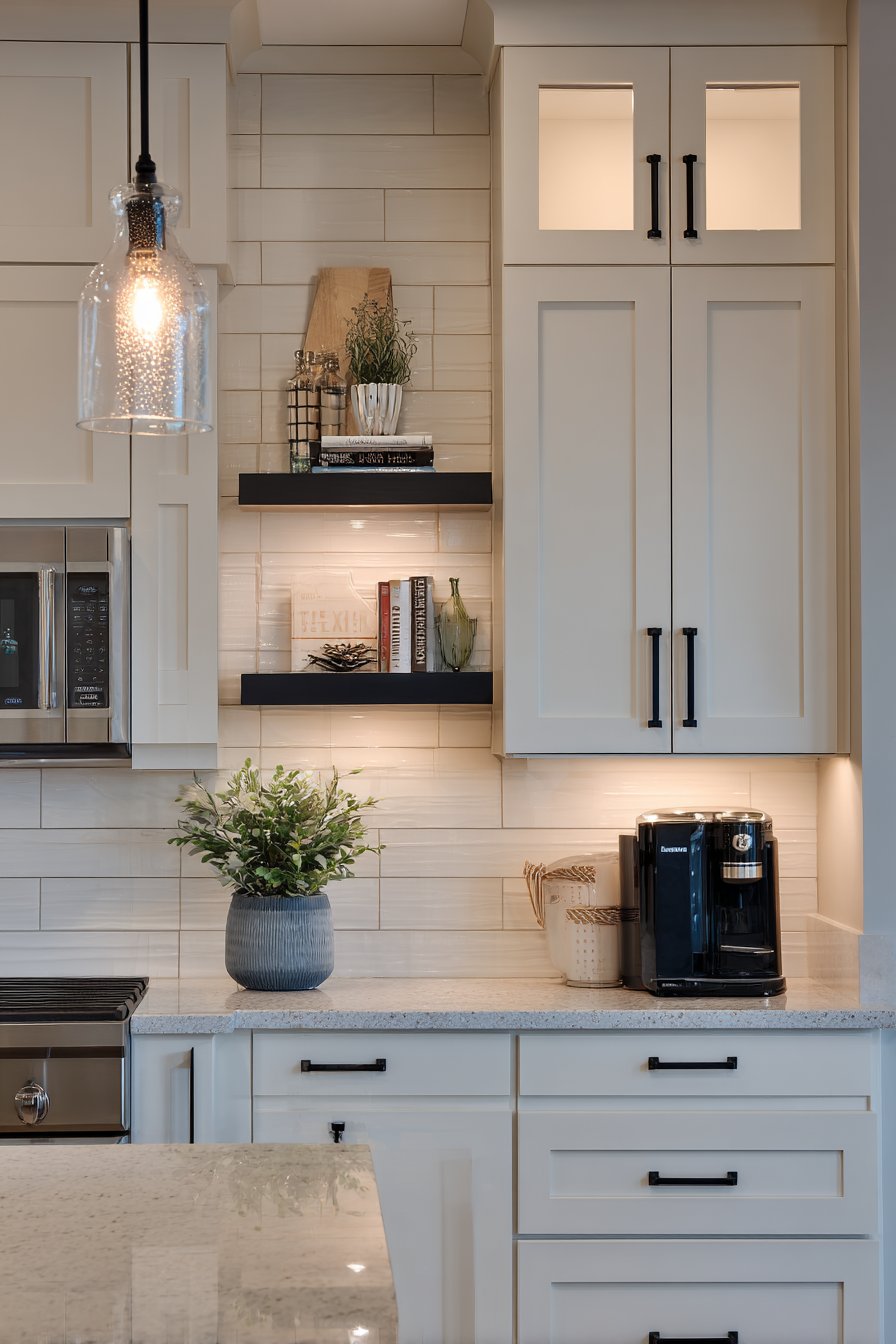 Shaker-style cabinets in soft greige blend traditional and contemporary elements beautifully. Modern matte black hardware provides unexpected contrast against classic door profiles. Open shelving section with decorative brackets displays attractive storage pieces and cookbooks. Subway tile backsplash in classic white with dark grout offers timeless appeal.