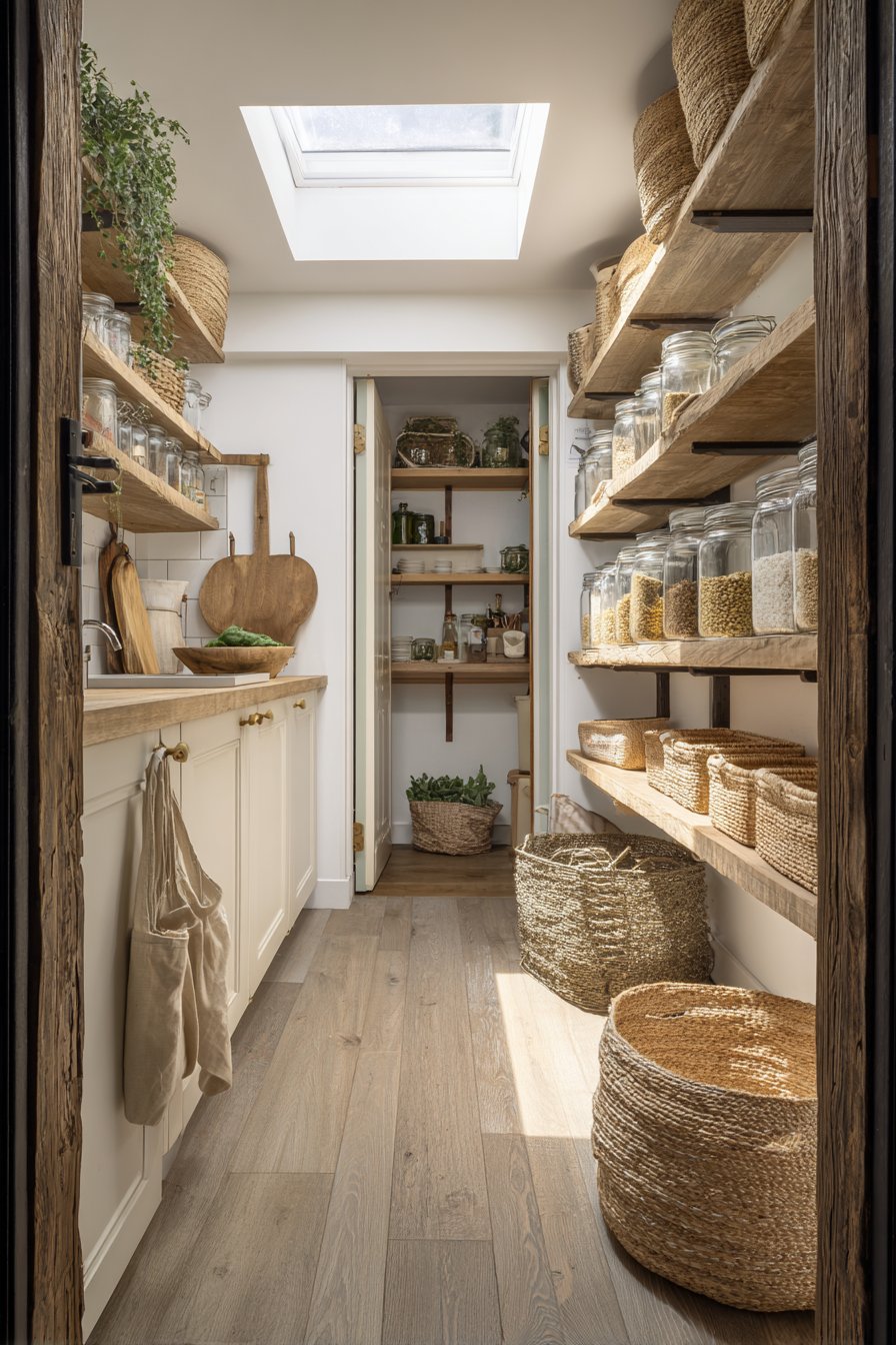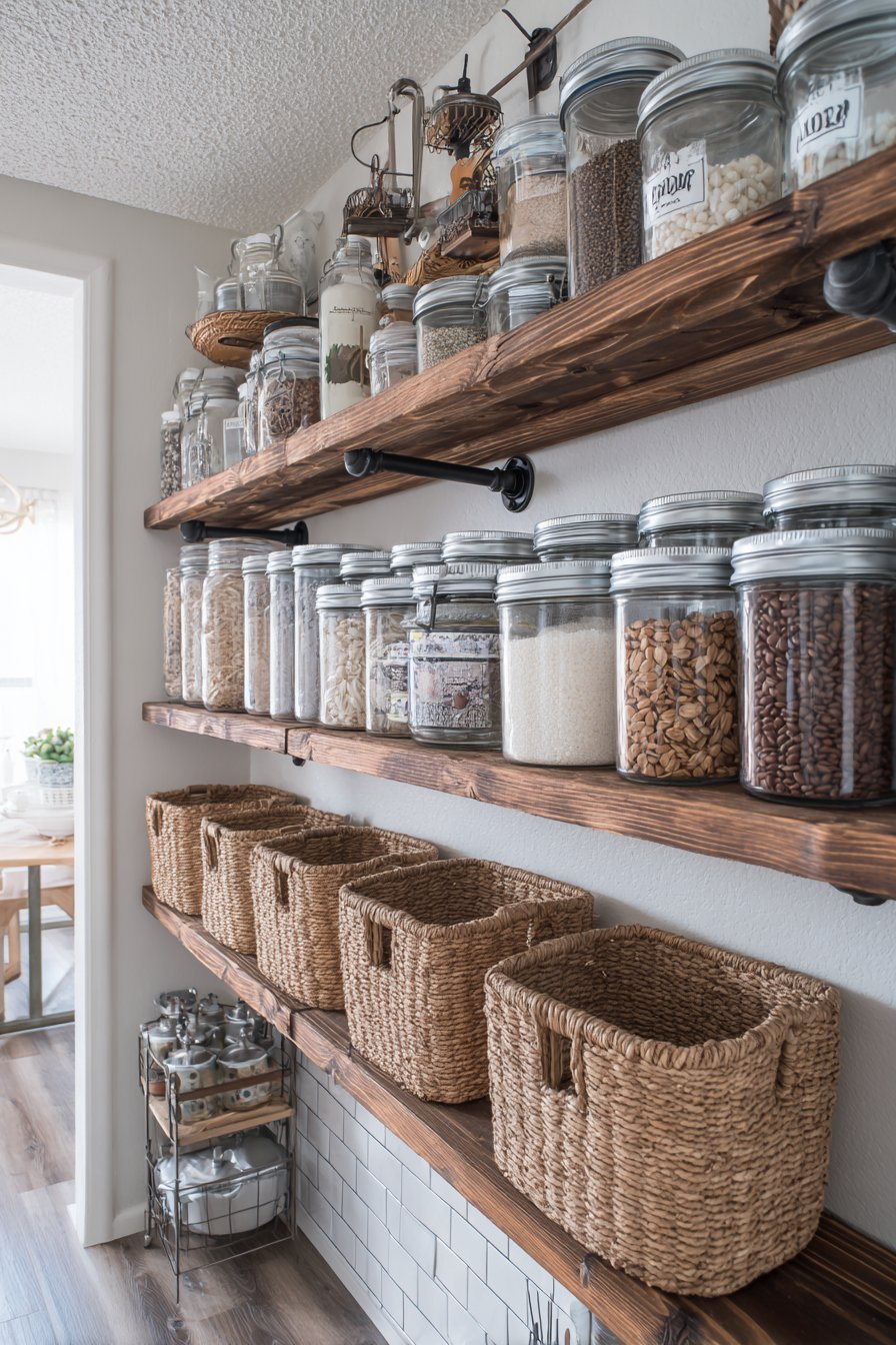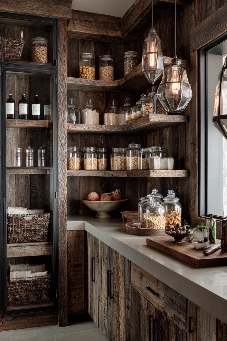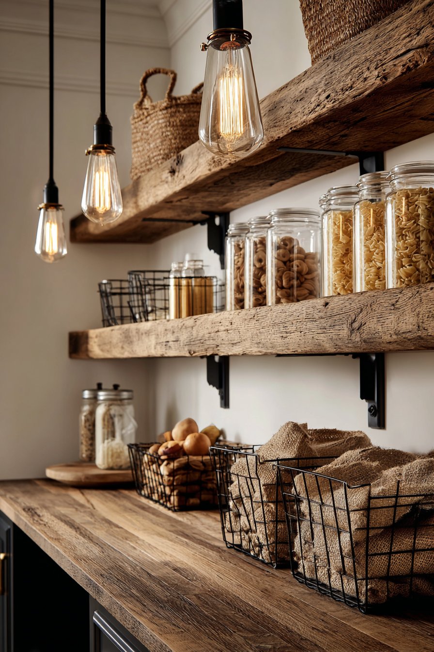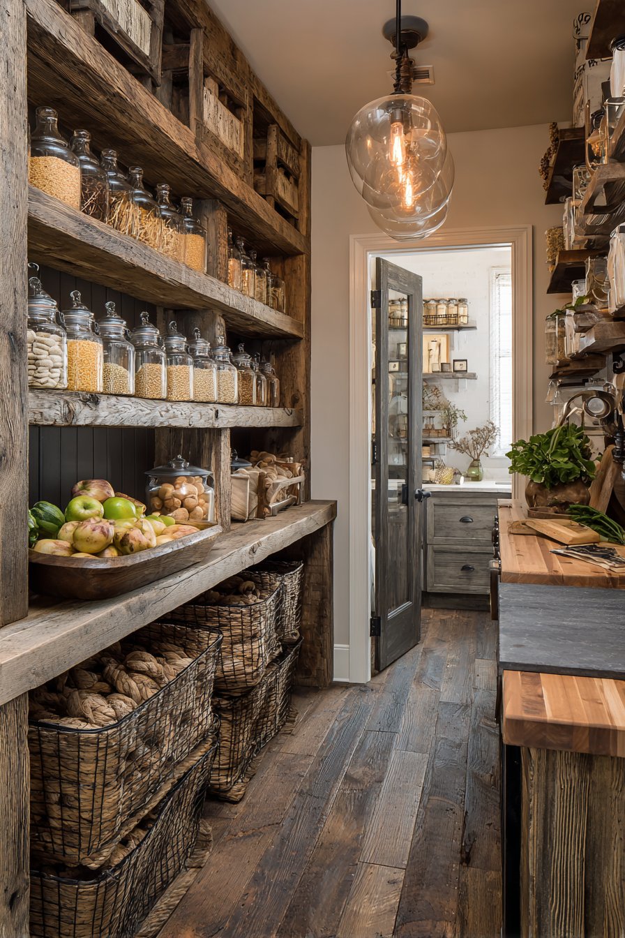 Reclaimed barnwood shelving brings authentic character to this farmhouse-inspired pantry makeover. The natural grain variations and weathered patina tell stories of previous lives. Vintage-style wire baskets hold fresh produce while maintaining air circulation. Glass apothecary jars display dried goods and pasta with nostalgic charm.