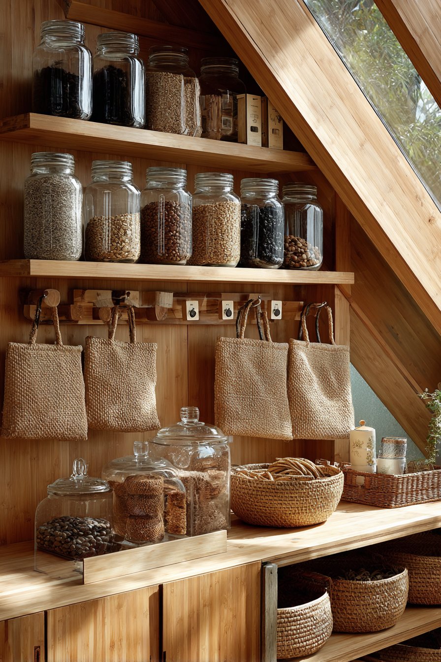 Shelving made from FSC-certified bamboo demonstrates a commitment to renewable materials. This fast-growing grass provides beautiful durable alternative to traditional hardwoods. Reusable produce bags hang from hooks for shopping trip readiness. Natural fiber baskets organize items while avoiding plastic storage solutions.