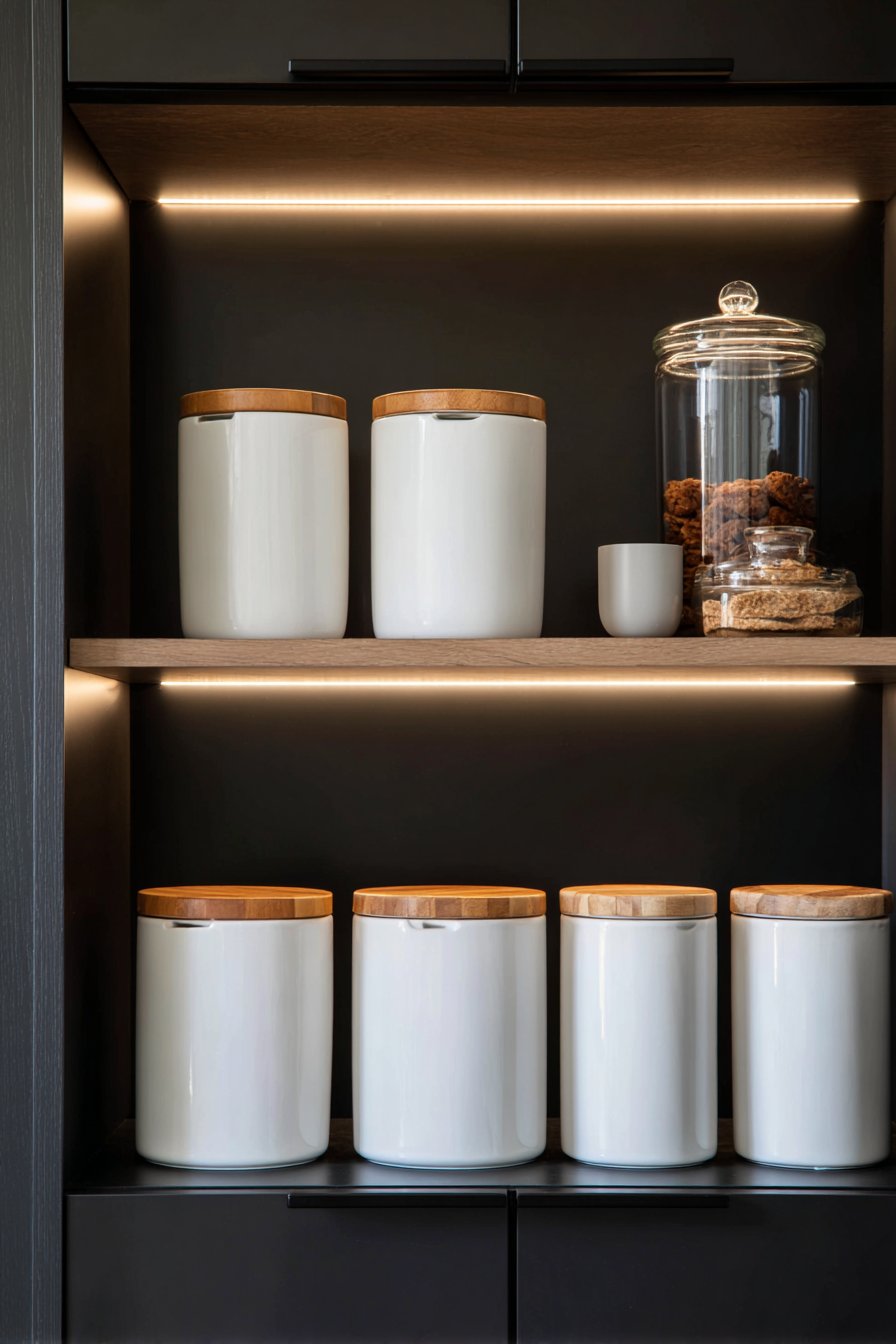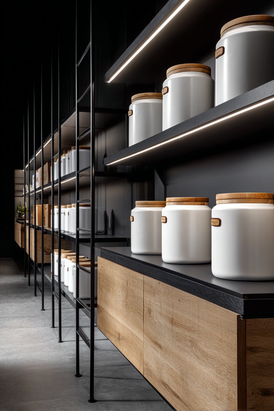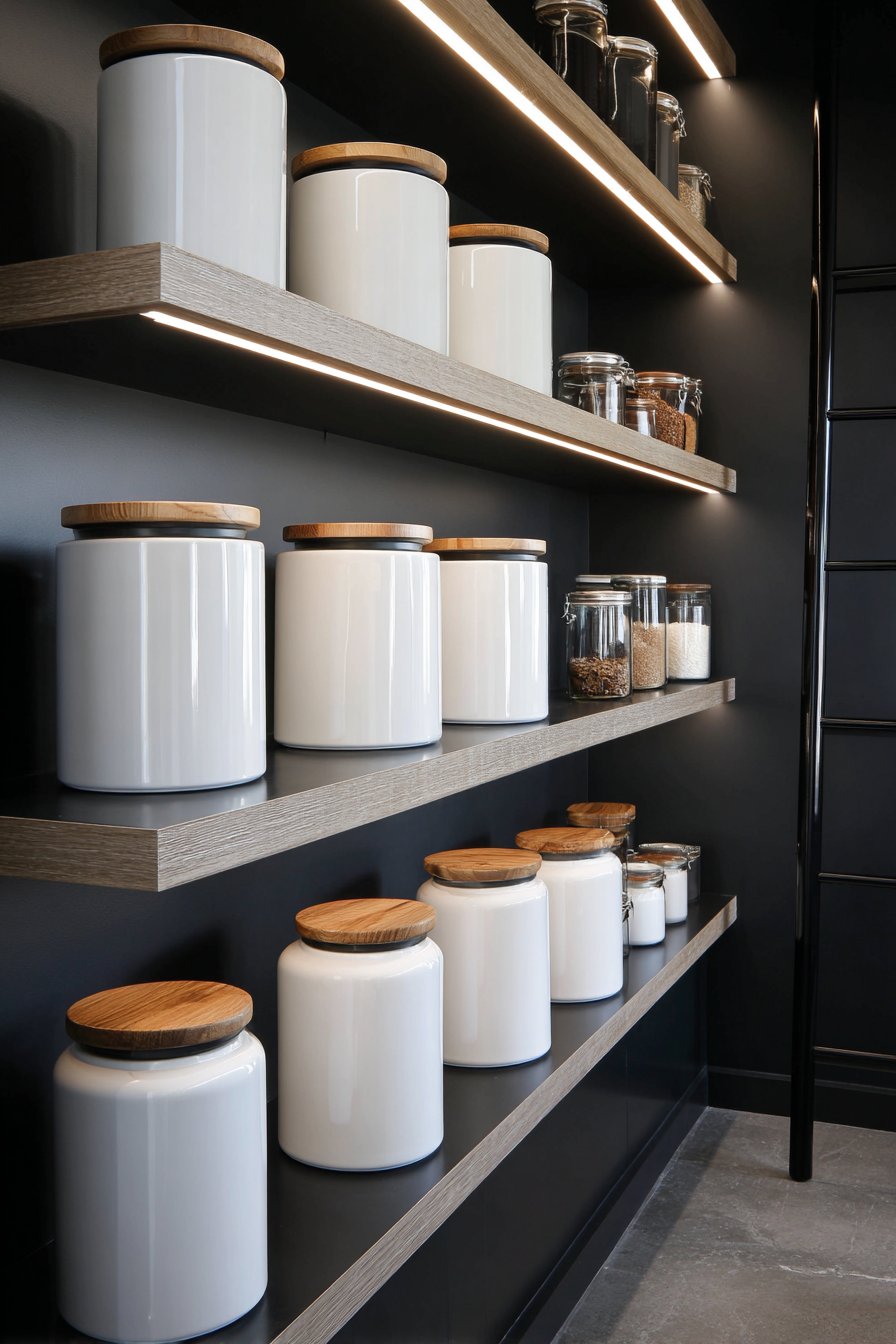 Custom matte black shelving systems create dramatic impact in this modern minimalist pantry. Integrated LED strip lighting underneath each shelf provides functional illumination. The clean lines and dark finish establish contemporary sophistication. Uniform white ceramic canisters with wooden lids maintain visual consistency while storing dry goods.