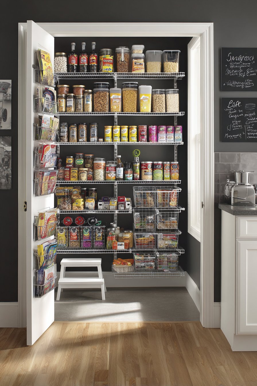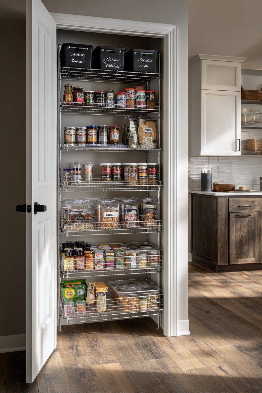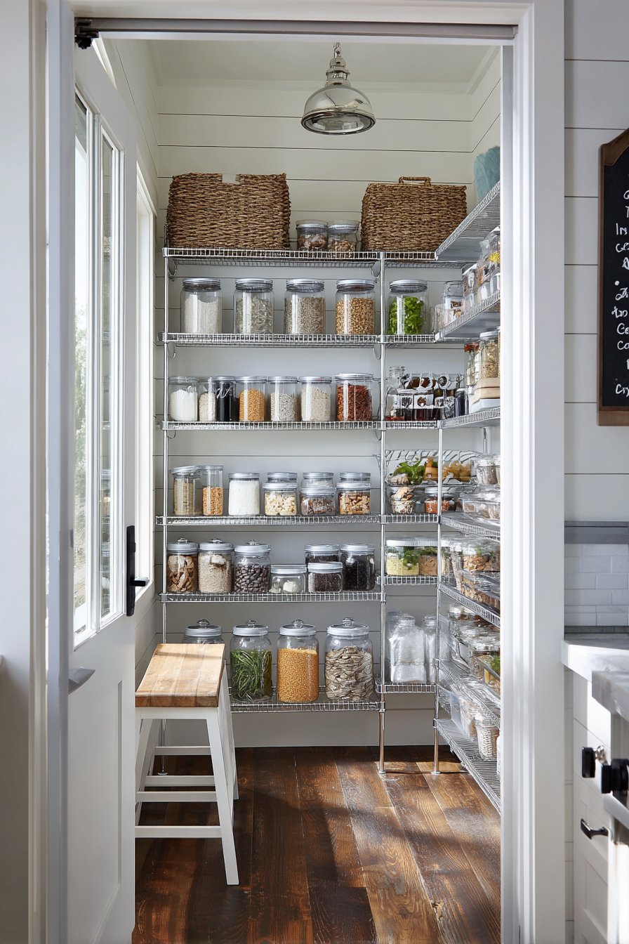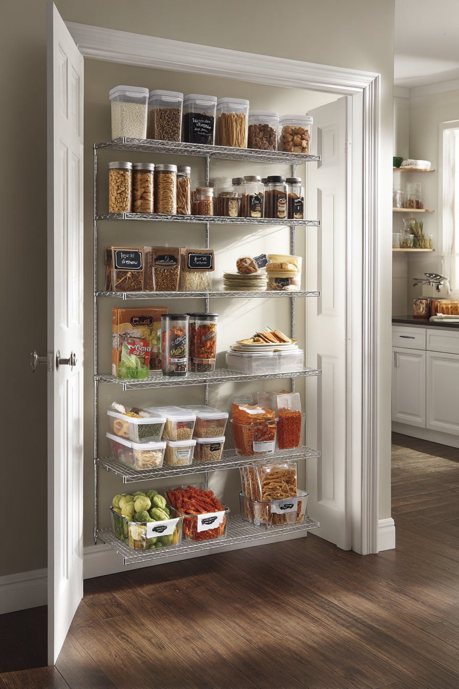 Adjustable wire shelving in chrome finish reaches the ceiling in this small pantry makeover. The vertical approach maximizes every inch of limited square footage. Clear stackable storage bins with chalkboard labels organize items by category. This system makes inventory management simple and efficient despite space constraints.